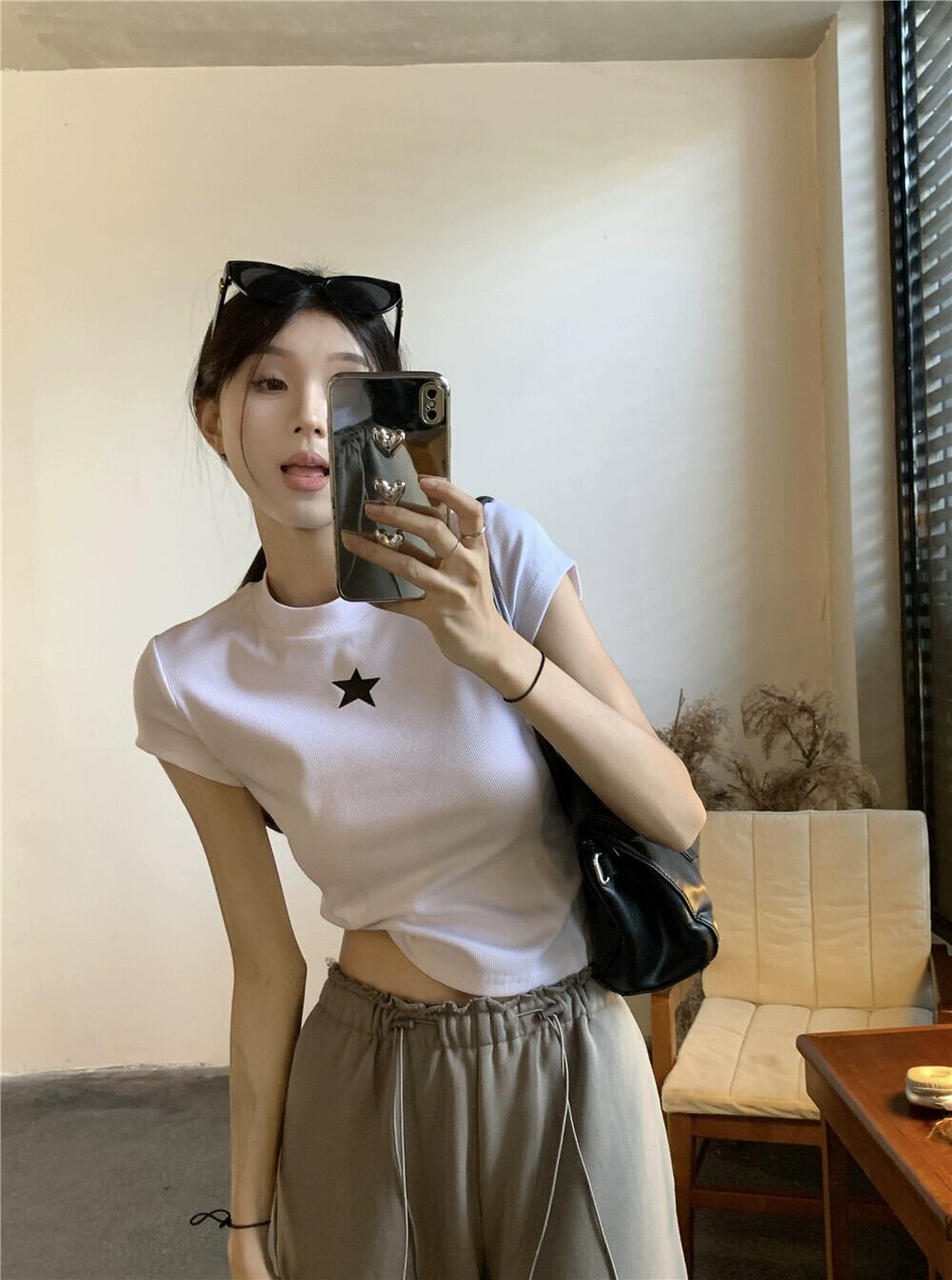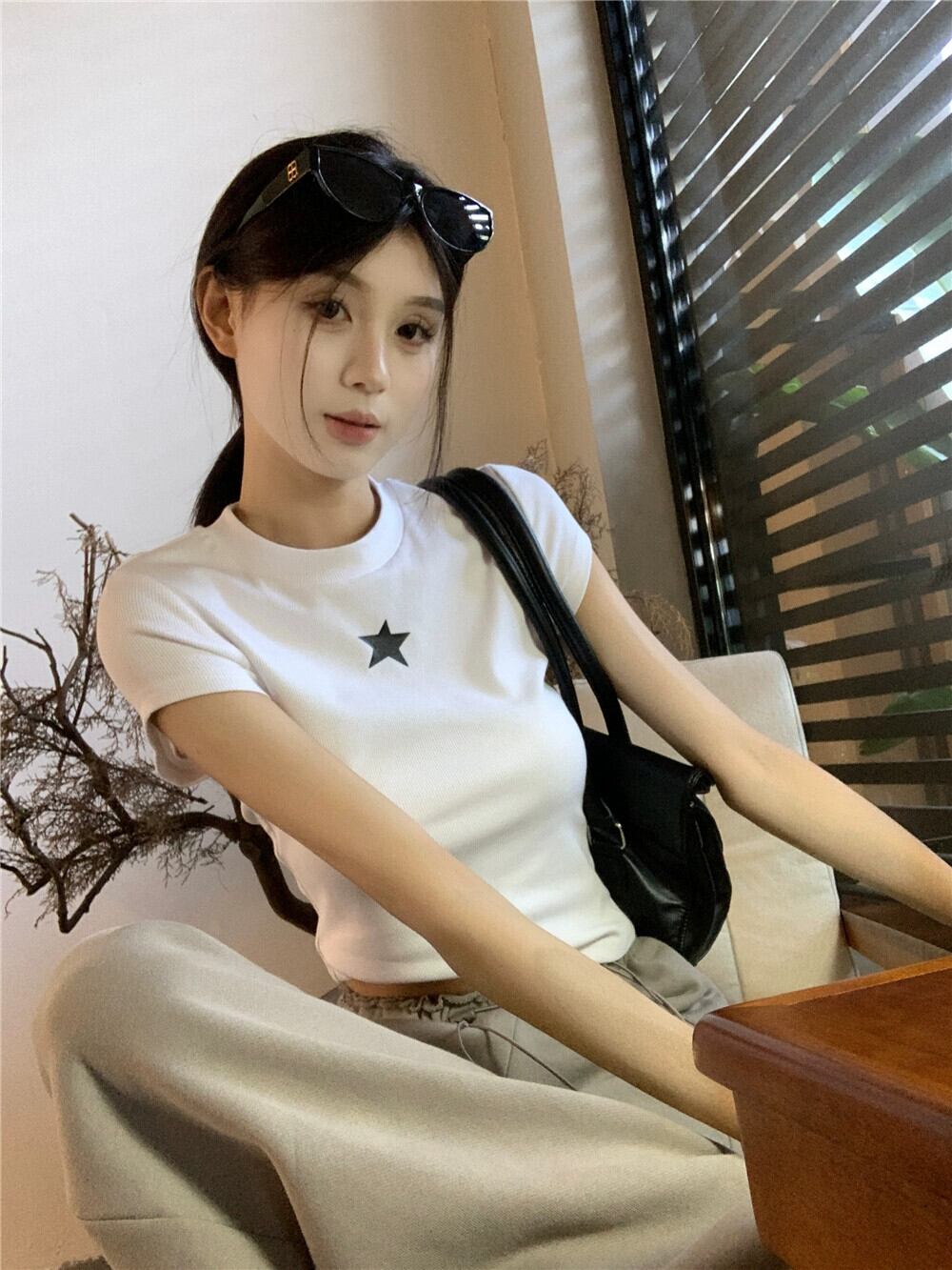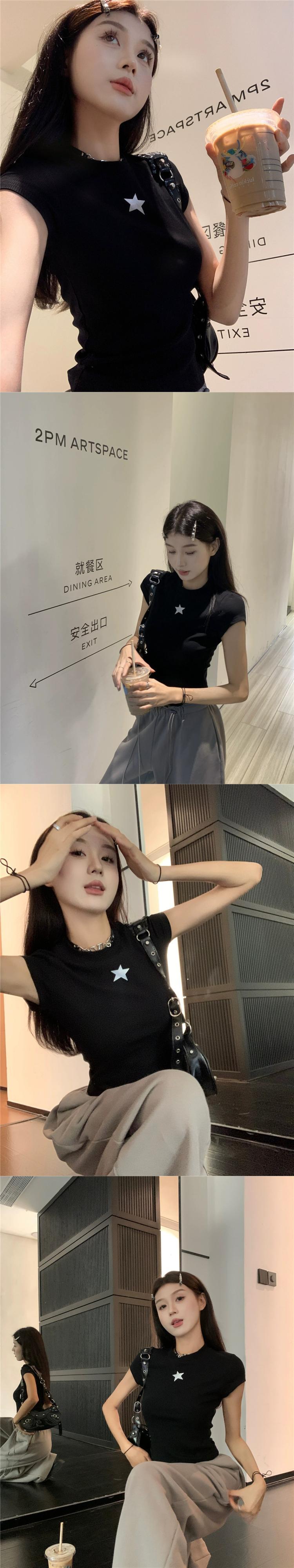 ホワイトフロントショルダー半袖Tシャツレディース夏アメリカンレトロスタープリントスリムフィットショートトップ サマー 夏物 857162776988849