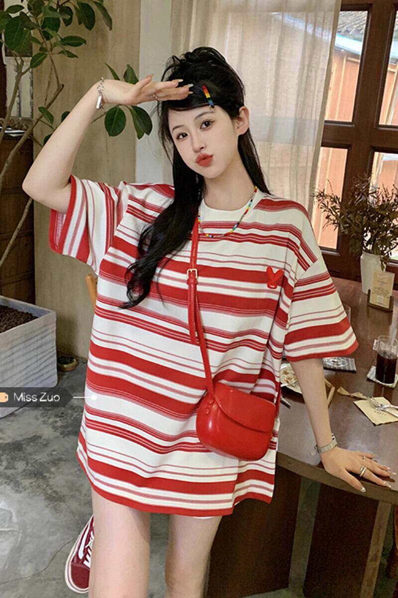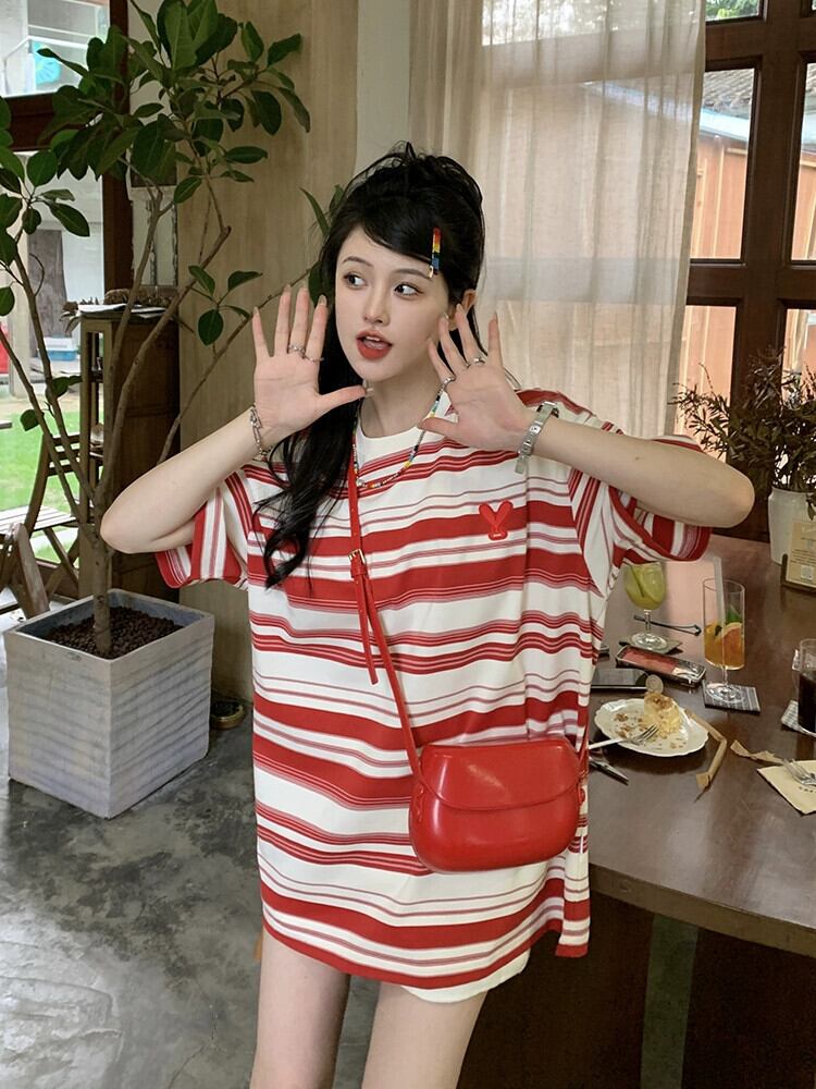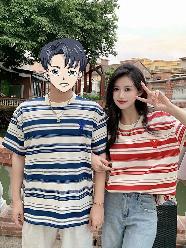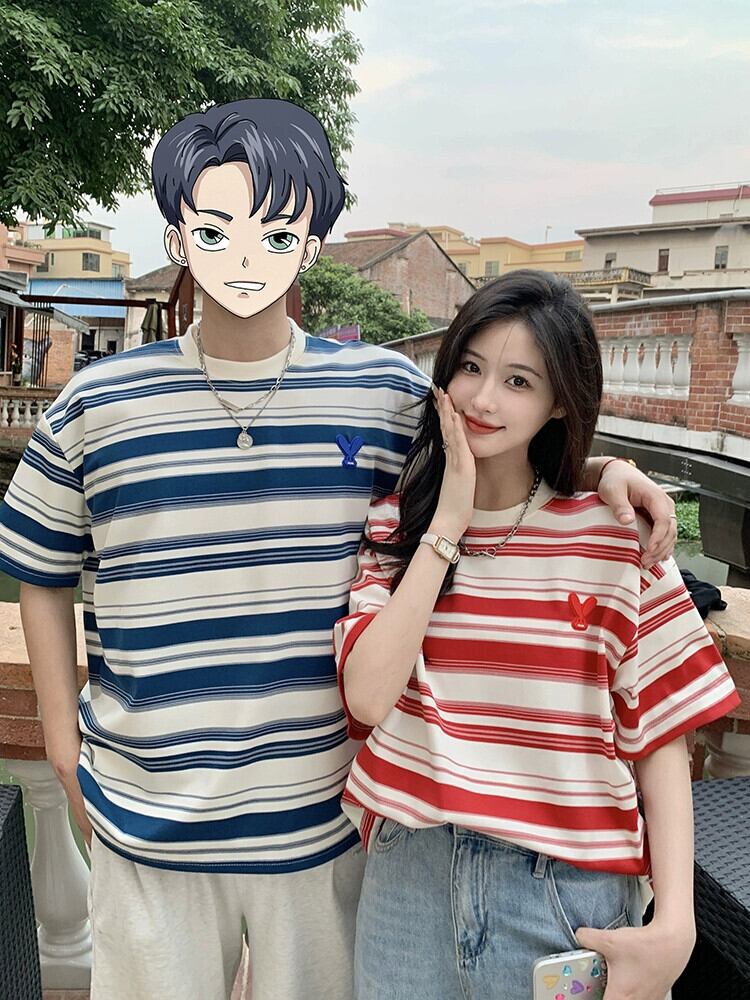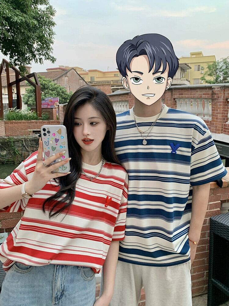 カップル着用ストライプ半袖 T シャツの女性の夏の新しいアメリカン スタイルのレトロな緩い怠惰なトレンディなブランドのミッドレングス トップ サマー 夏物 Tシャツ 8571689519776383