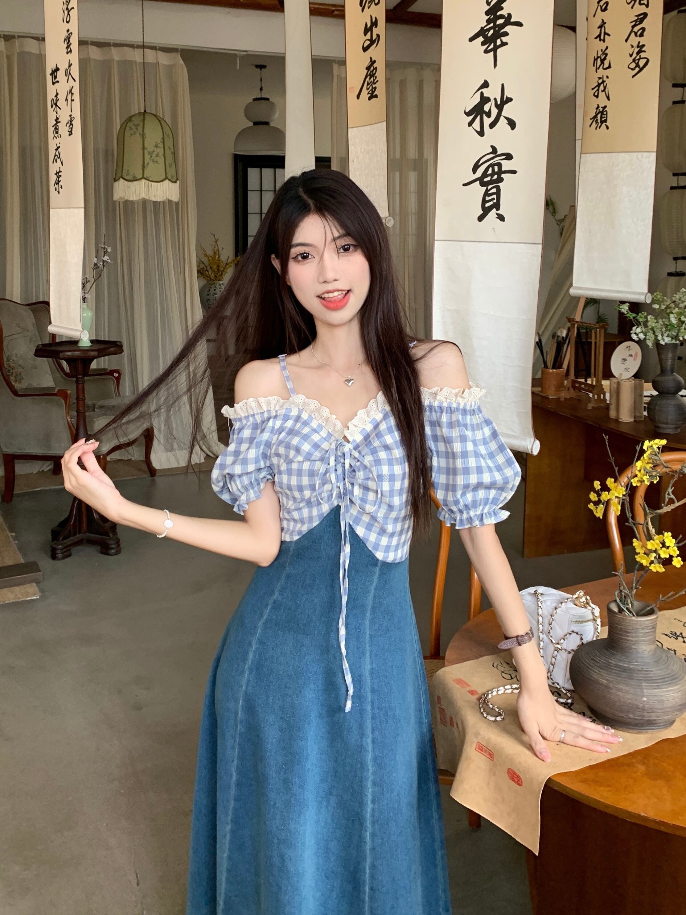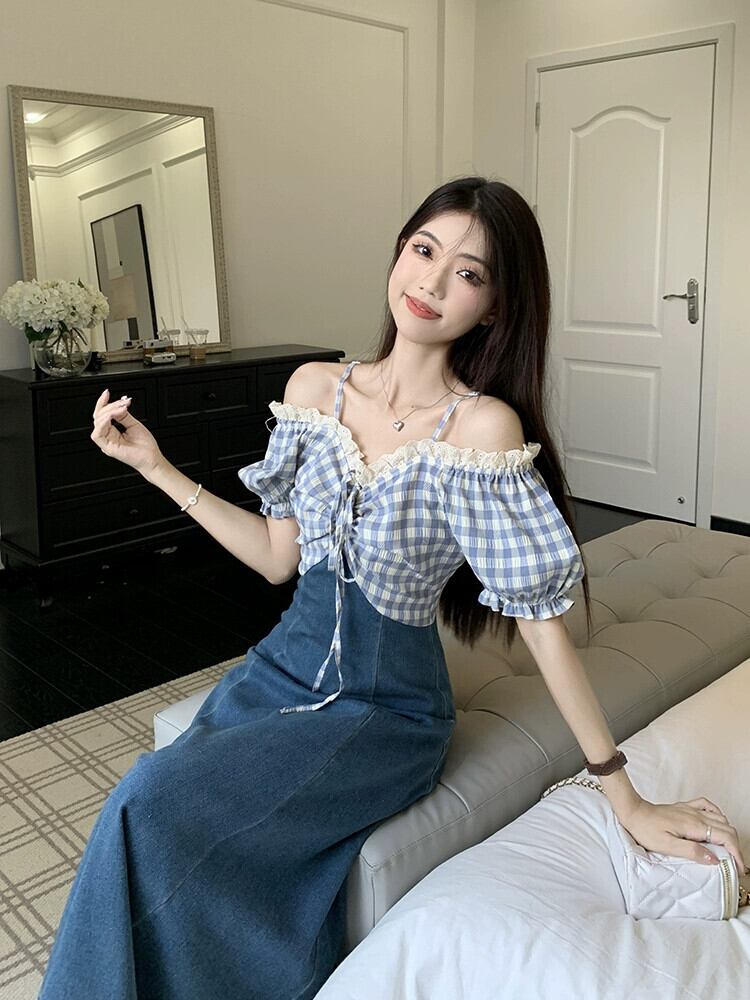 フェイクツーピースステッチデニムドレスレディース夏甘くて優しいスタイルのデザインセンスワンショルダーパフスリーブロングスカート 大人ガーリー スウィート キュート カジュアル サマー 夏物 8571676130233452