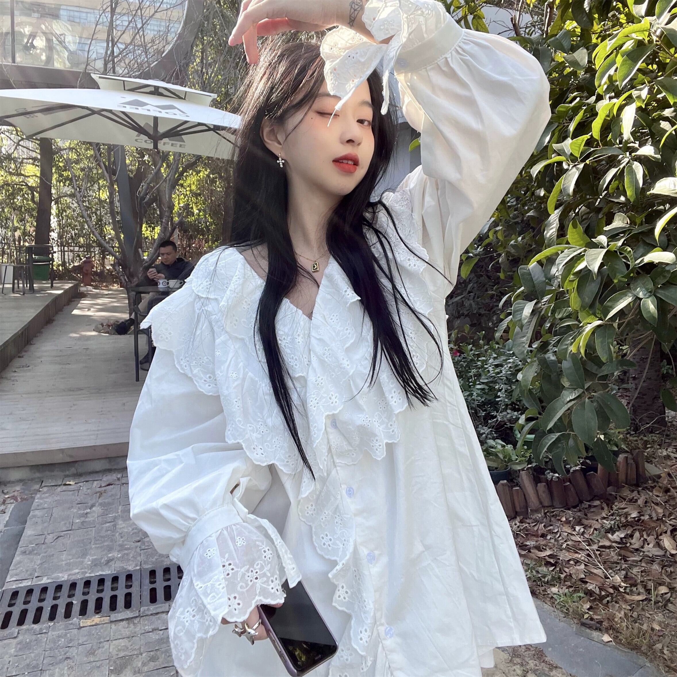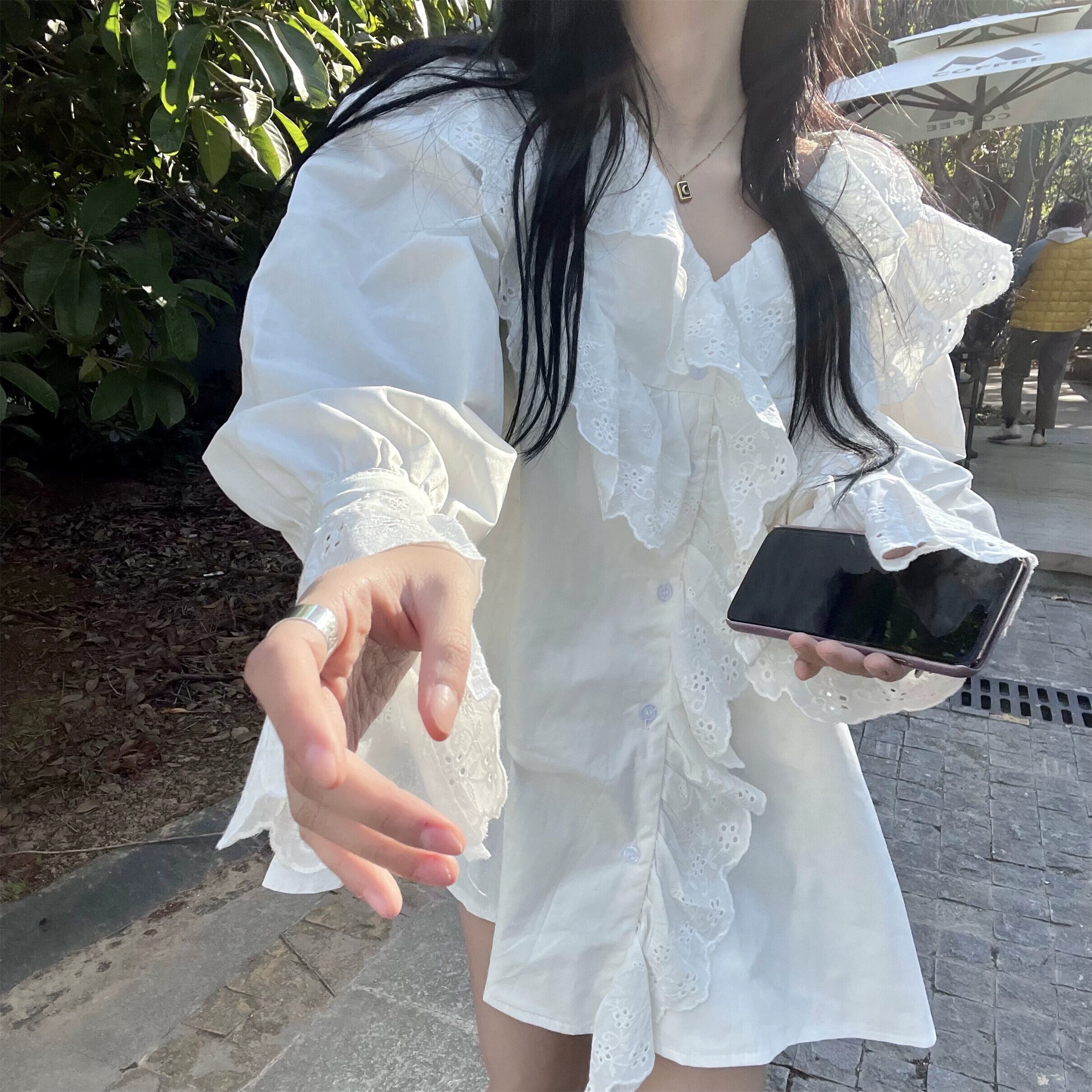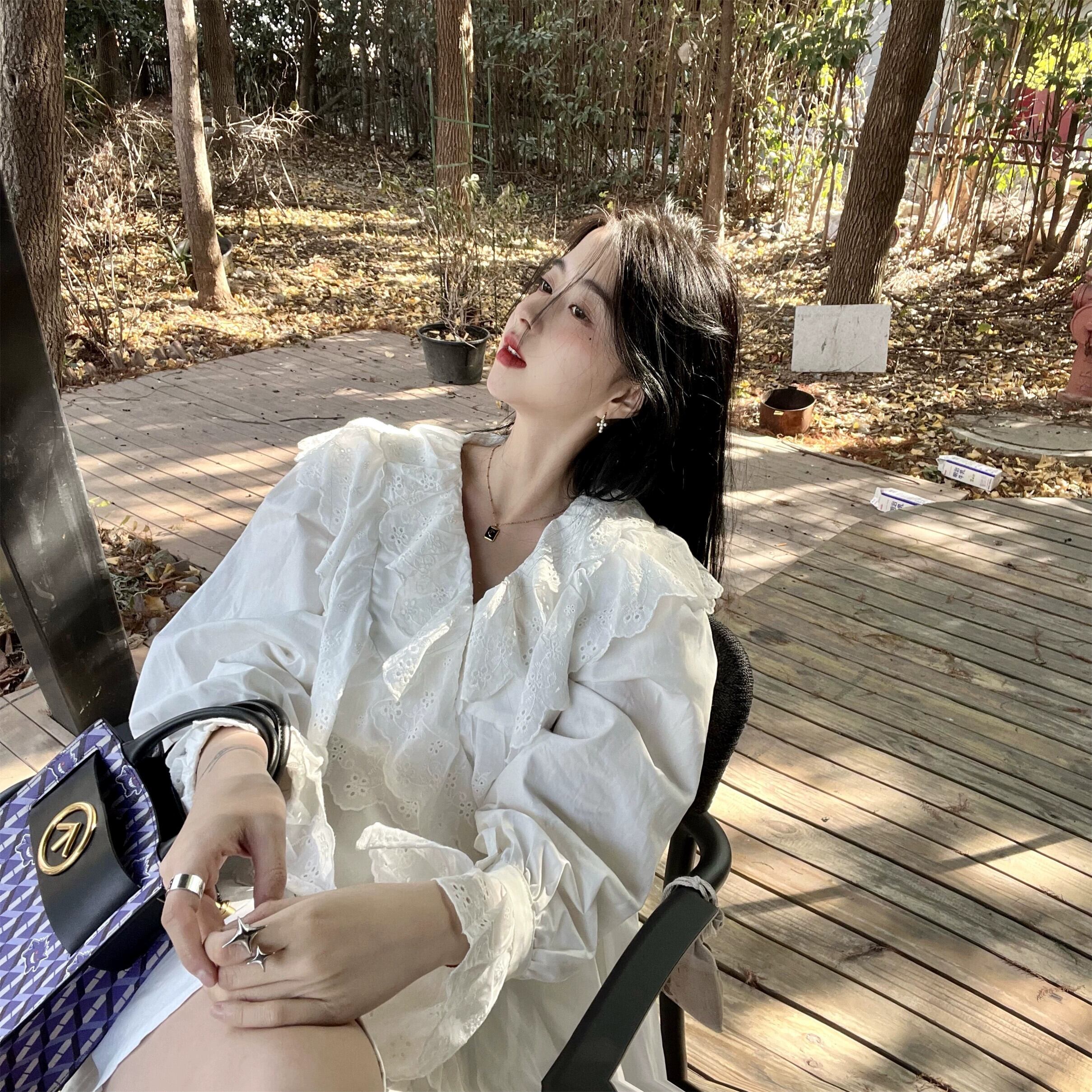長袖シャツ レディース デザインセンス ニッチドールシャツ 秋 小さめスタイル 優しいフリル Vネック トップス ロング オータム 秋物 8571619972087612