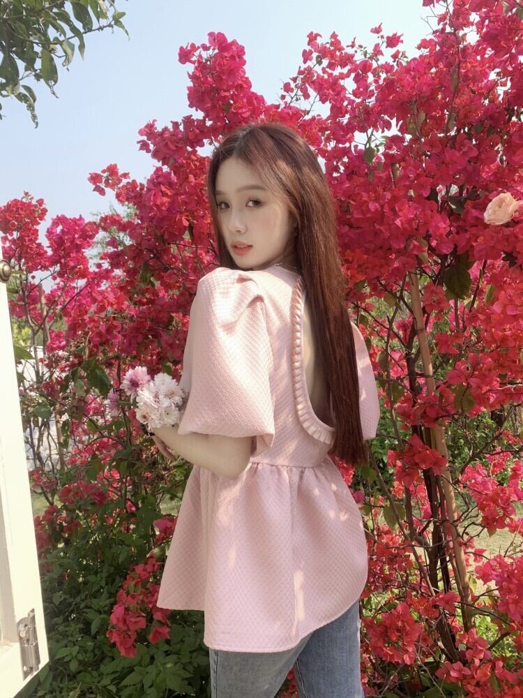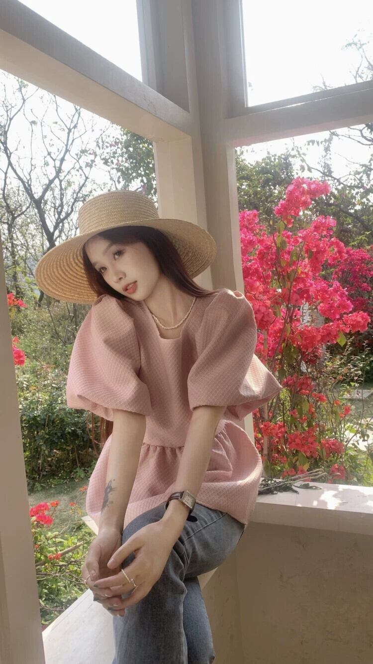 ピンク半袖シャツレディース2023年夏新デザインセンスニッチフレンチスイートパフスリーブホルタートップ 大人ガーリー スウィート キュート カジュアル サマー 夏物 8571684259619919