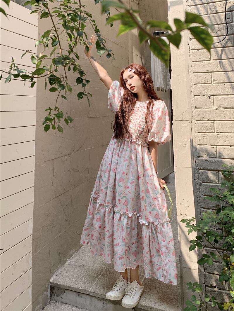 パフスリーブ花柄ドレスレディース2023夏新作ニッチデザインセンス甘いスタイル優しい風ロングスカート 大人ガーリー スウィート キュート カジュアル サマー 夏物 8571682108138833