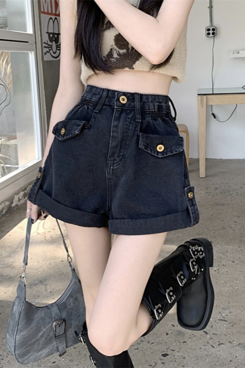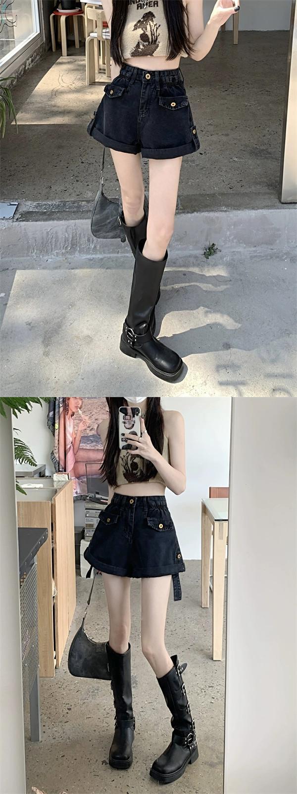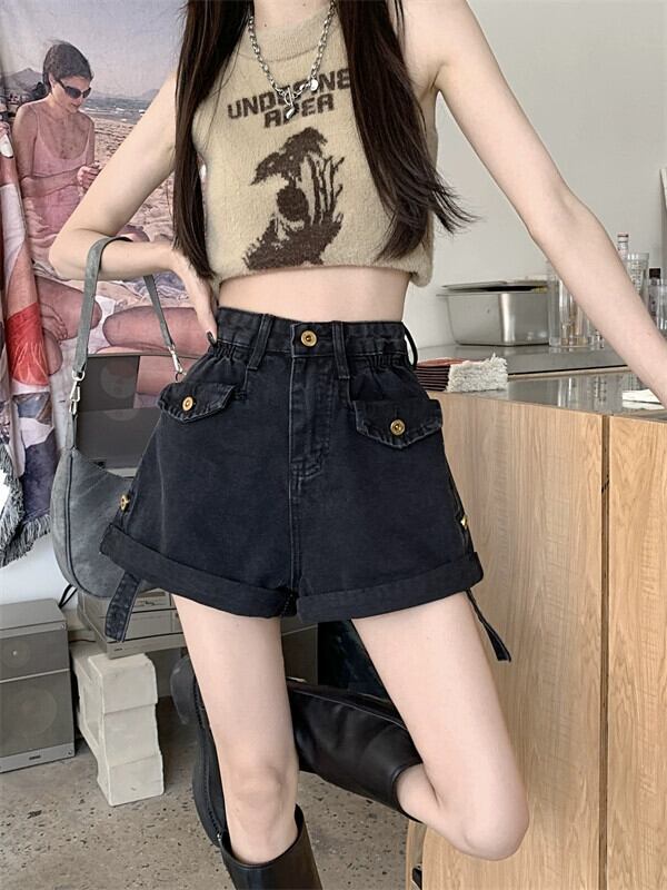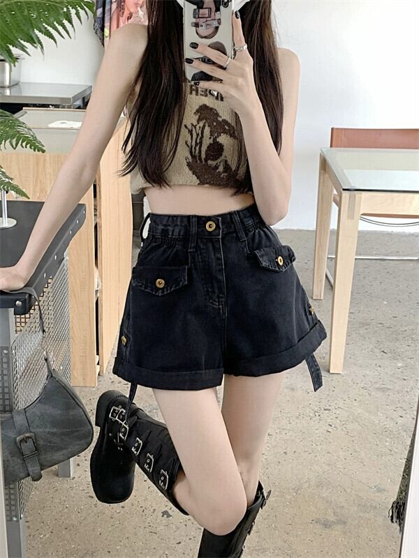 ブラックカーリーデニムショートパンツレディース2023夏新作小さいルーズハイウエストワイドレッグパンツ一言パンツ ハイウェスト サマー 夏物 ショーツ ブルマー ワイドパンツ 8571691335027200
