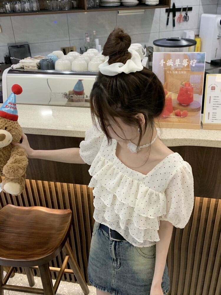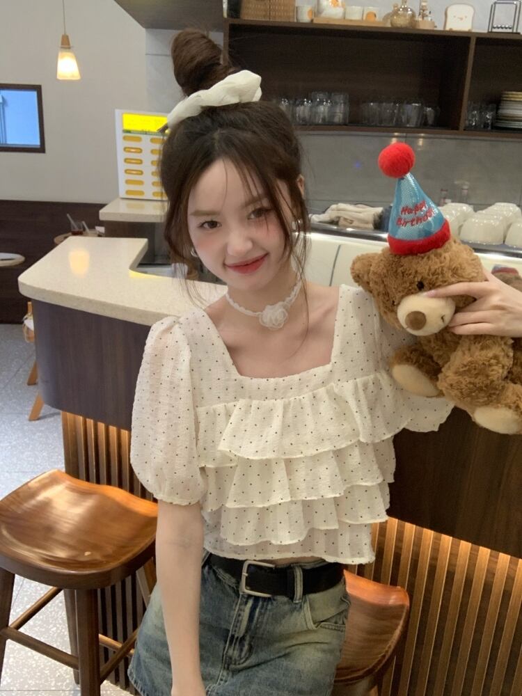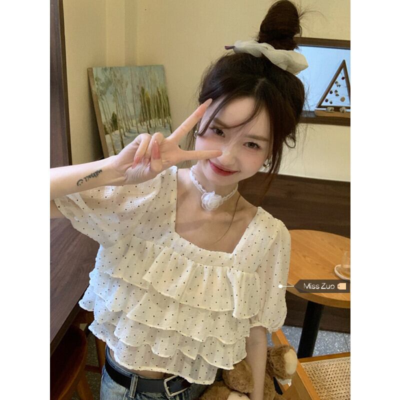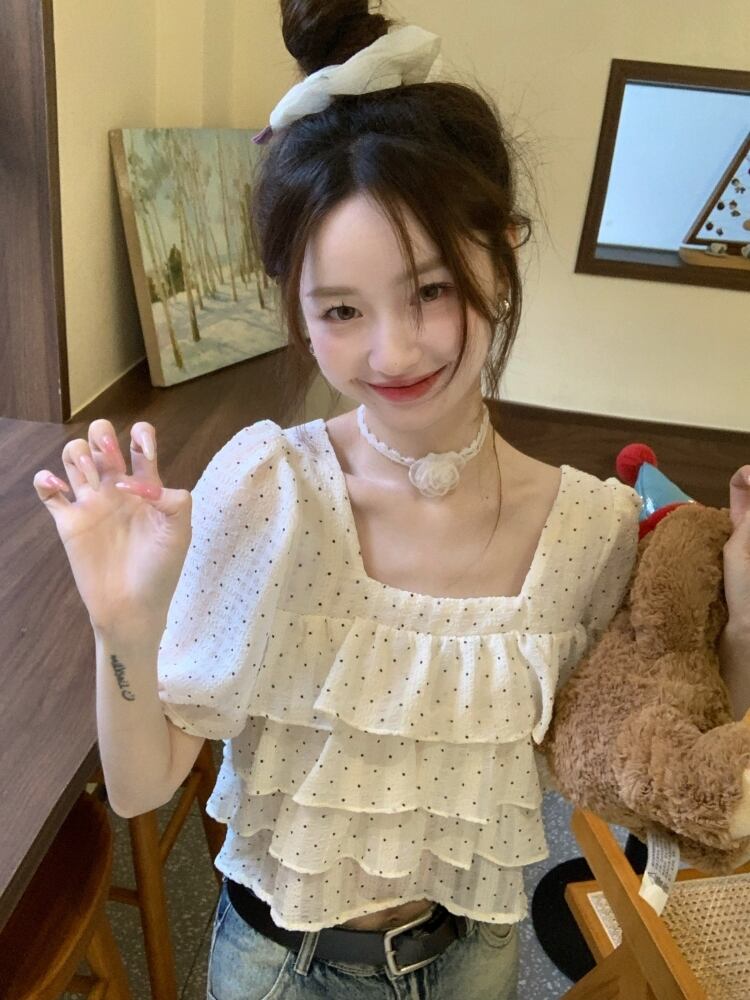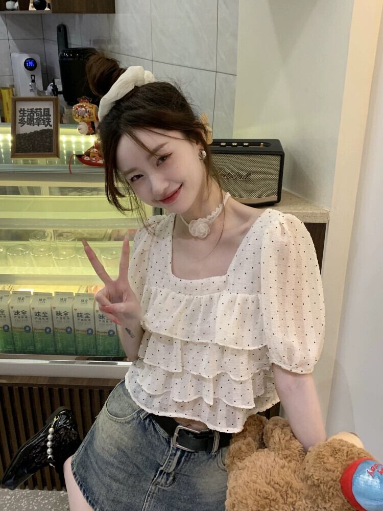 フリルスクエアカラーショートトップレディース夏デザインセンスニッチ甘くシックな美しいパフスリーブポルカドットシャツ 大人ガーリー スウィート キュート カジュアル サマー 夏物 スクウェア 8571626296247811