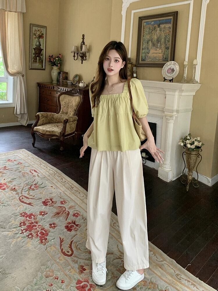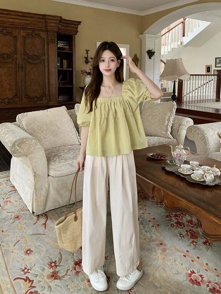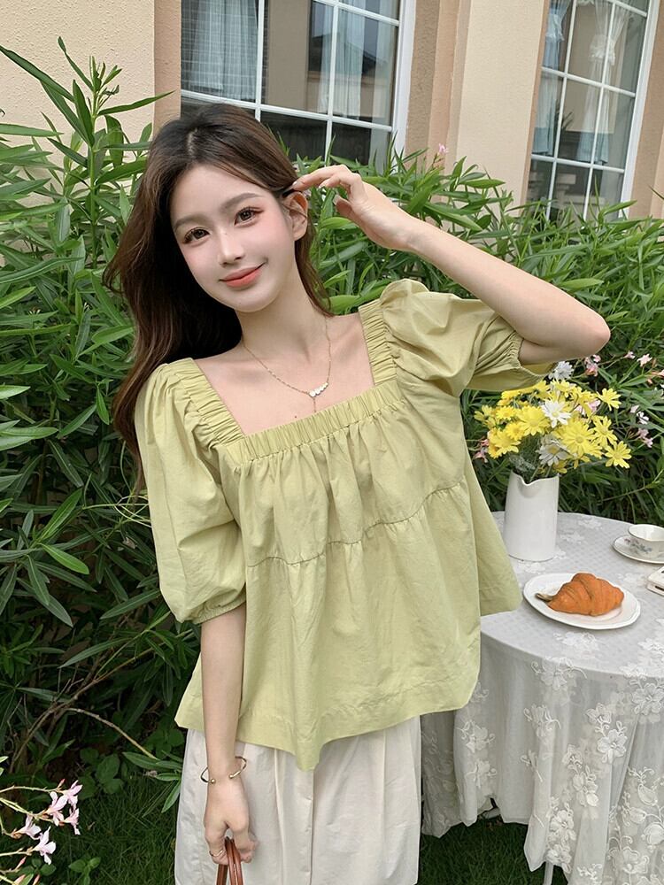 グリーン半袖シャツレディースデザインセンスニッチシャツ夏シックで美しいスクエアカラーパフスリーブドールシャツトップ サマー 夏物 スクウェア 8571691281997397