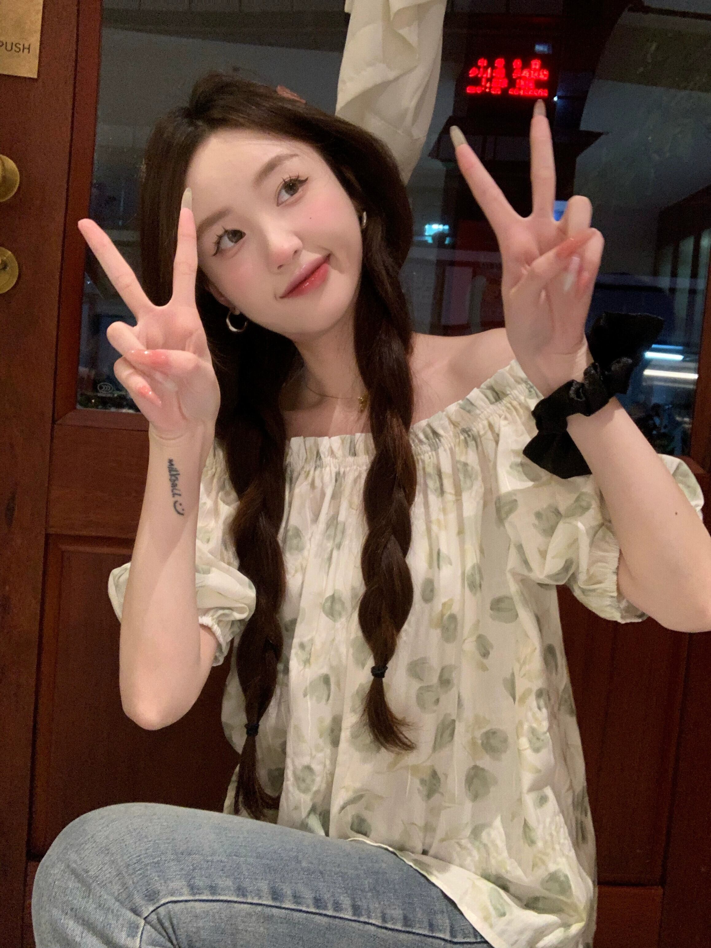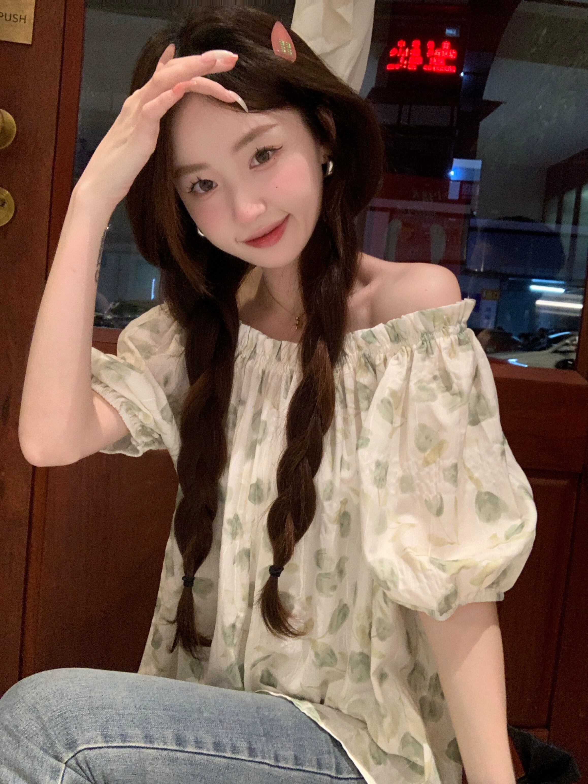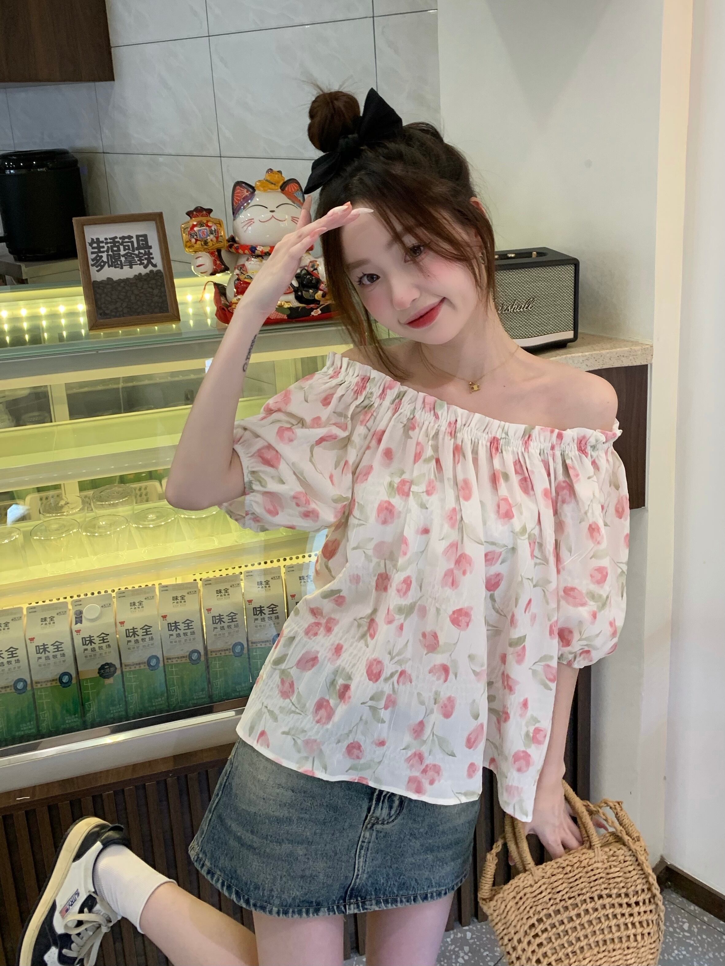 パフスリーブトップ女性の夏の2023新しい小さな新鮮な甘いユニークなシックな半袖花柄シャツお腹をカバー 大人ガーリー スウィート キュート カジュアル サマー 夏物 857168507395170