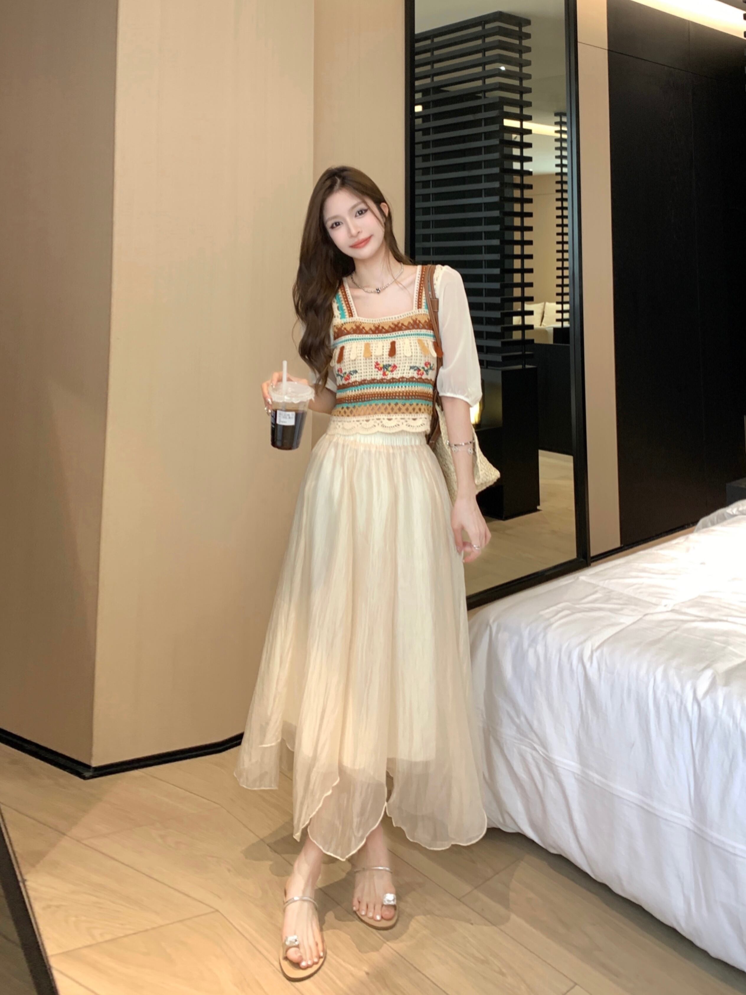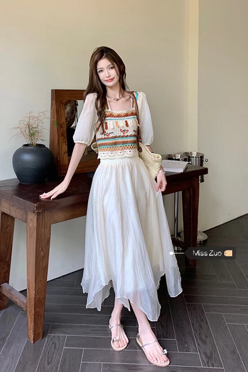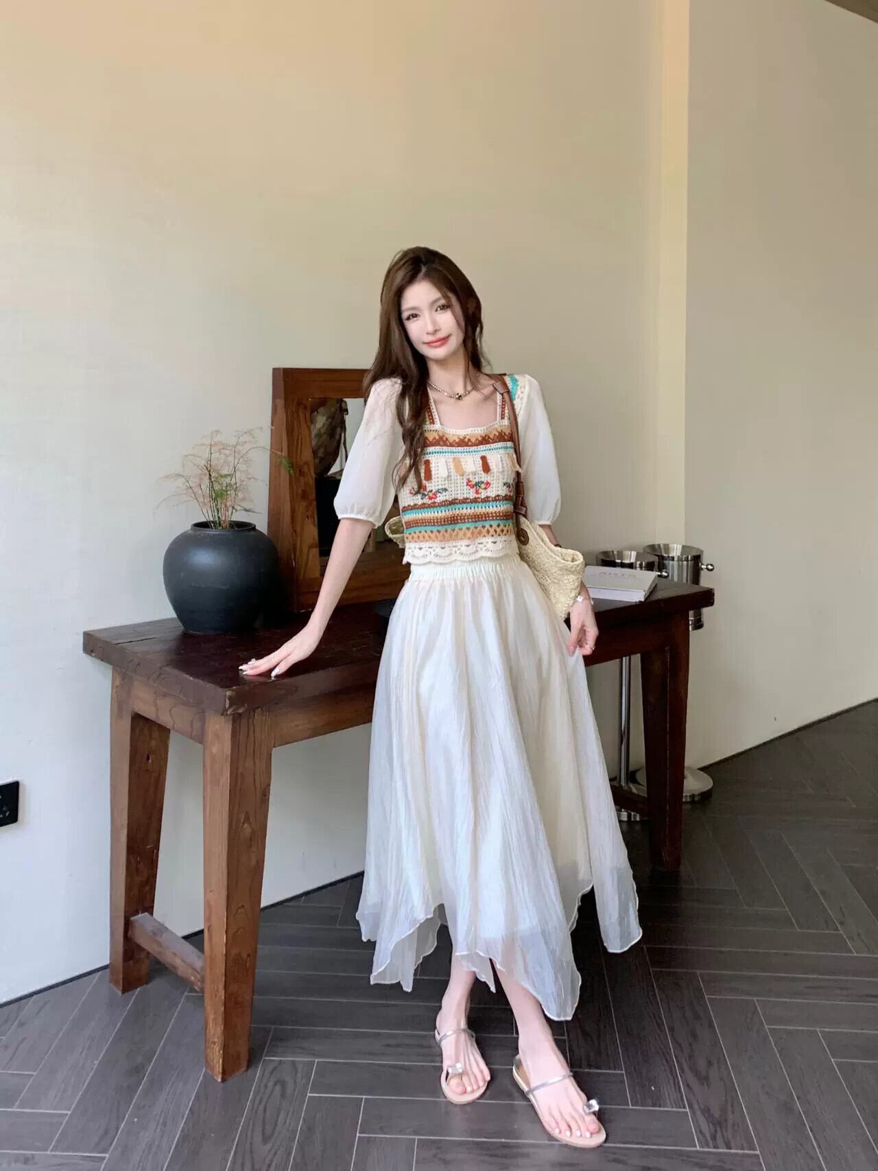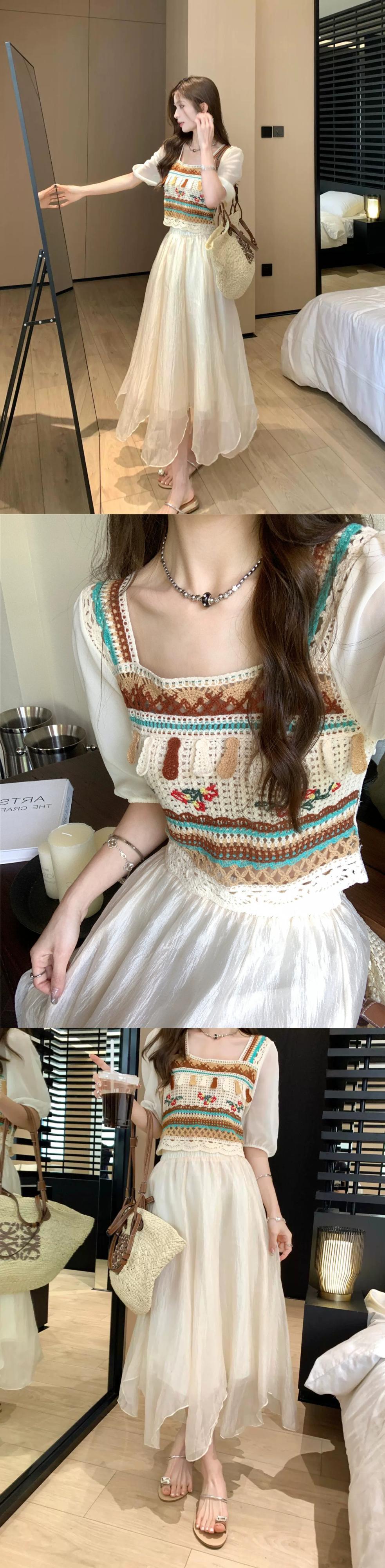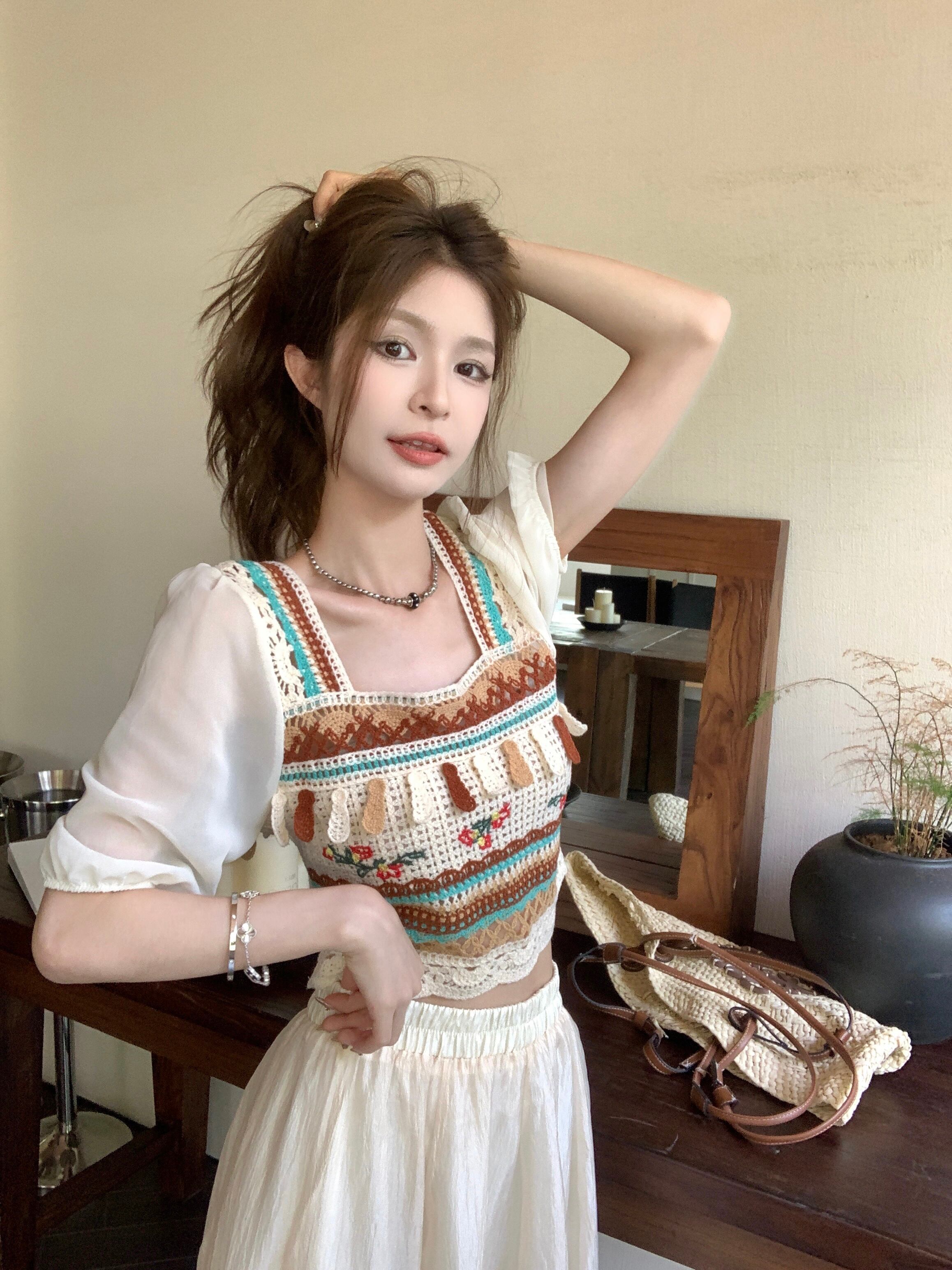 ボヘミアンエスニックスタイルショートトップ女性の夏ユニークな超美しいスクエアカラーかぎ針編み中空半袖ニットセーター サマー 夏物 スクウェア 8571619218103146