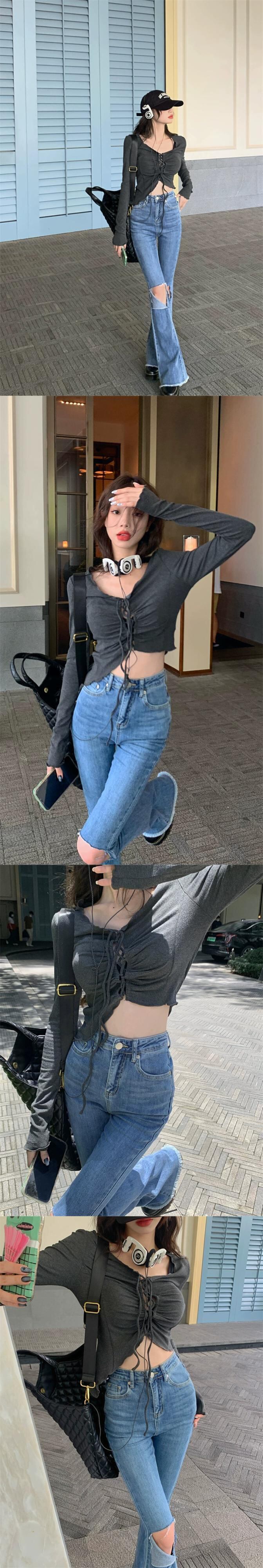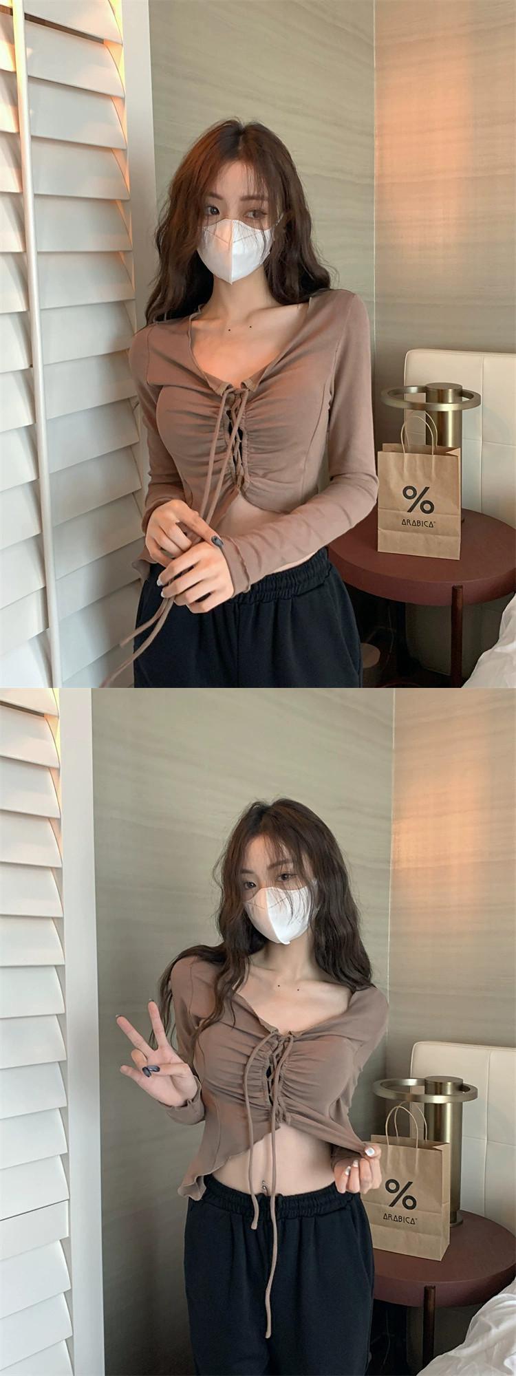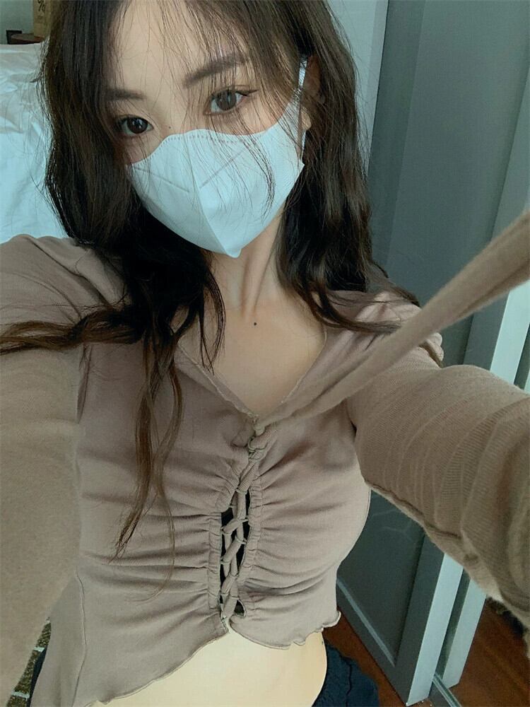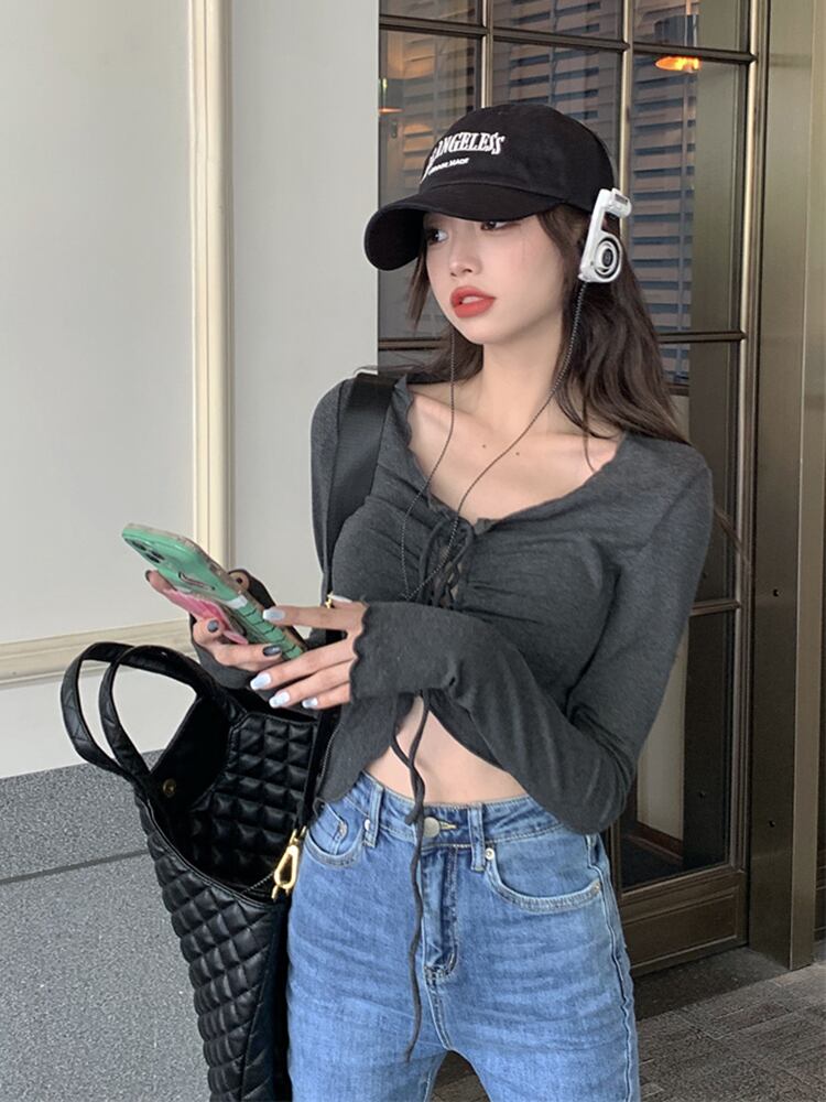 長袖Tシャツレディースデザインセンスニッチ秋純粋な欲望ユニークでユニークな特別な不規則なスリムVネックショートトップ ロング オータム 秋物 ピュア 8571653876403025