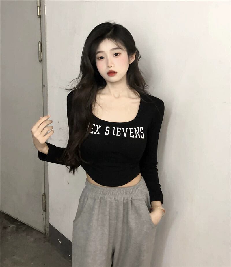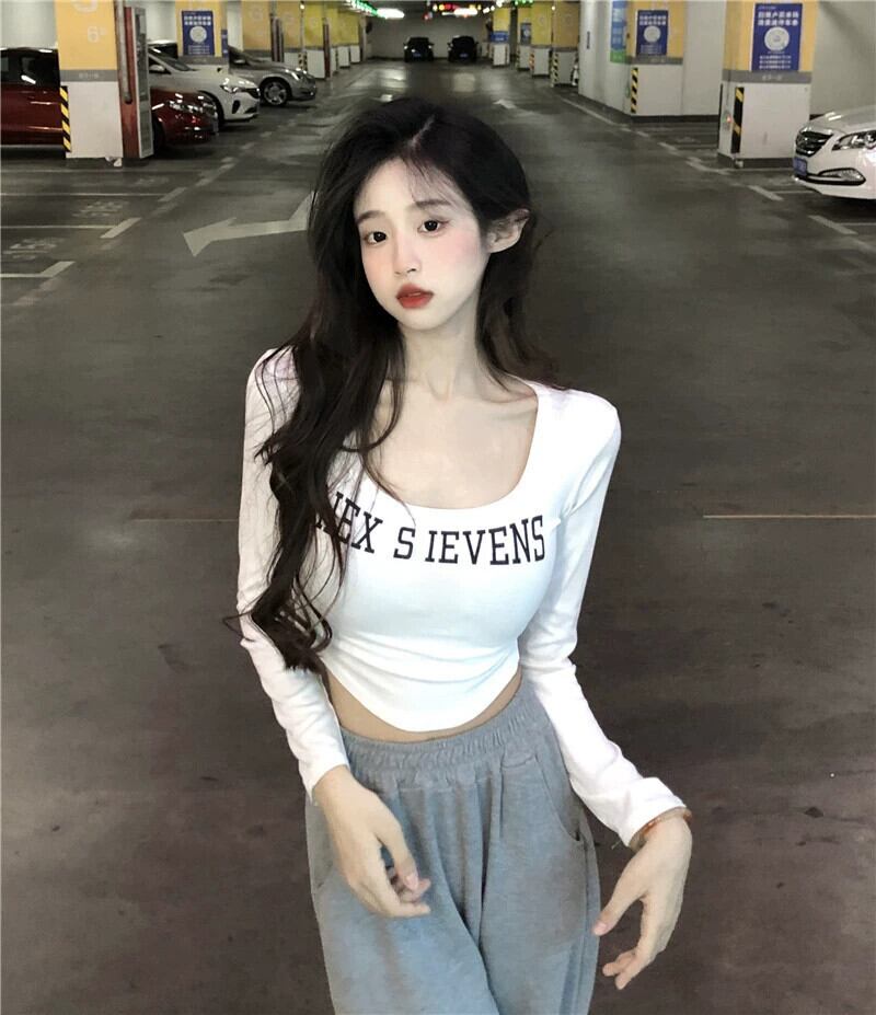 ホワイトショートトップ女性の春インナーボトリングシャツ2023新しい甘いスリムスクエアカラー長袖Tシャツ ロング 大人ガーリー スウィート キュート カジュアル スプリング 春物 スクウェア 8571628799560903