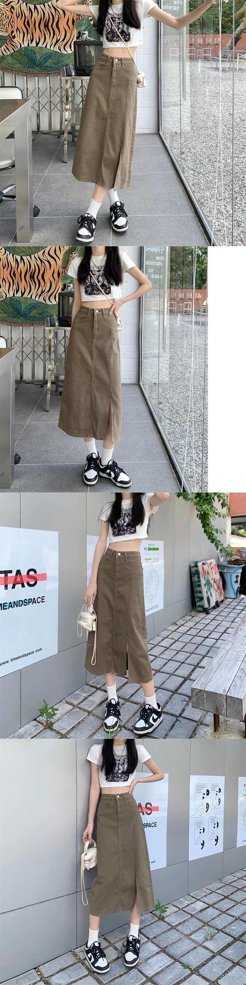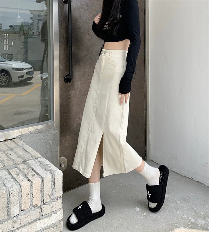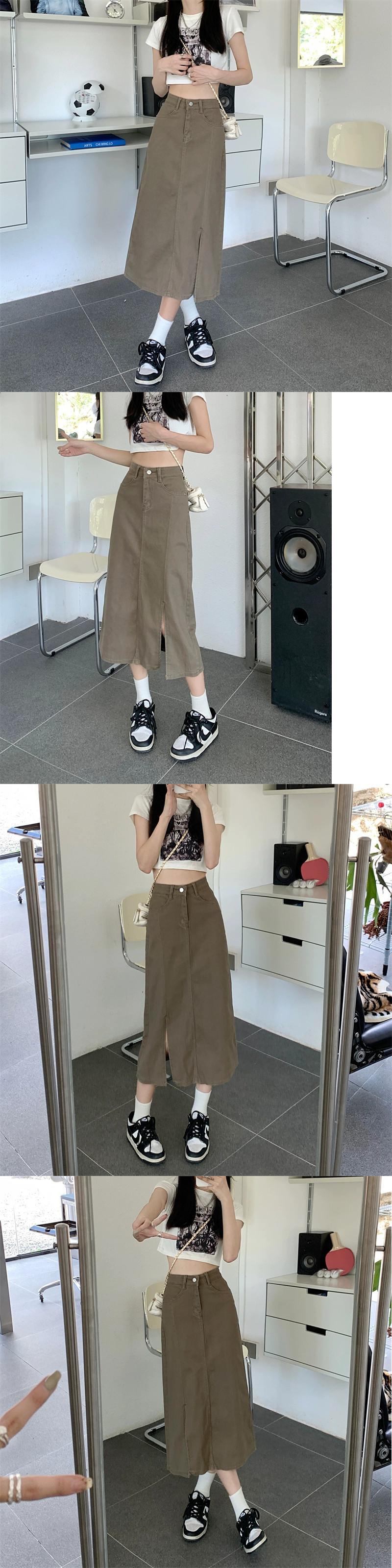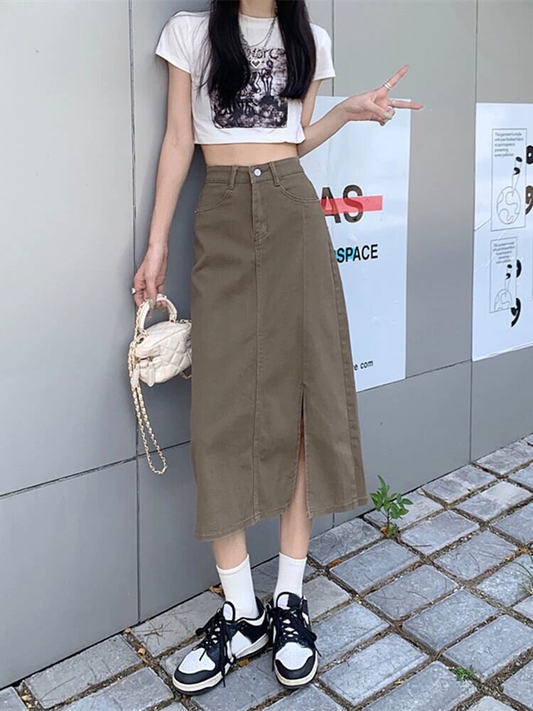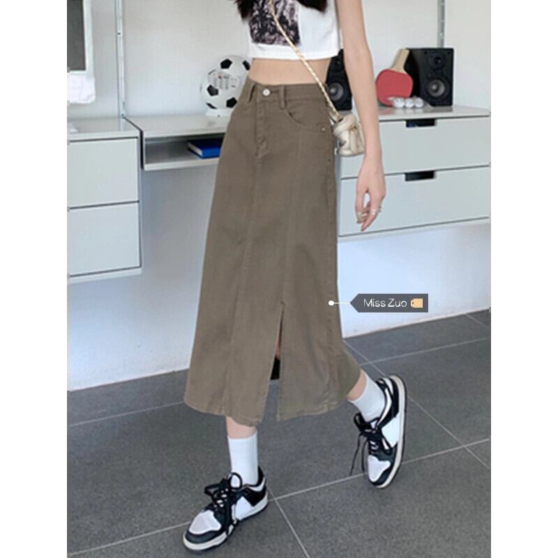 カーキデニムスカートレディース2023秋新作ハイウエストスリムAラインミドル丈スリットバッグヒップスカート オータム 秋物 8571694388121933