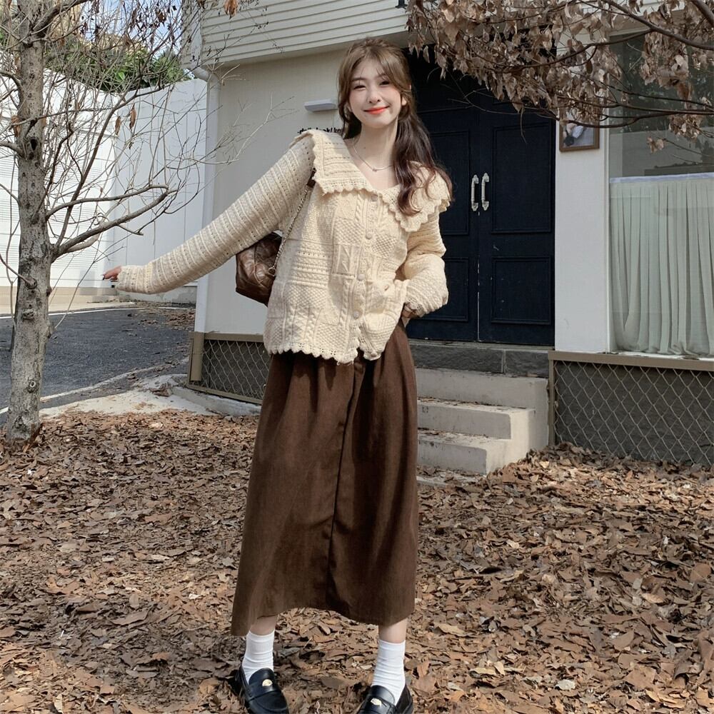色:アプリコットセーター,コーヒー色のスカート