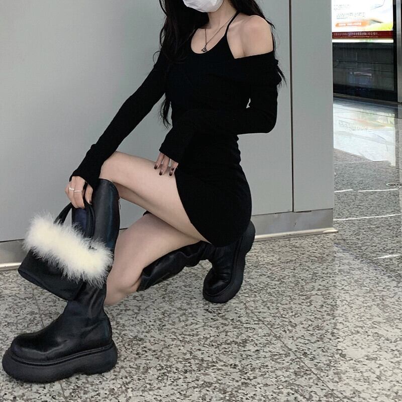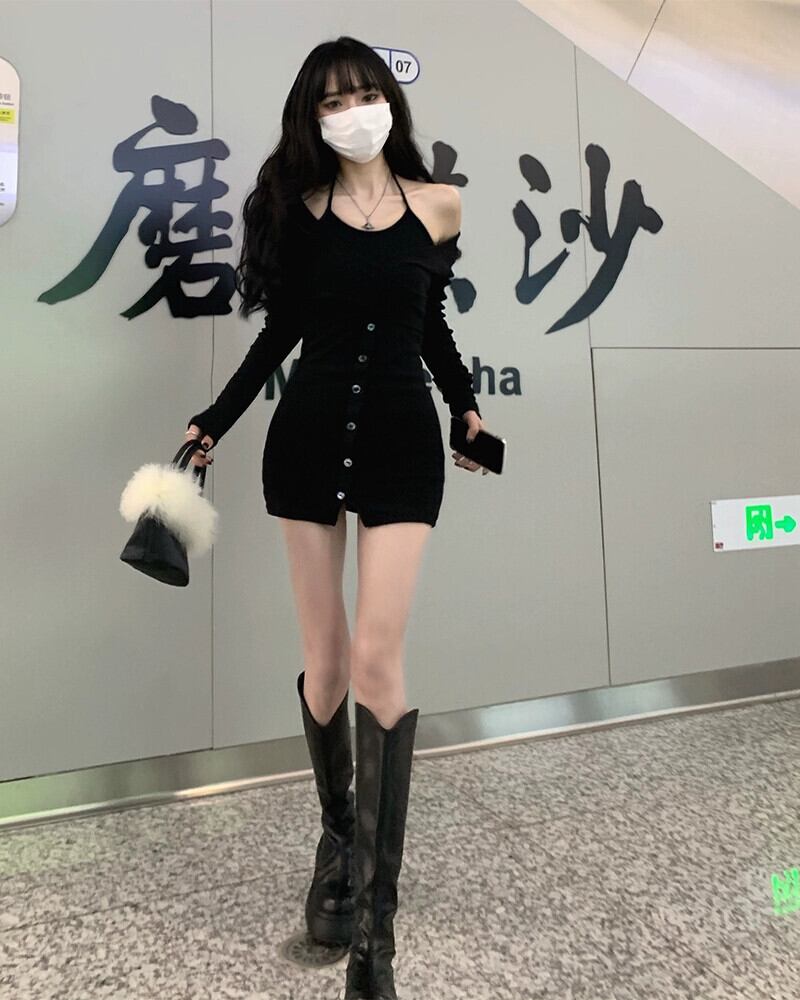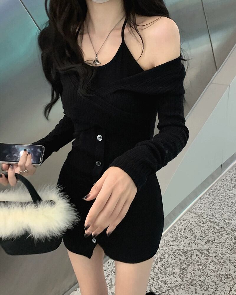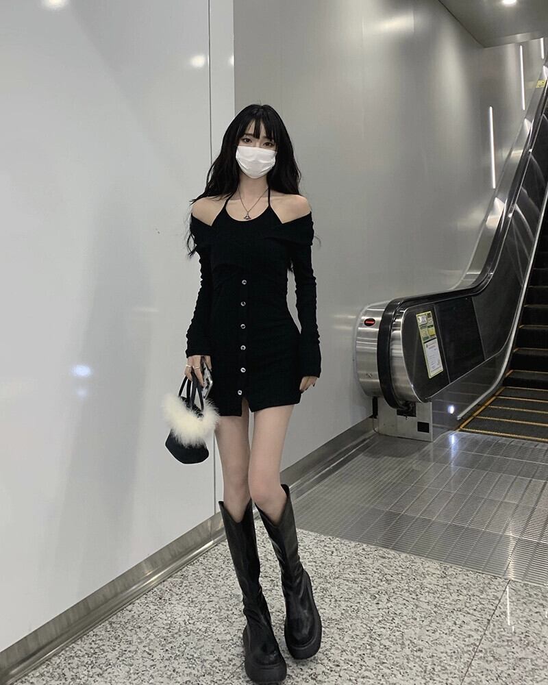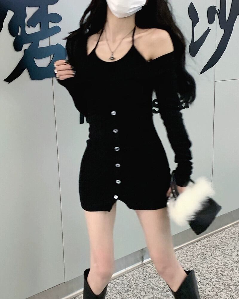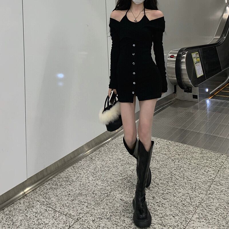 偽ツーピース長袖ドレス女性の秋 2023 新しい純粋な欲望スリムフィットバッグヒップストラップレス黒ショートスカート ロング ブラック オータム 秋物 ピュア 8571674526025263