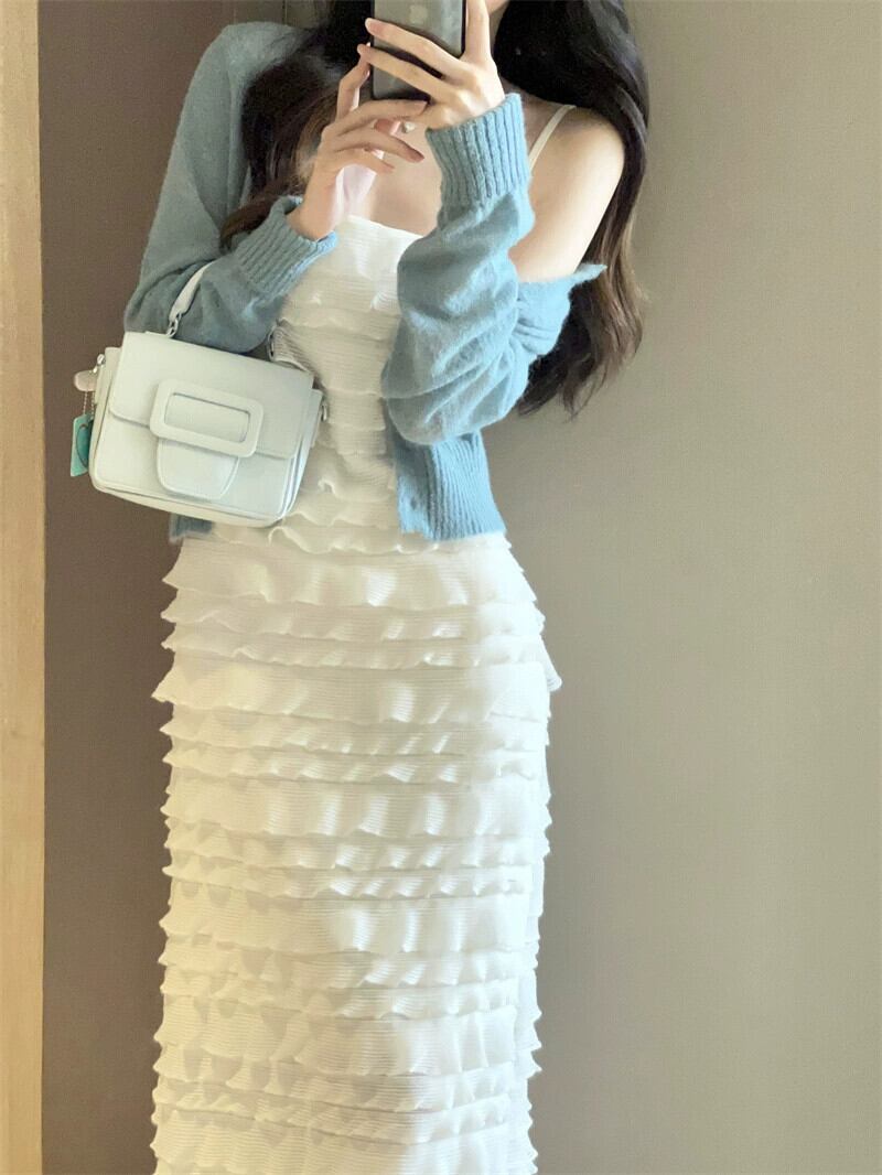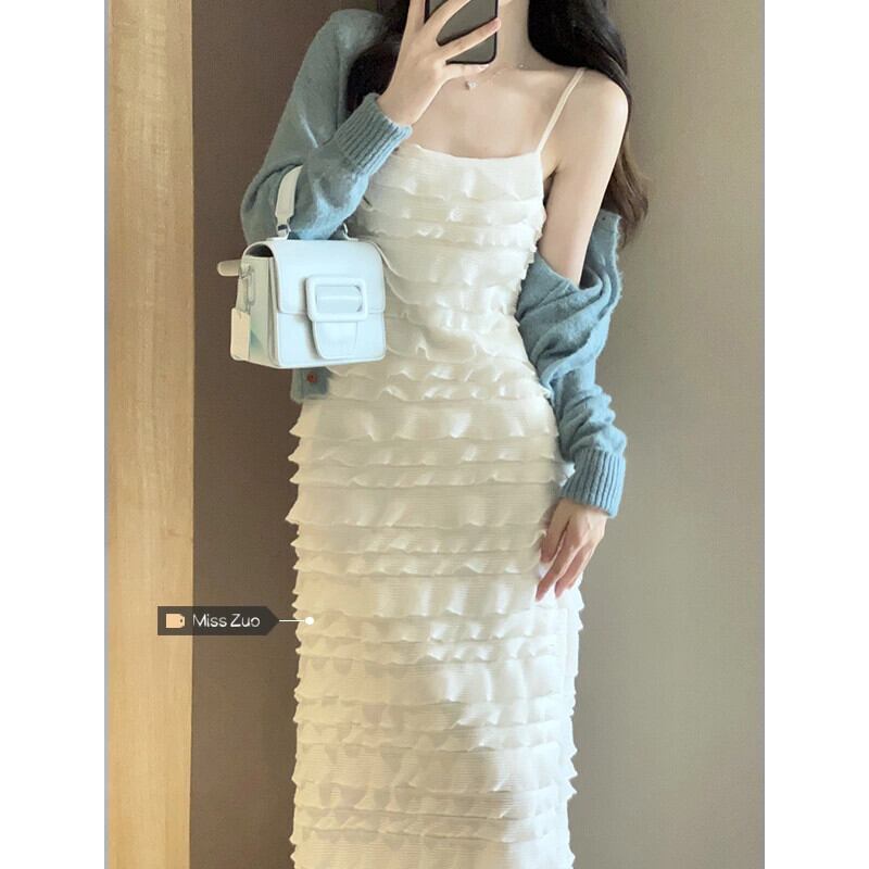 ホワイトケーキスカート サスペンダードレス レディース 秋デザインセンス ニッチ 優しいシック スーパーフェアリー ロングスカート オータム 秋物 8571654253353878