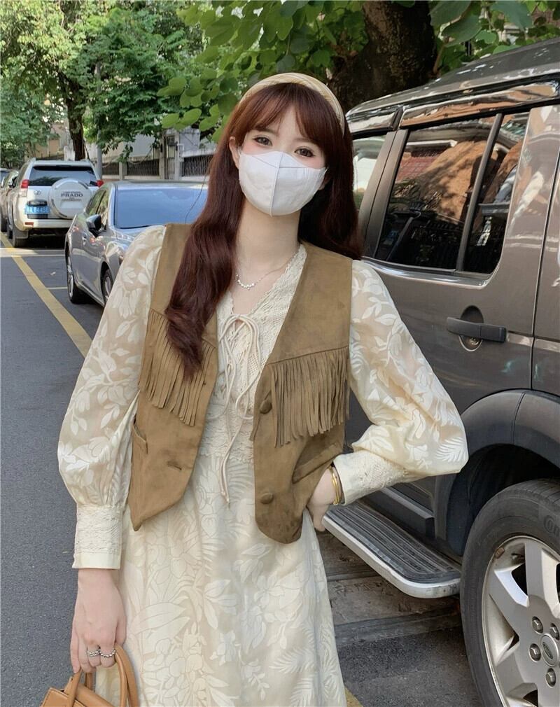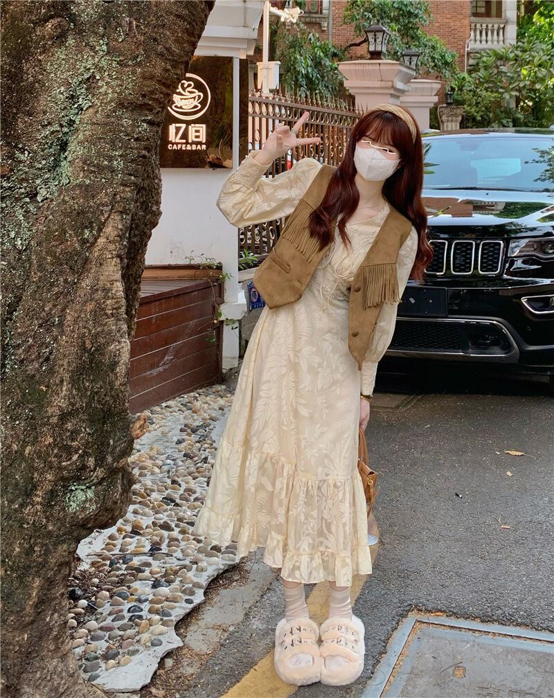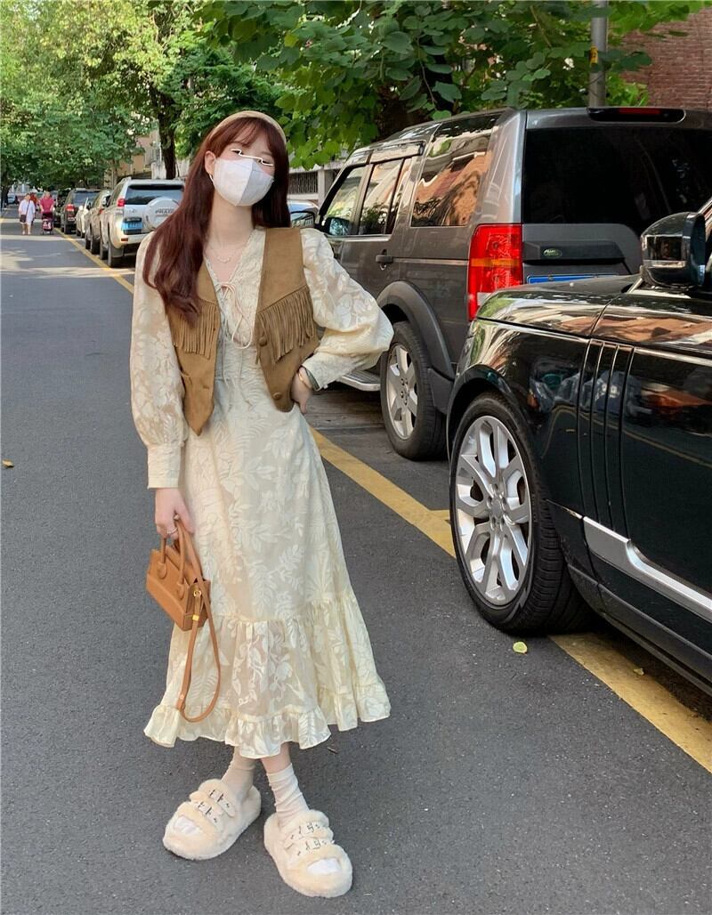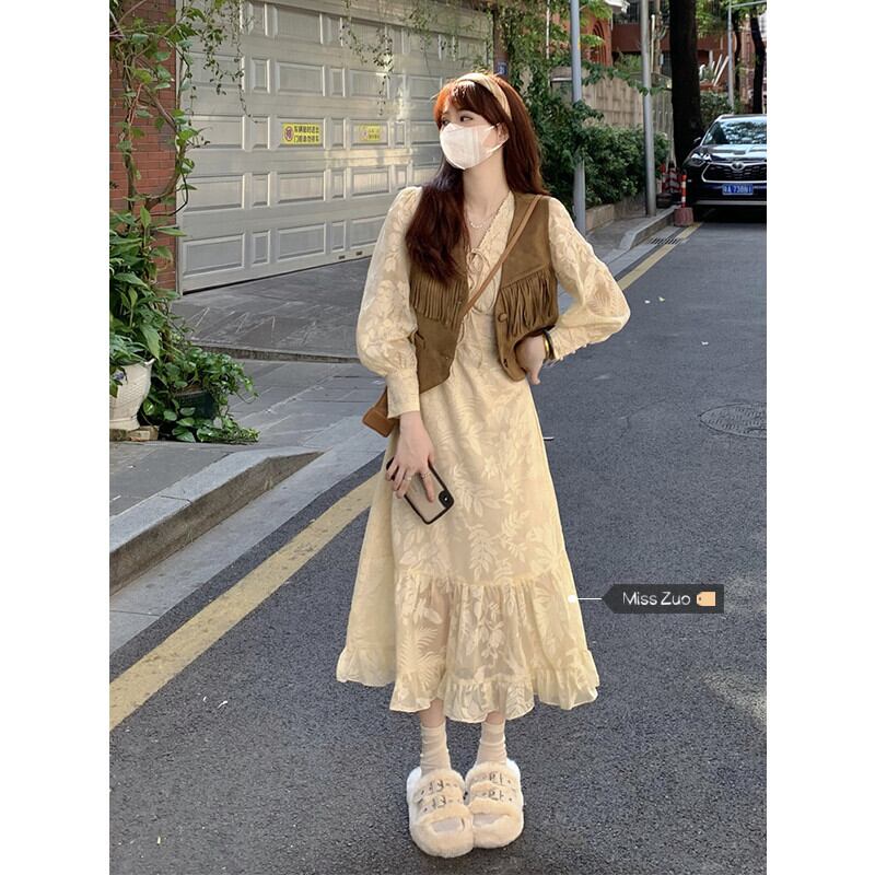 V ネック長袖ドレス女性の秋の気質女神ファン 2023 新しいハイエンドの優しい風ウエストロングスカート オータム 秋物 Vネック 8571685440220351
