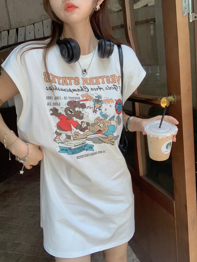 ホワイトノースリーブTシャツレディース夏デザインセンスニッチ2023新作ボトム欠落ルーズミドル丈トップ サマー 夏物 8571622166322322