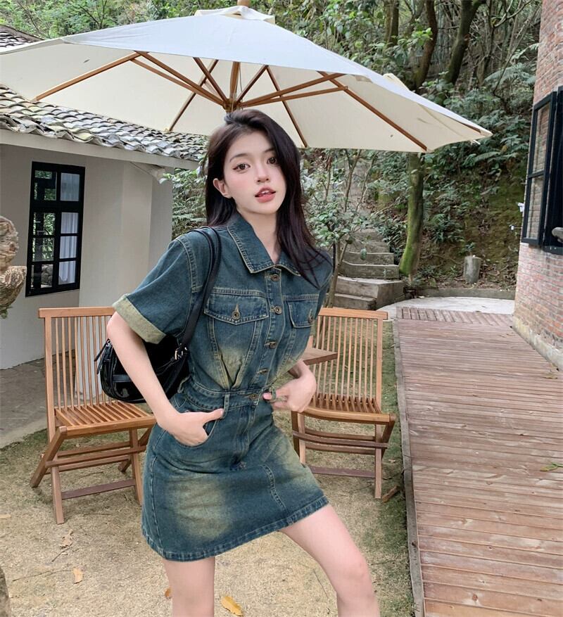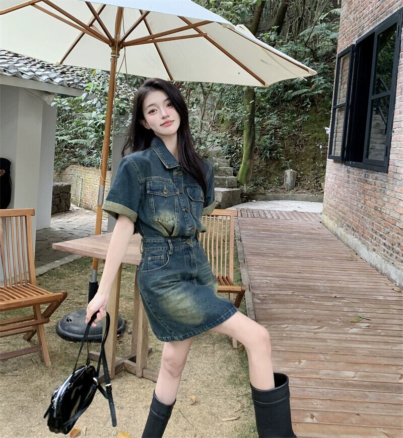 ツーリングデニムドレス女性の夏 2023 新しい香港スタイルのレトロな小さな気質ウエストバッグヒップショートスカート サマー 夏物 857162581550074