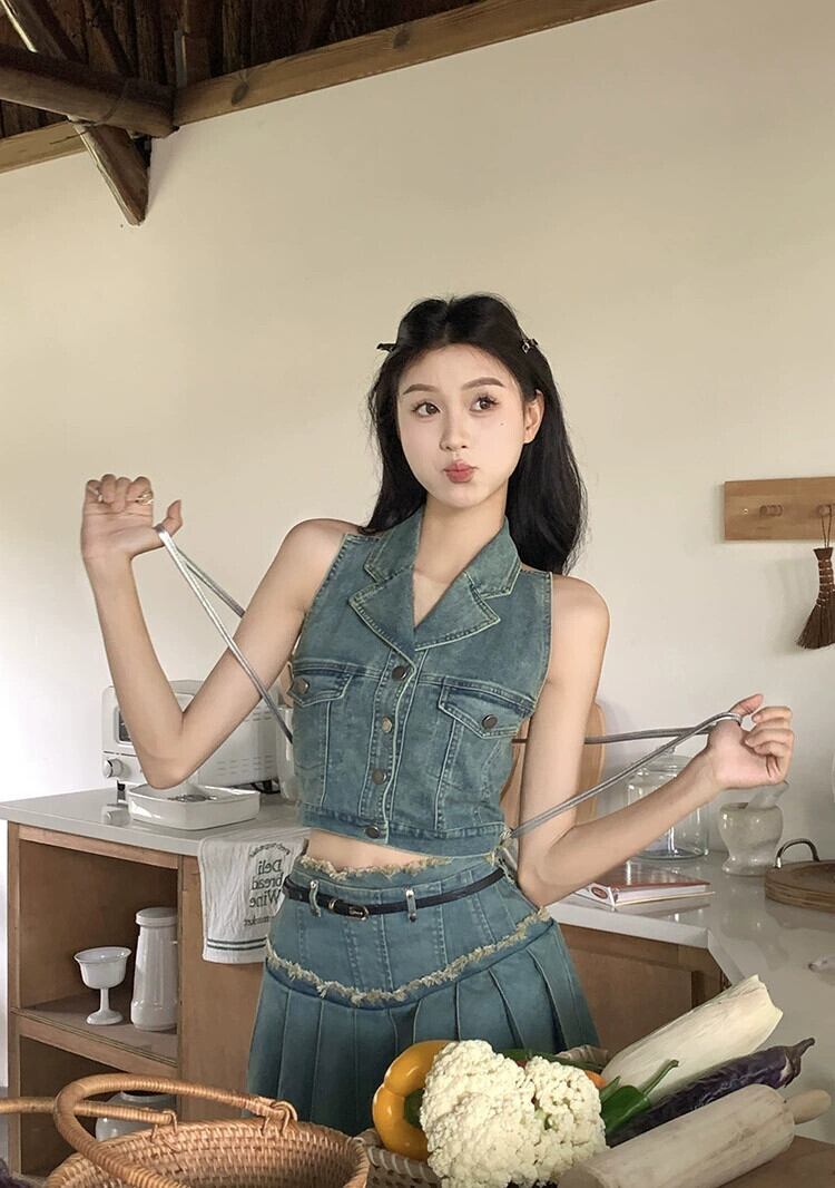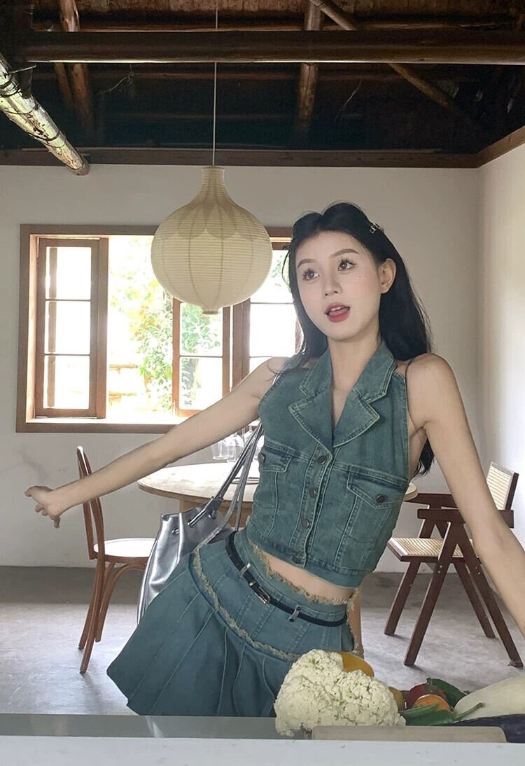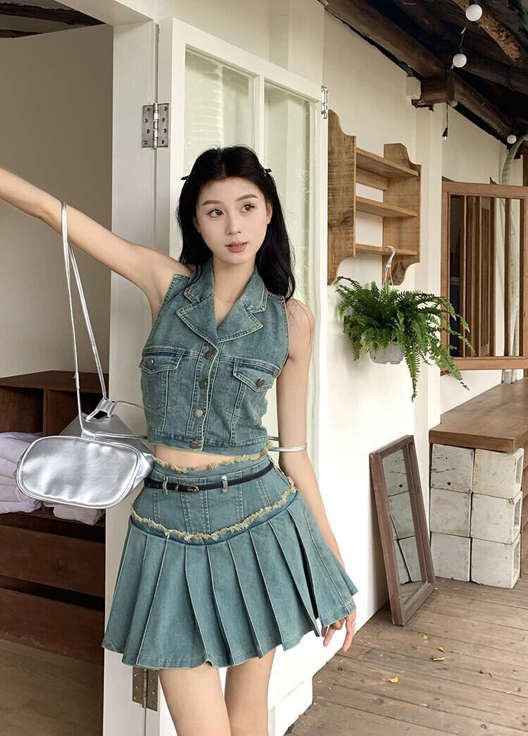 ホルターネックデニムベストレディース夏香港スタイルレトロスイートシックユニークなバックレスノースリーブショートトップアウター 大人ガーリー スウィート キュート カジュアル サマー 夏物 8571624280937313