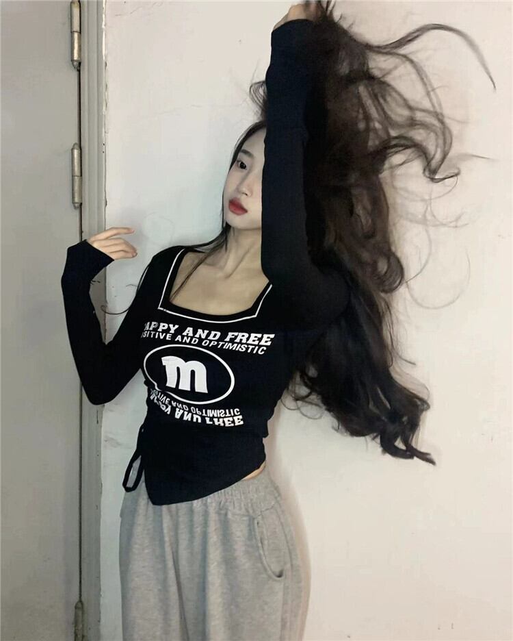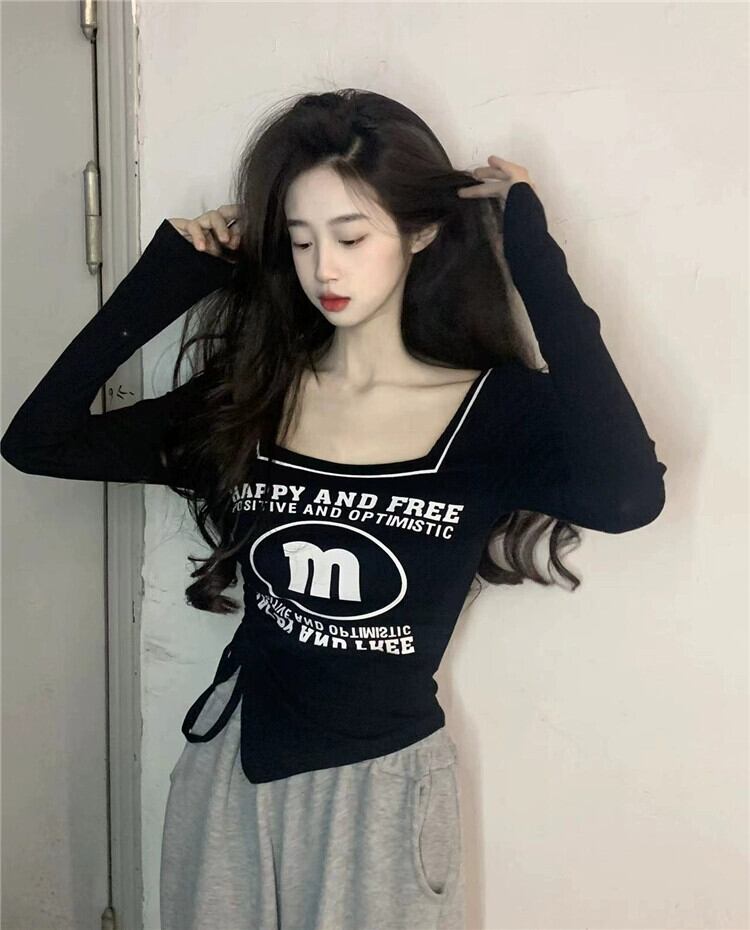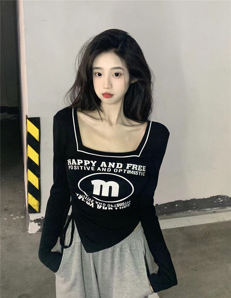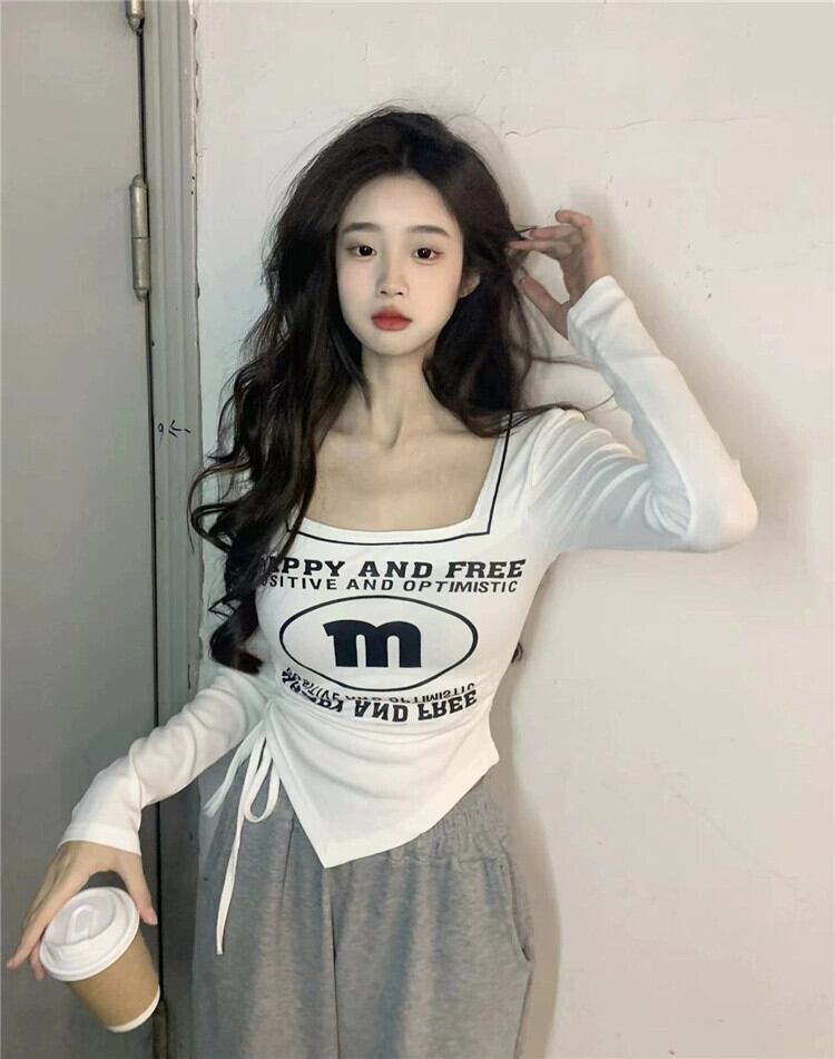 白長袖Tシャツ婦人服デザインセンスニッチ春アメリカンレトロ不規則スクエアカラーショートトップ ロング ホワイト スプリング 春物 スクウェア 857163199982849