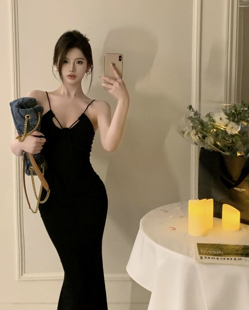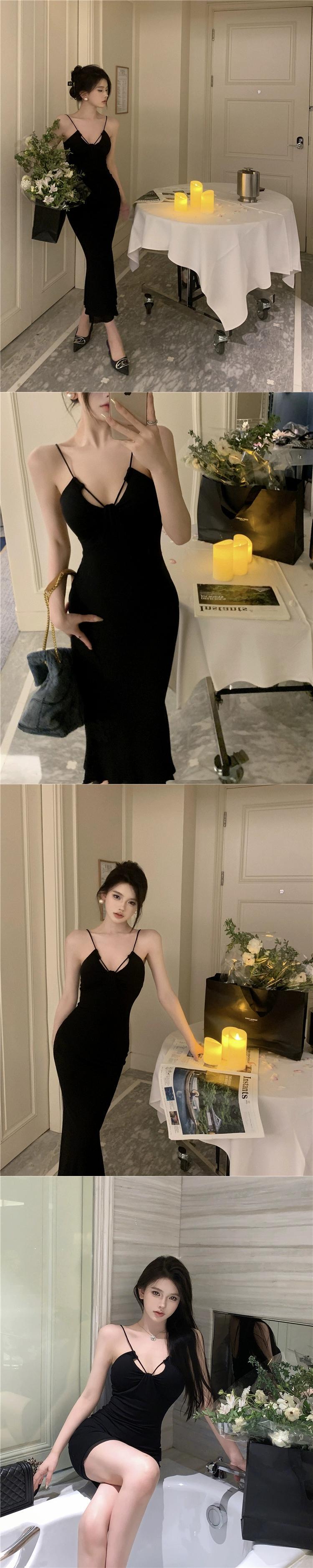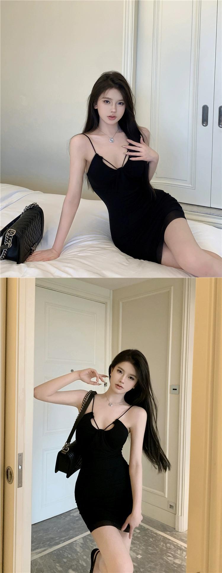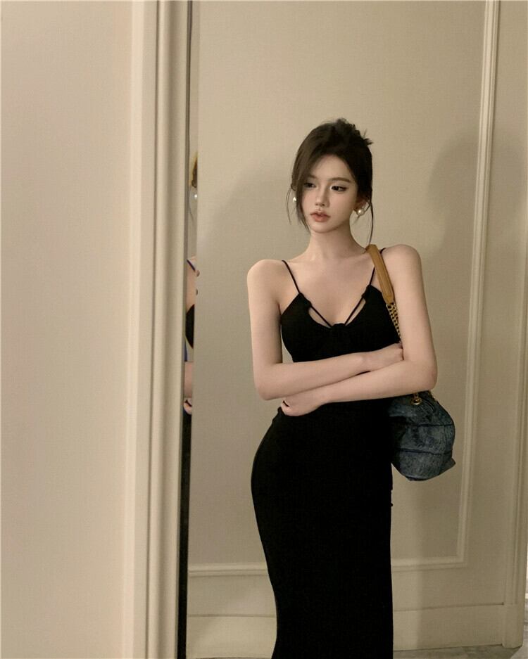 黒サスペンダードレスの女性の夏 2023 新しい純粋な欲望セクシーな自己修養胸パッドバッグヒップロングスカート ブラック サマー 夏物 ピュア 857165417849123
