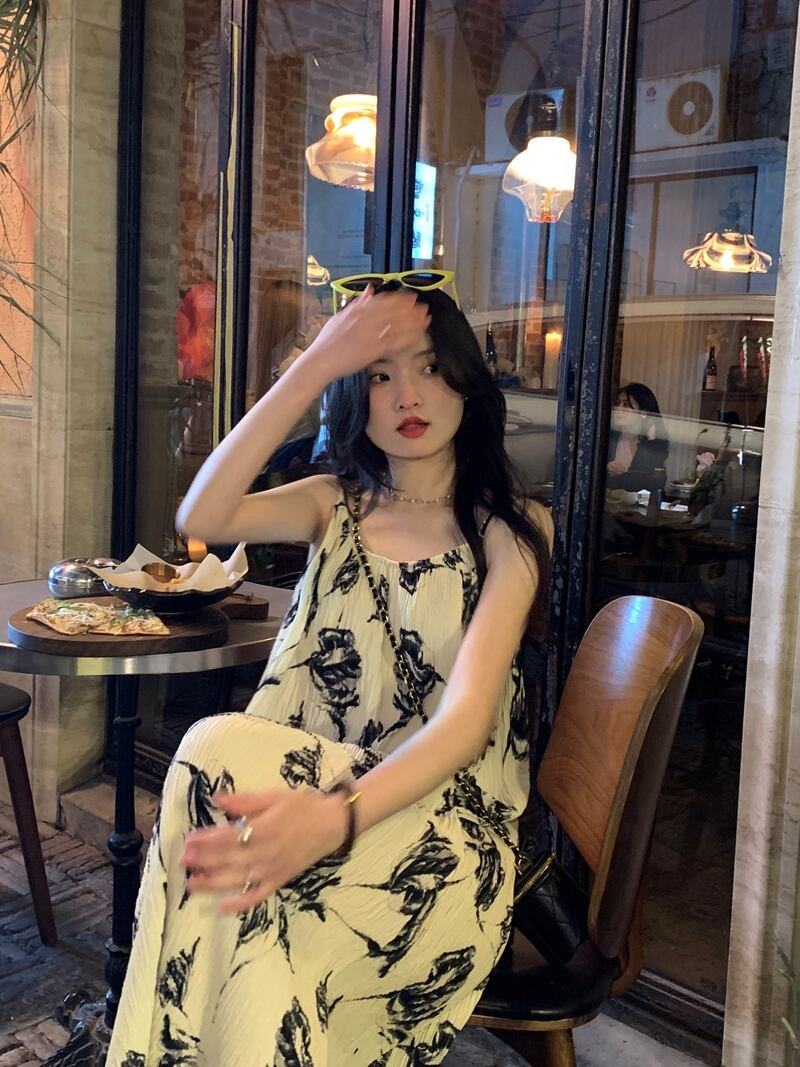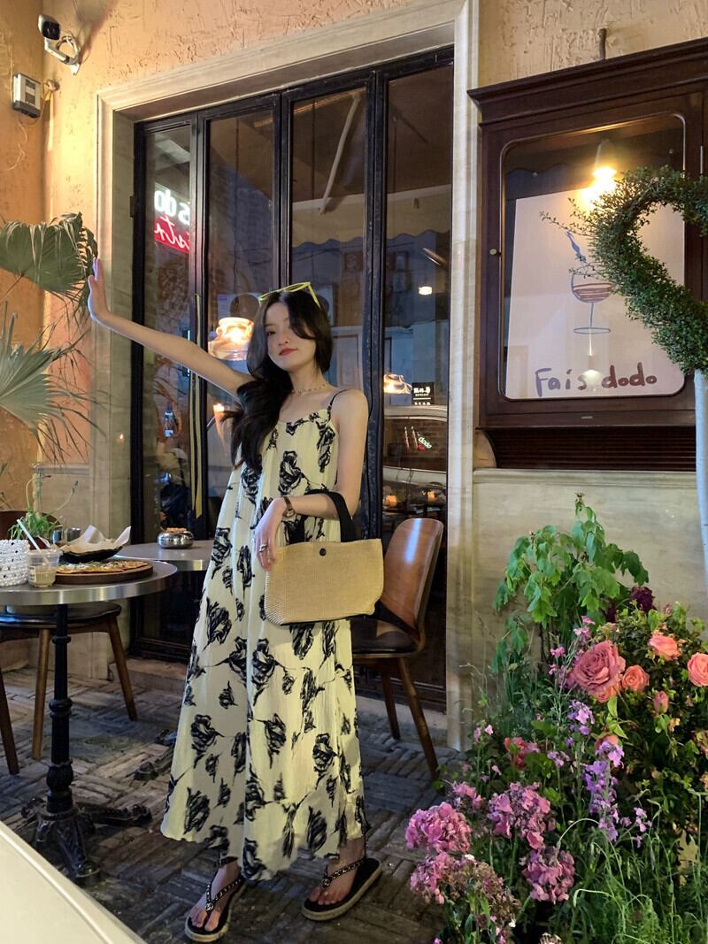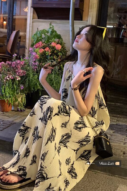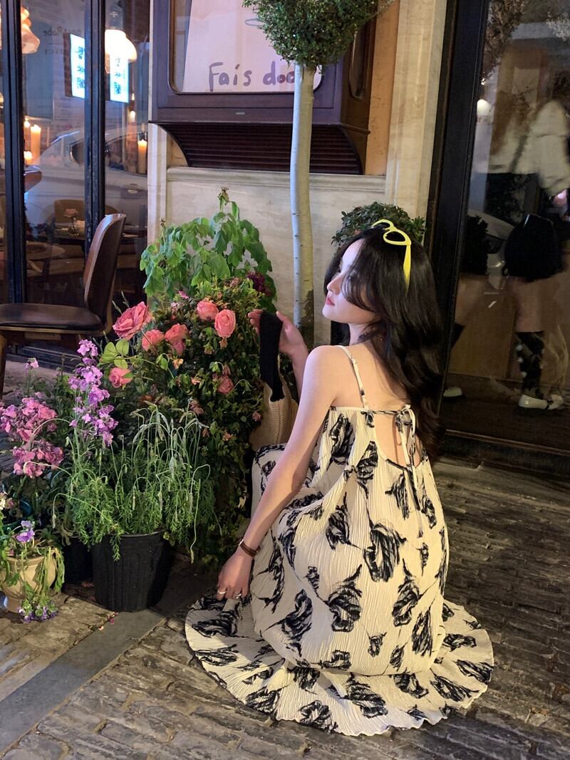 プリントサスペンダードレスの女性の夏の 2023 新しい甘い気質穏やかな風海辺の休日のバックレスロングスカート 大人ガーリー スウィート キュート カジュアル サマー 夏物 8571657809674904
