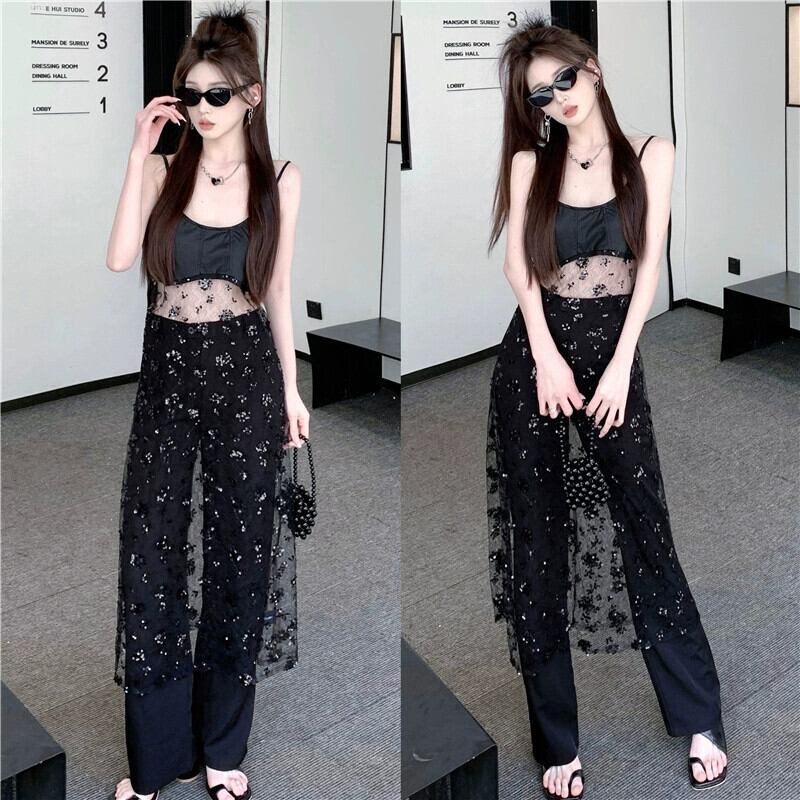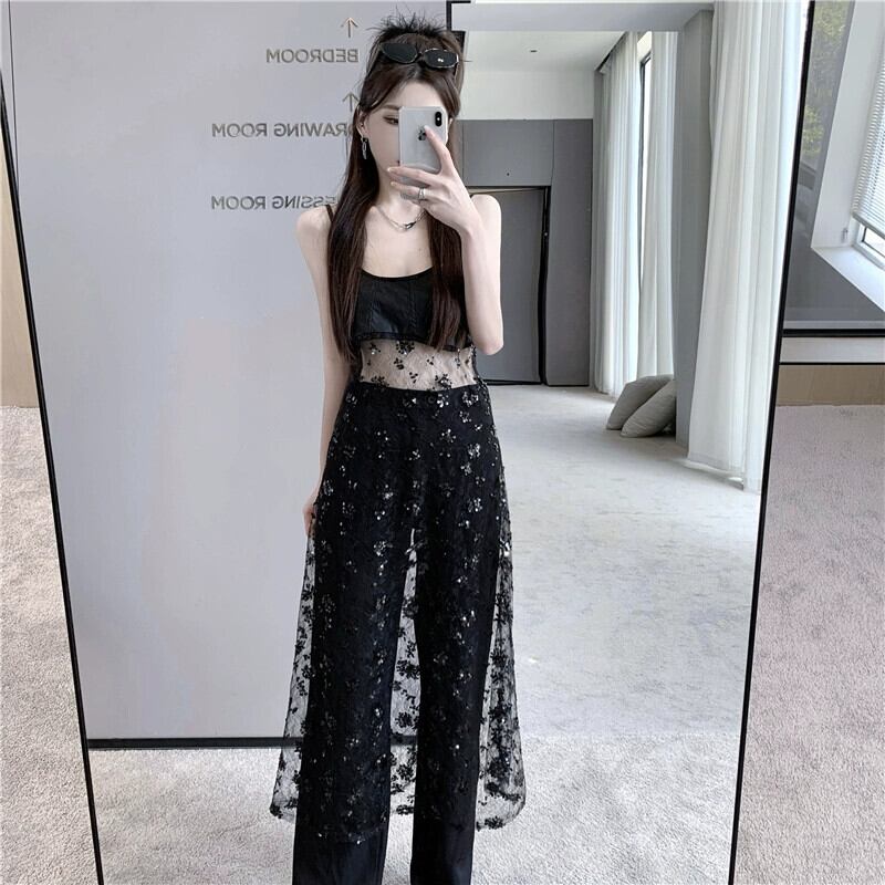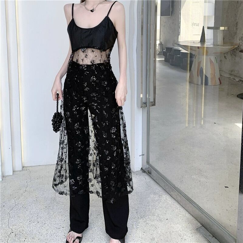 ステッチシースルーレースサスペンダードレスレディース夏ニッチデザインセクシーシック美しいロングスカート サマー 夏物 8571682952171507