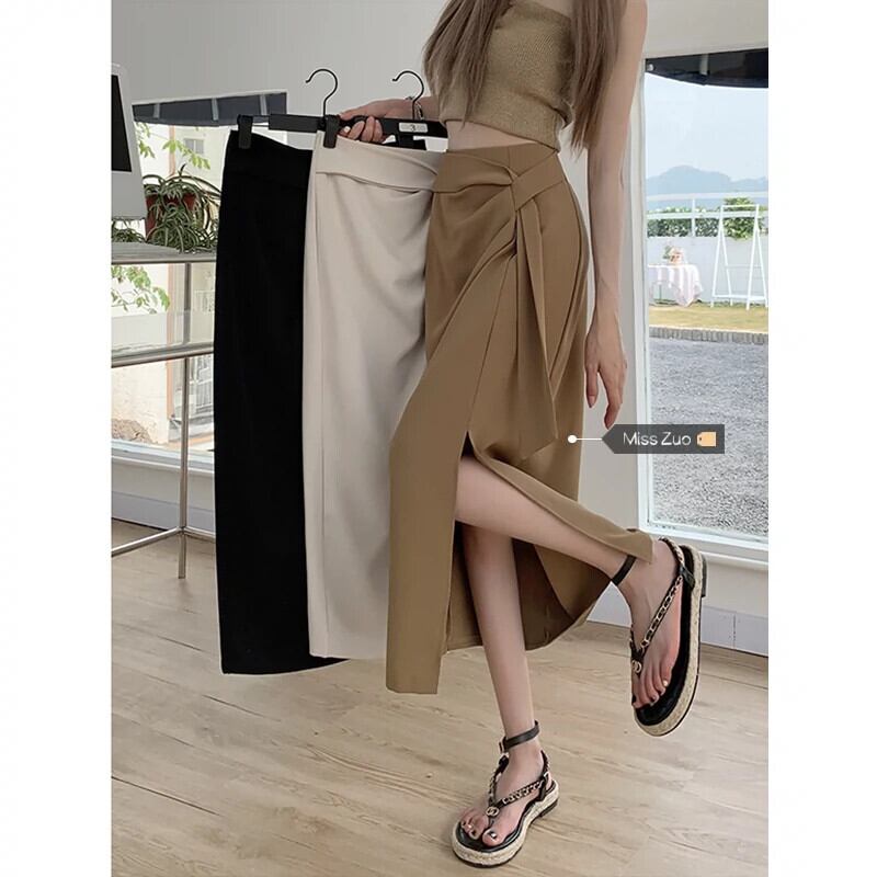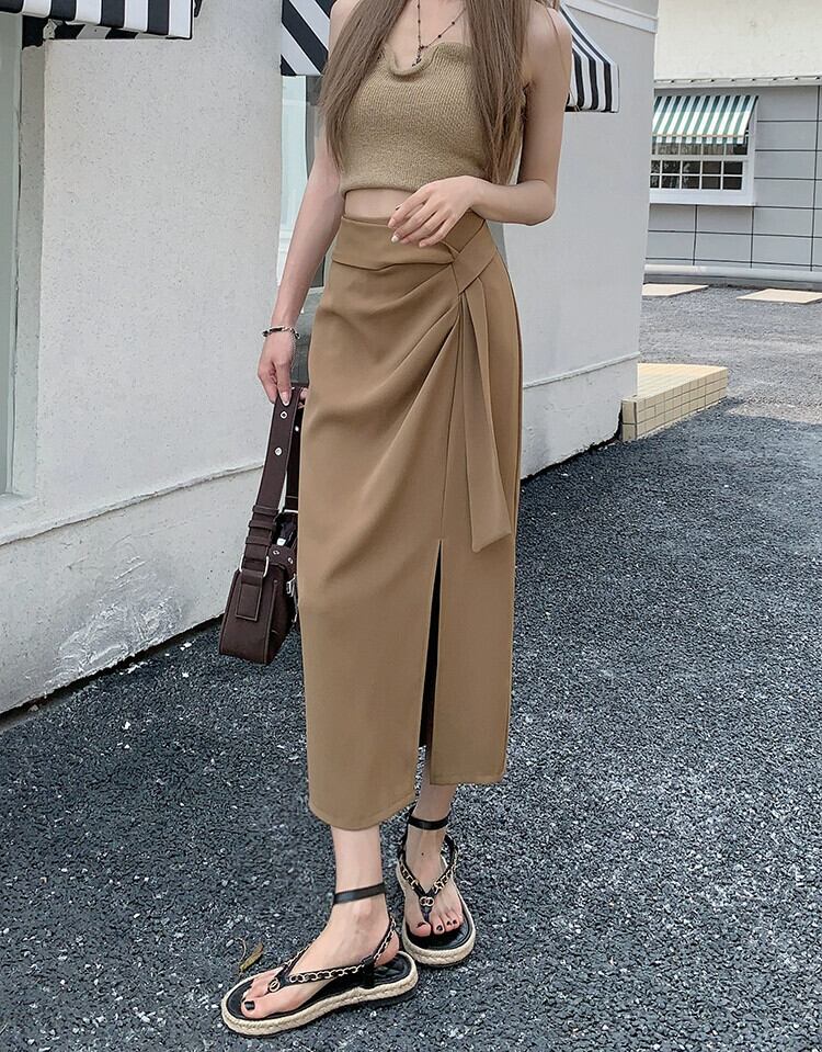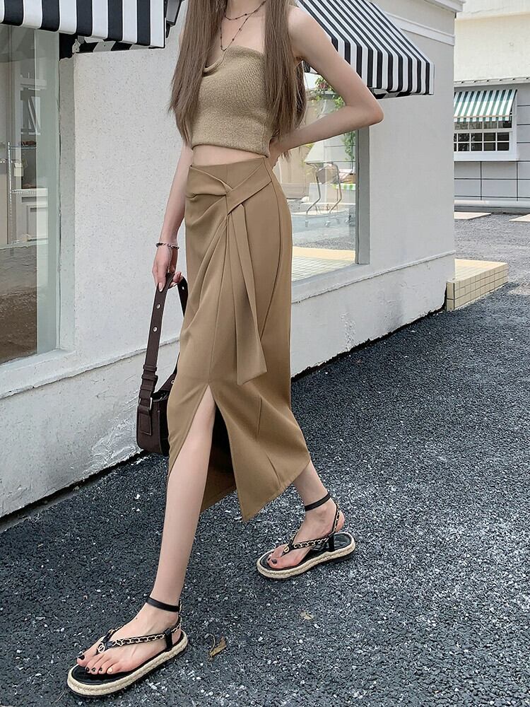カーキスーツスカートレディースハイウエストAラインスカート夏のハイエンドデザインセンスニッチミッドレングスヒップスカート ハイウェスト サマー 夏物 857163082398770