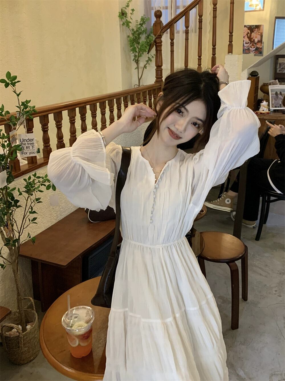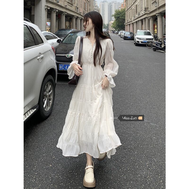 淡いアプリコット色の長袖ワンピース レディース 2023年春新作 上質なウエストと細身のロングスカートが優しい着こなし レッド スプリング 春物 8571692321199841