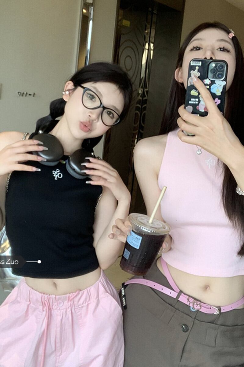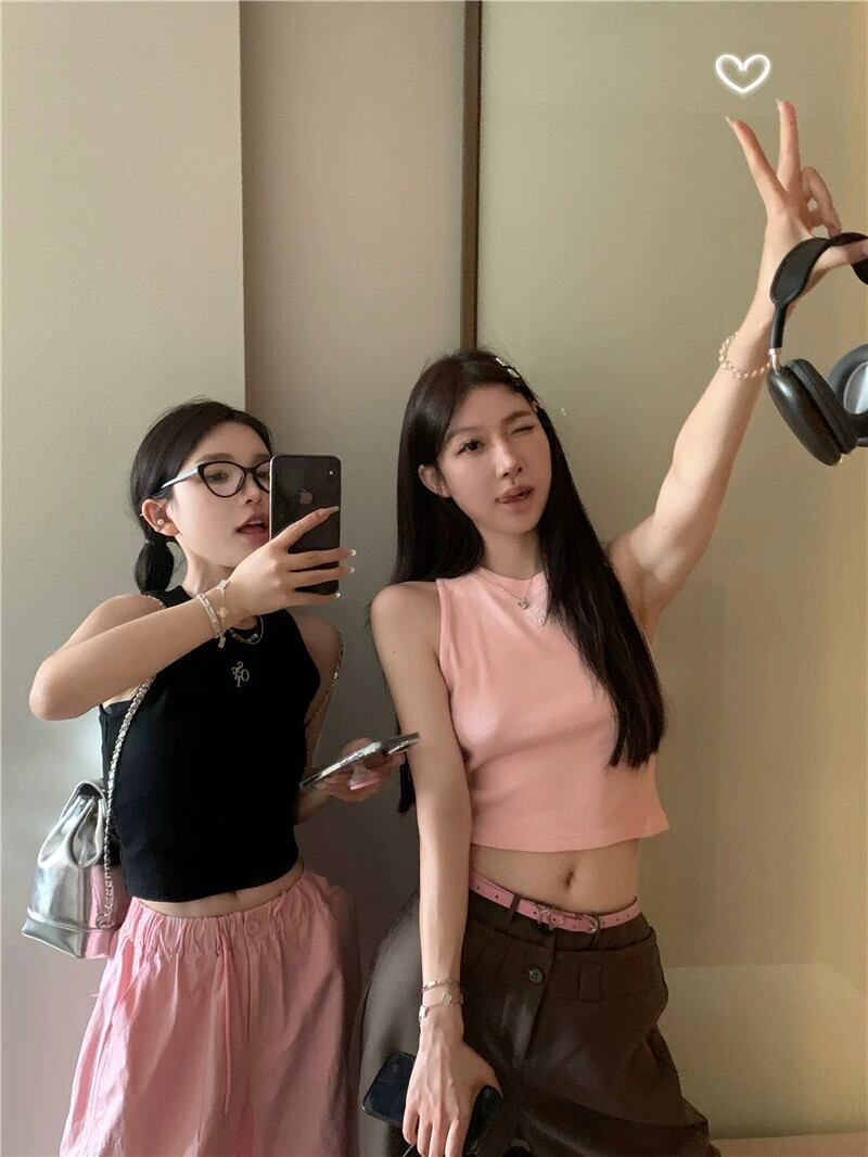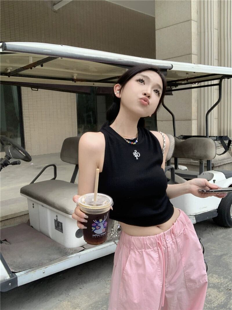 黒ノースリーブベストチョッキ女性のインナーウェア夏 2023 新しいアメリカン甘いセクシーなアウターウェアショートトップ ブラック 大人ガーリー スウィート キュート カジュアル サマー 夏物 8571619790532186