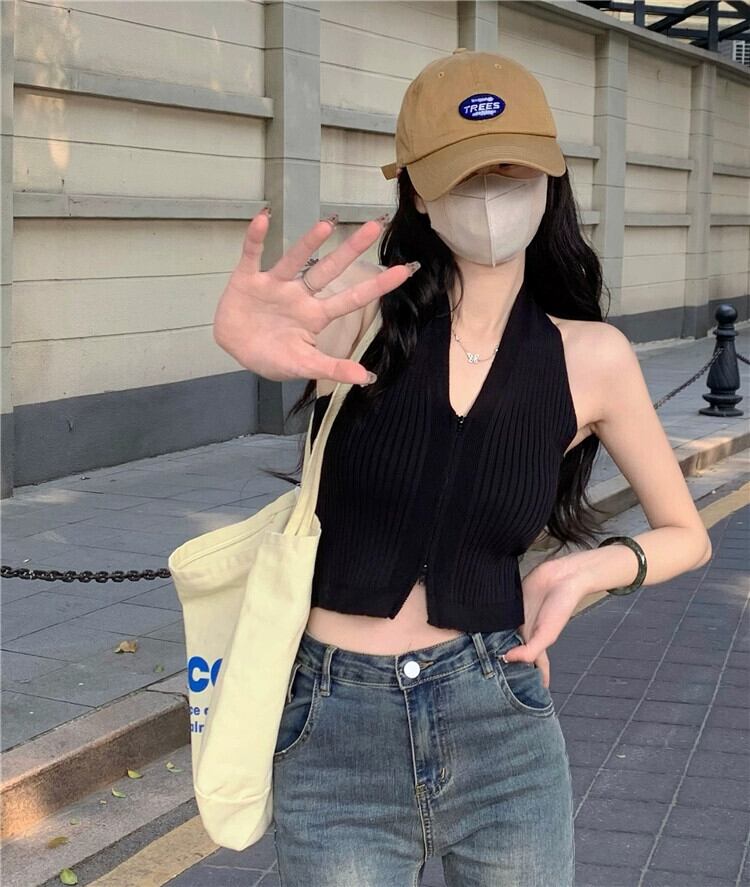 黒ぶら下げネックベスト女性夏底セクシーな甘いアメリカンレトロノースリーブショートトップアウター ブラック 大人ガーリー スウィート キュート カジュアル サマー 夏物 8571690283420399