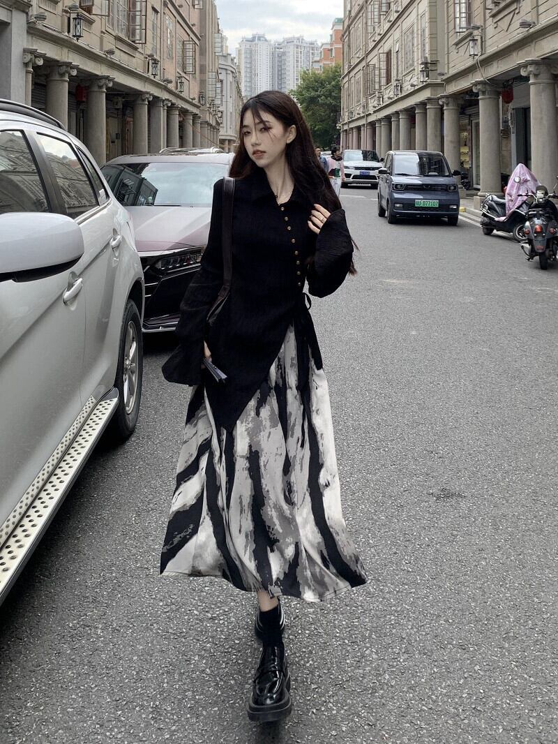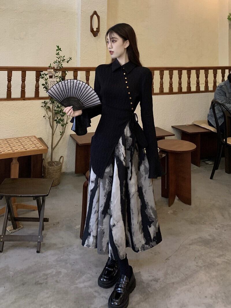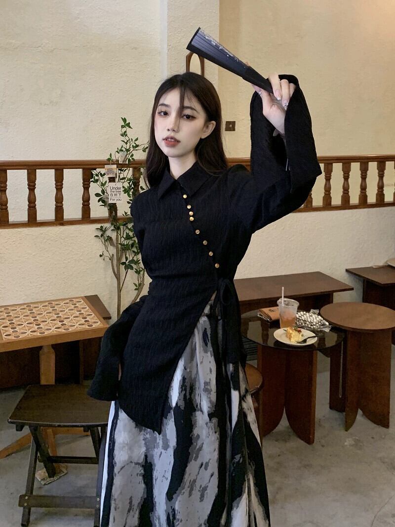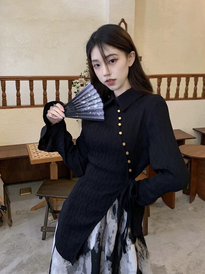 黒の長袖Tシャツレディース2023春の新しいデザインセンスニッチでユニークでシックな不規則なナショナルウィンドトップ ロング ブラック スプリング 春物 85716253158417