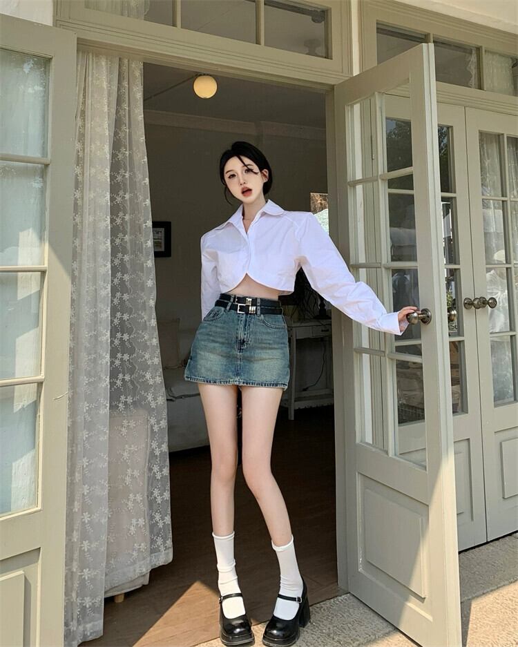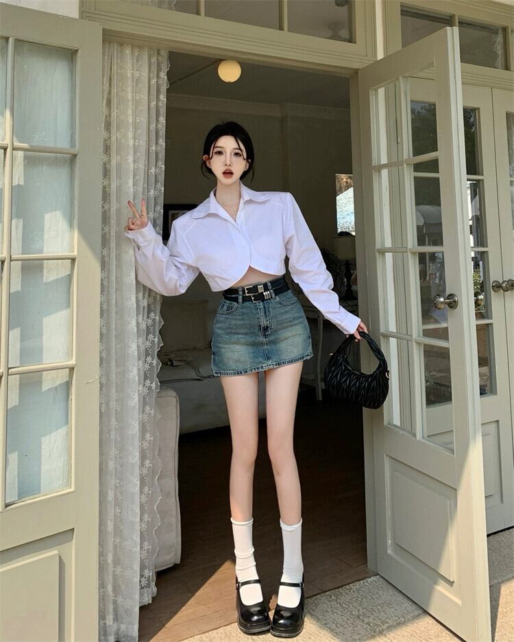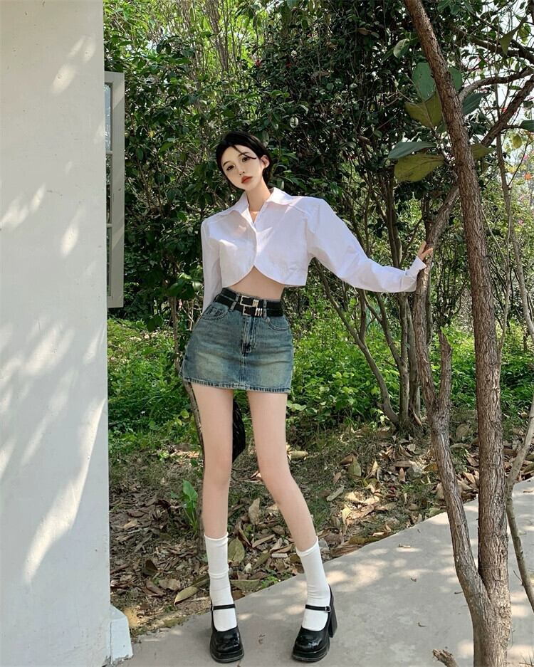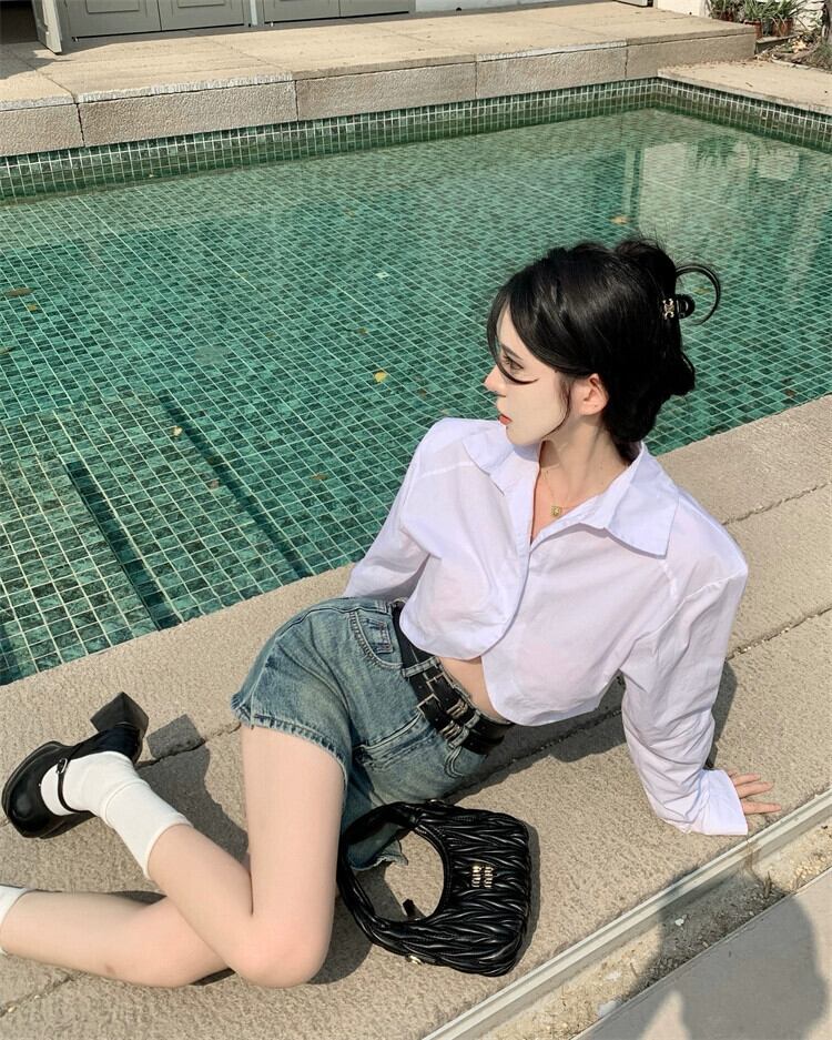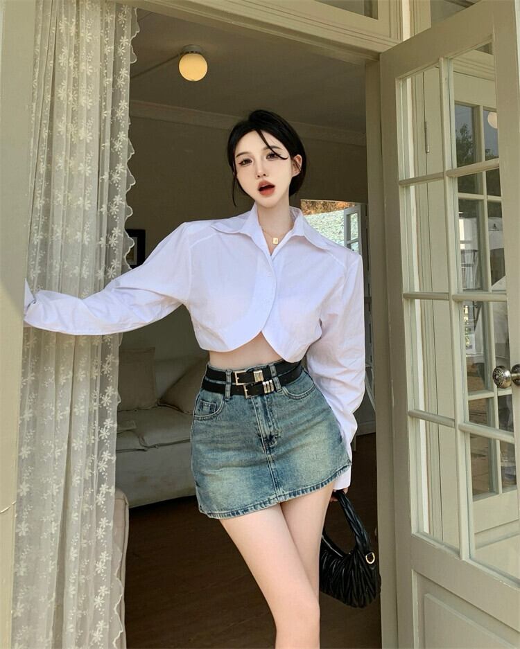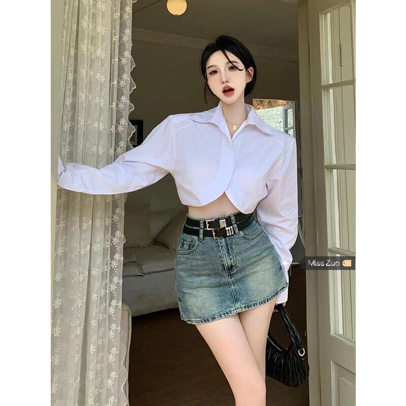 白い長袖ショートシャツレディース2023春の新しいデザインセンスニッチでユニークでシックな不規則なトップス ロング ホワイト スプリング 春物 8571654591697296