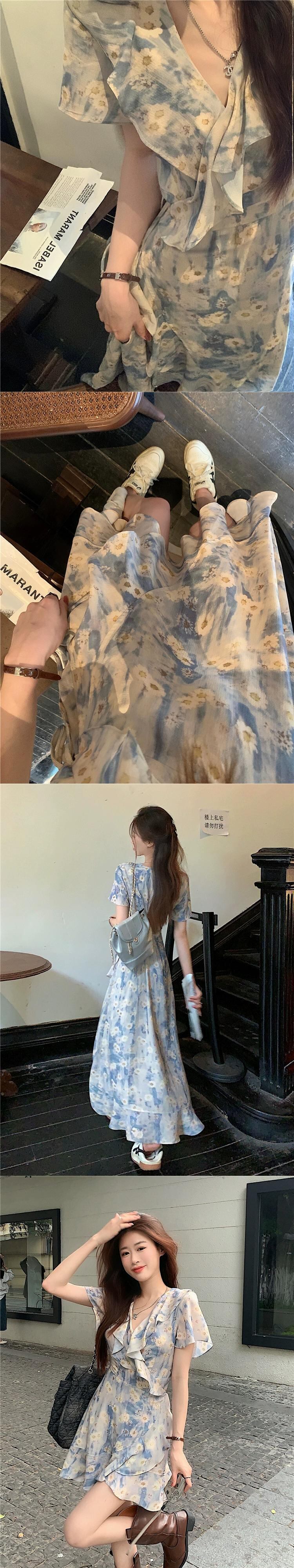 半袖花柄ドレスレディース 2023 夏の新しいニッチデザインフレンチ優しいフリル V ネックロングスカート サマー 夏物 Vネック 8571635691133689