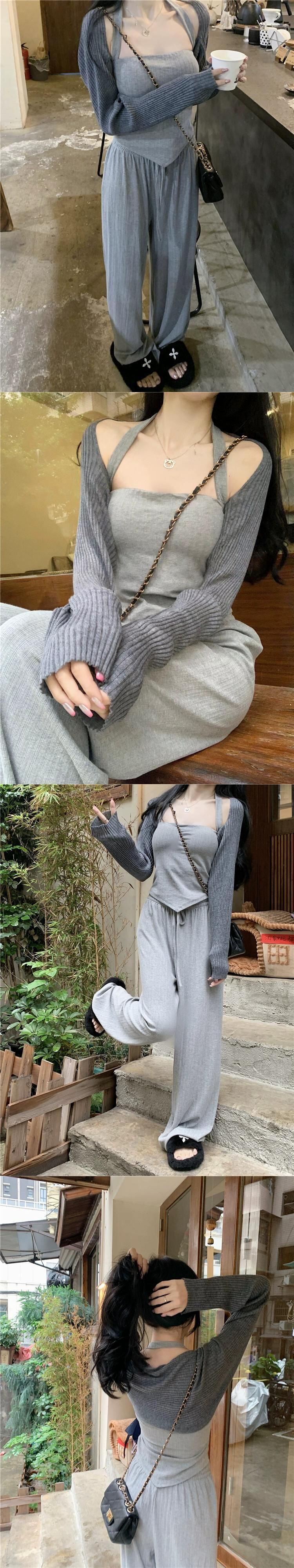 色:ダークグレーのカーディガン,ベージュカーディガン,フラワーグレースリング,オートミールスリング,フローラルグレーパンツ,オートミールパンツ
