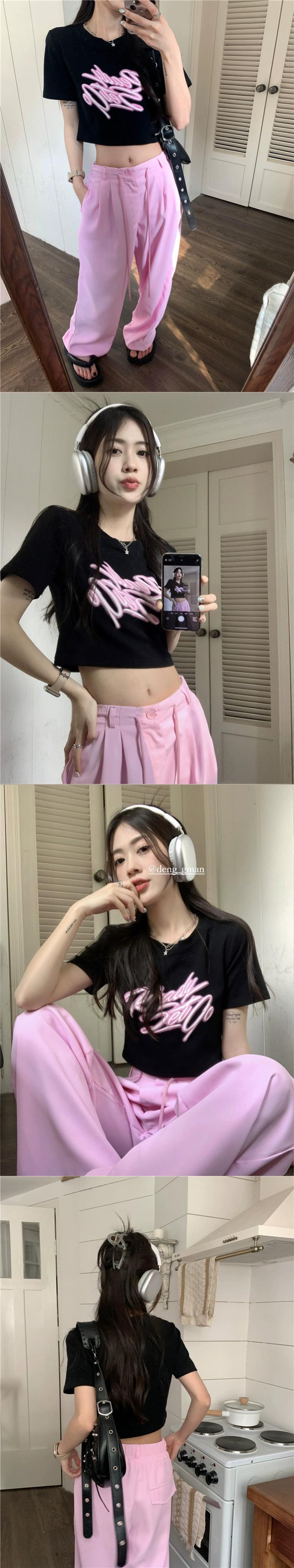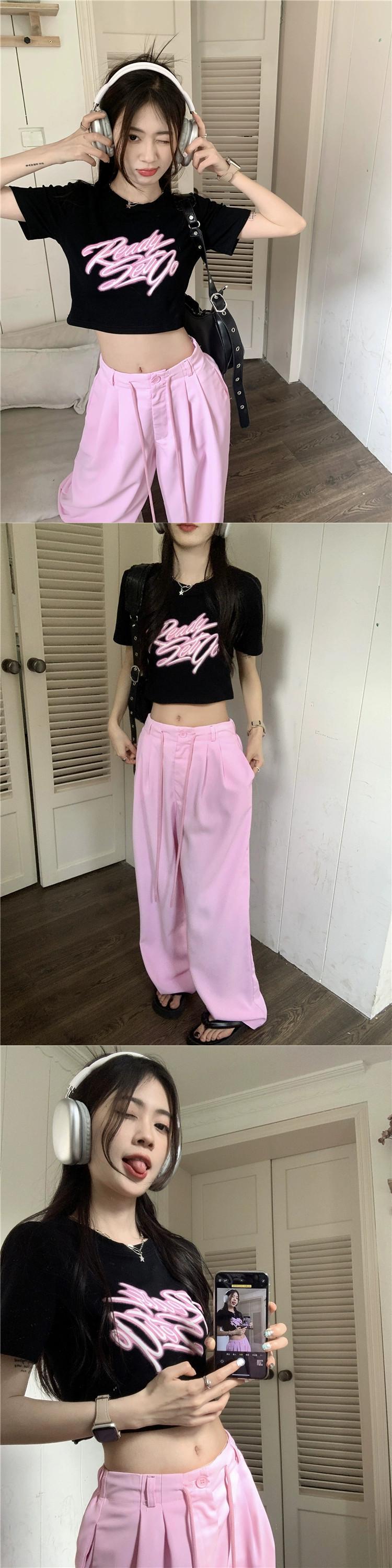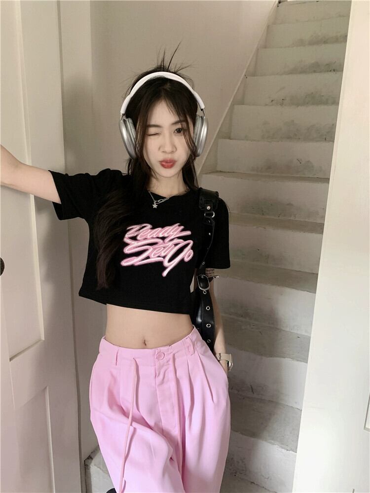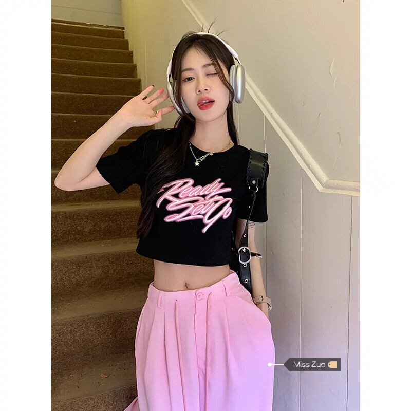 黒フロントショルダー半袖 Tシャツ女性小男性夏 2023 新しいアメリカンレトロシックな甘くてスパイシーなショートトップ ブラック 大人ガーリー スウィート キュート カジュアル サマー 夏物 8571610979713349