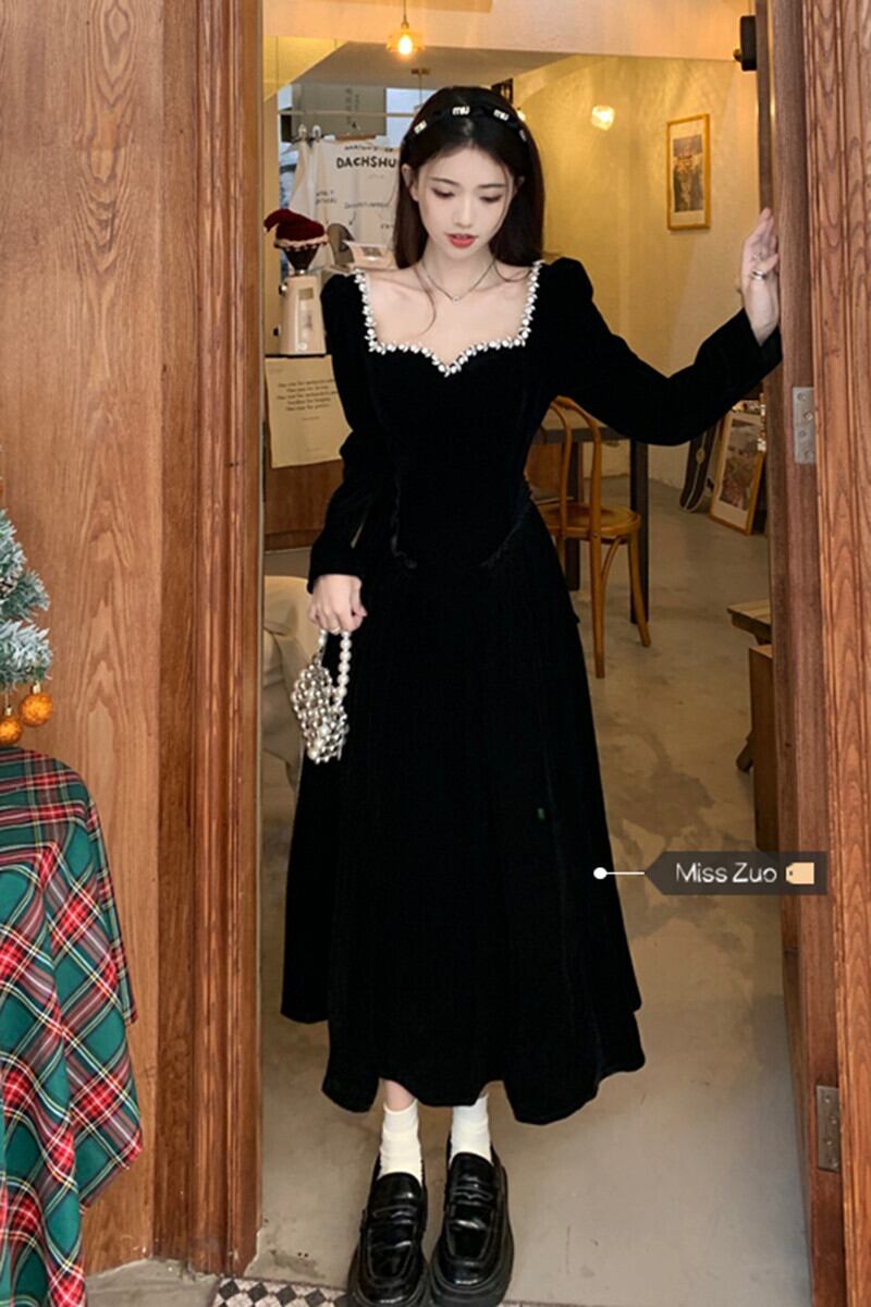 黒ベルベットドレスレディース秋冬年シャツフランス気質高級感インナースクエアカラーロングスカート ブラック オータム 秋物 ウィンター 冬物 スクウェア 8571628364830621