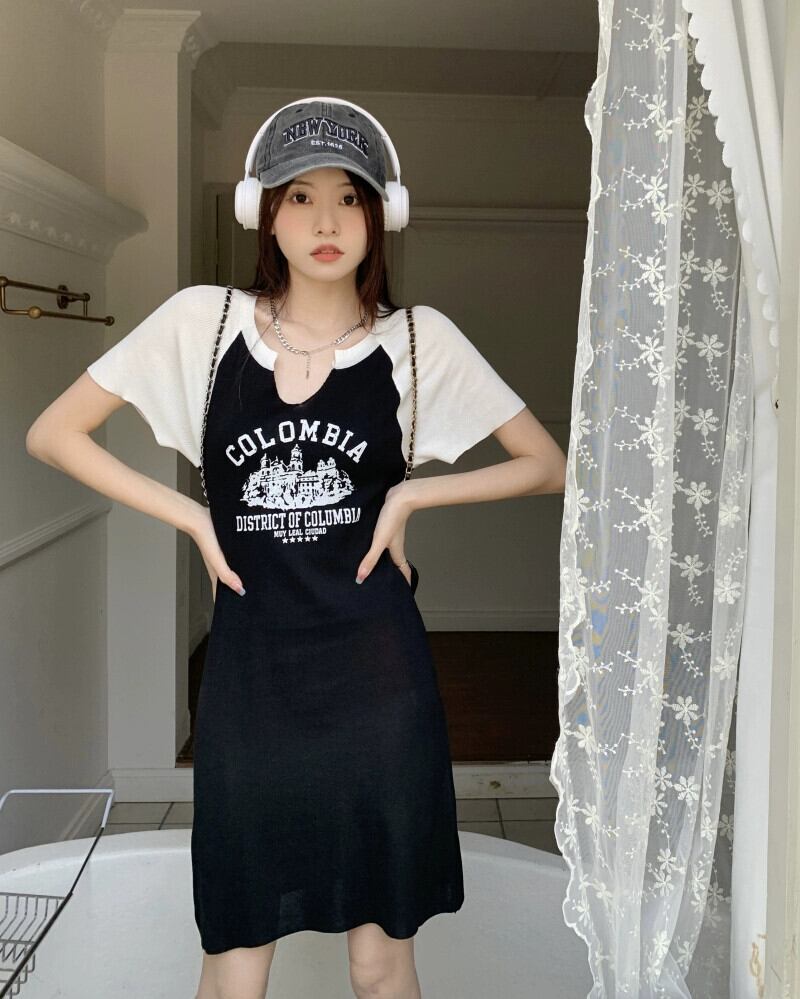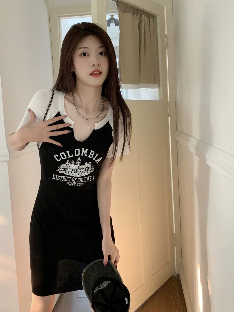 黒ニット T シャツドレス女性小男夏 2023 新しい甘いデザインセンスニッチショートスカート ブラック 大人ガーリー スウィート キュート カジュアル サマー 夏物 Tシャツ 8571626788231342