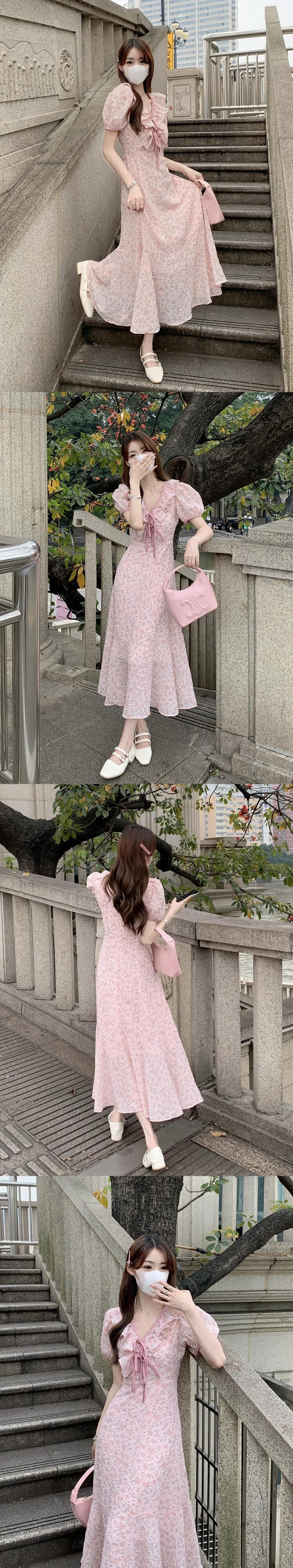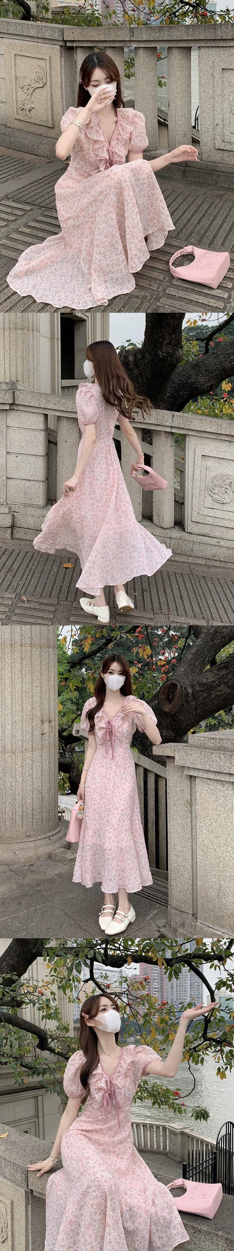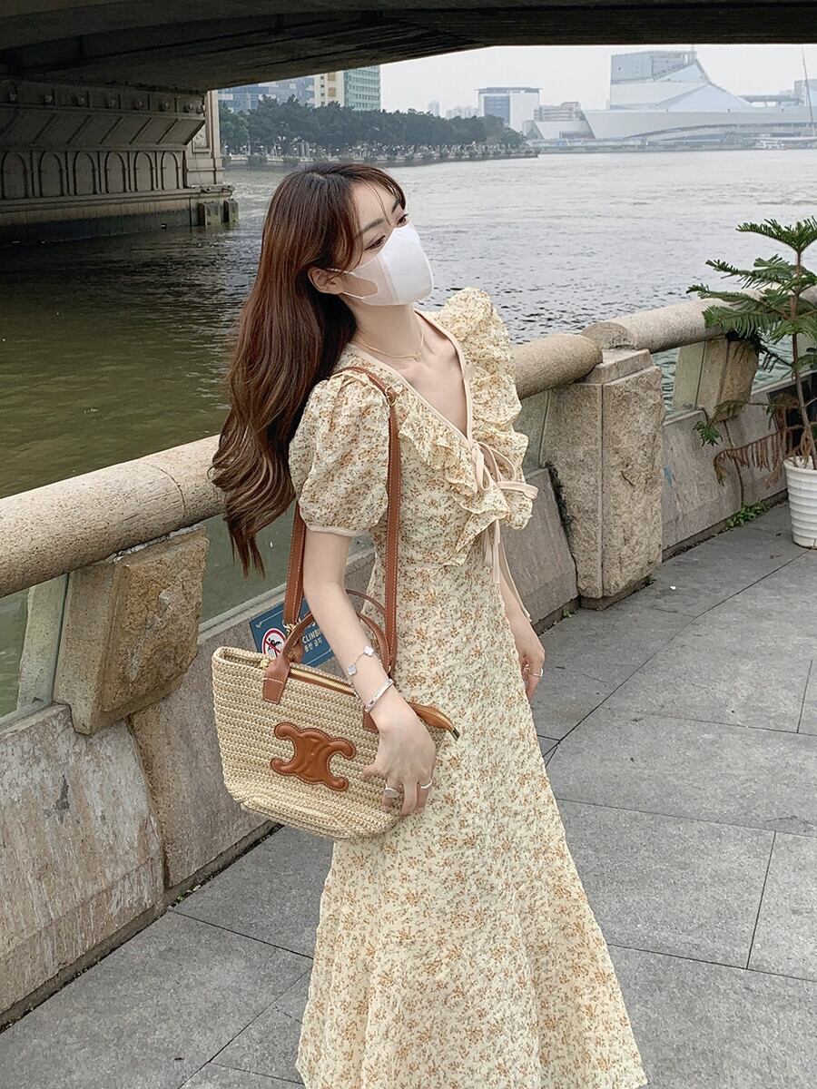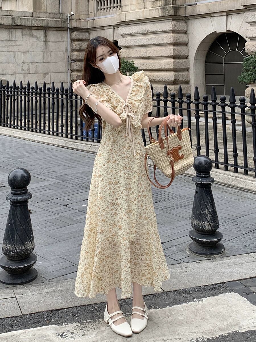黄色の花 V ネックドレス女性の夏フレンチティーブレイクスカート優しいスタイルの気質ウエスト小さなロングスカート サマー 夏物 花柄 Vネック 857167379545462