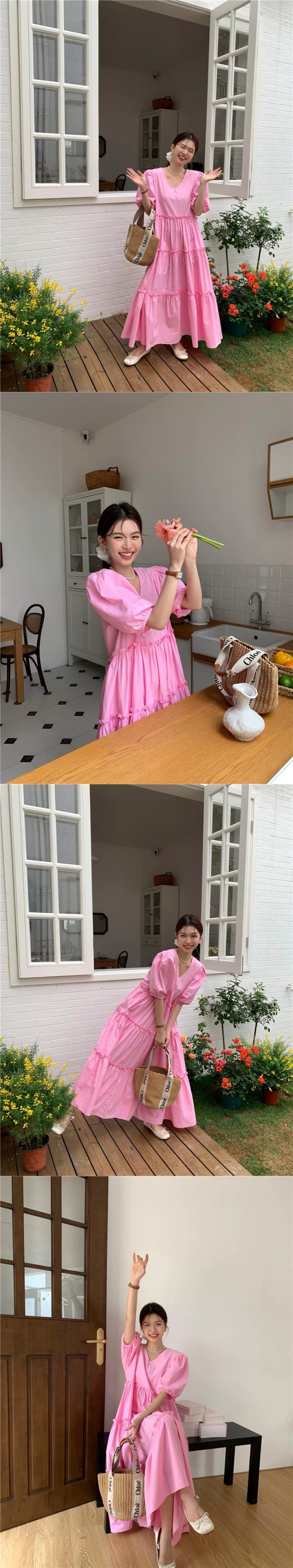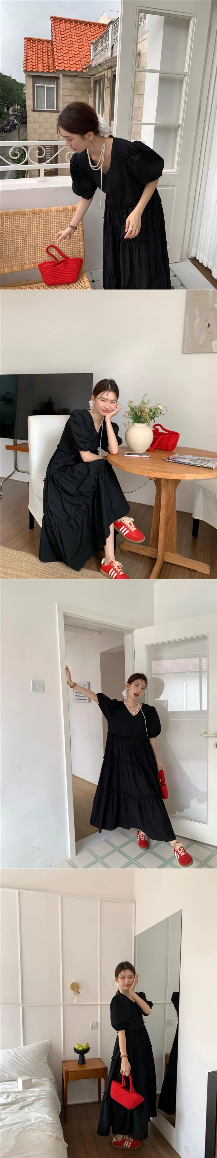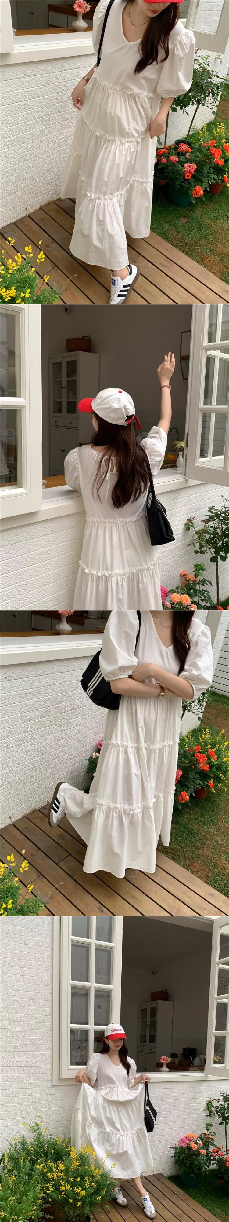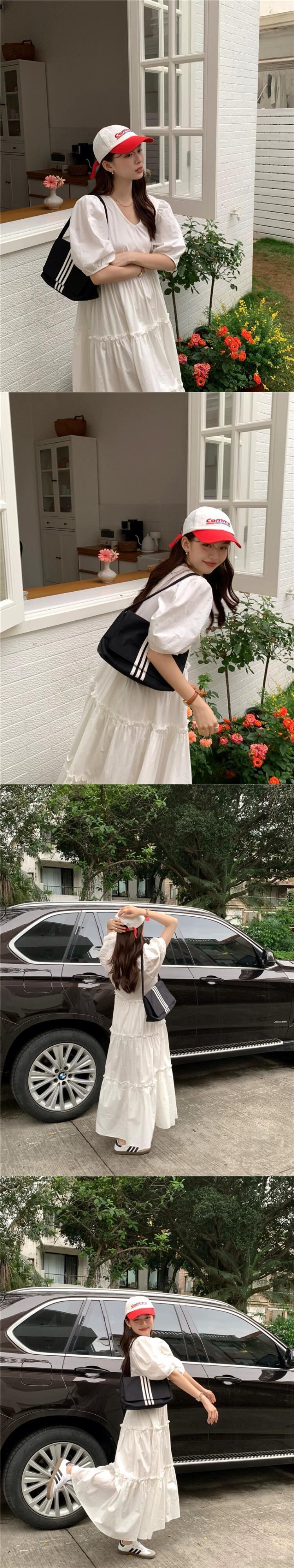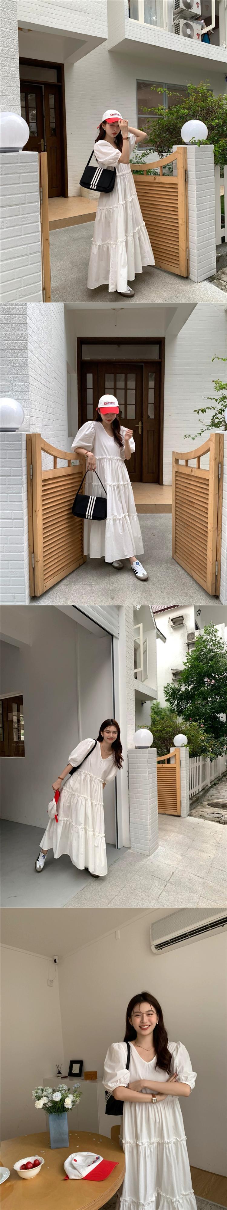 ホワイトパフスリーブドレスレディース2023夏新作洋梨型ゆったりお腹カバーVネックロングスカート サマー 夏物 857163349781157