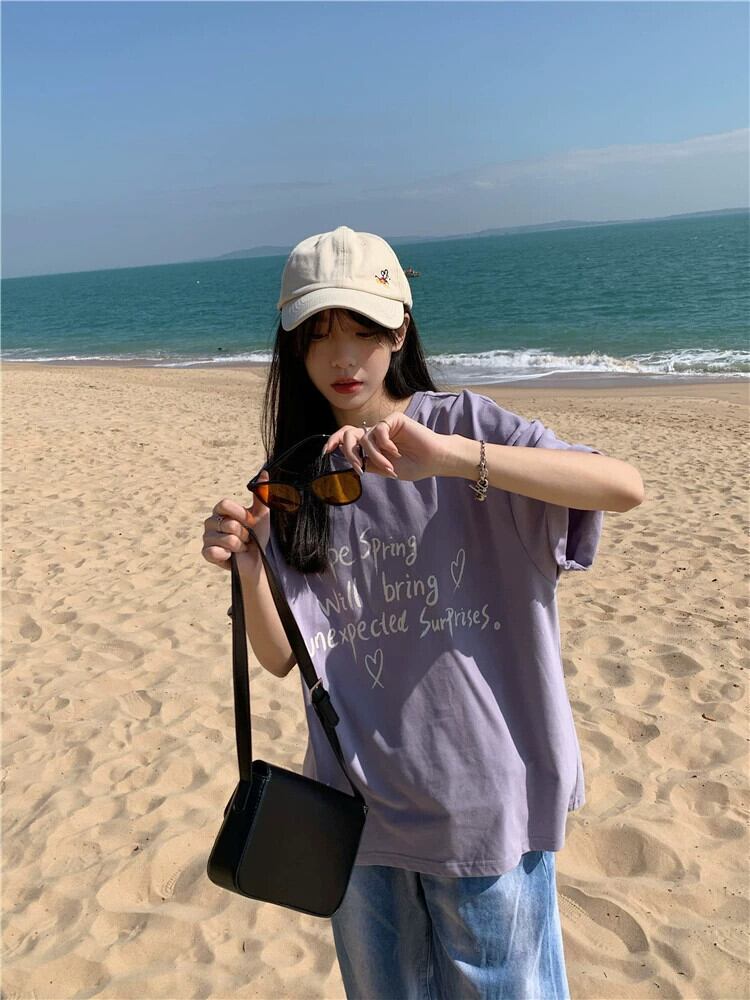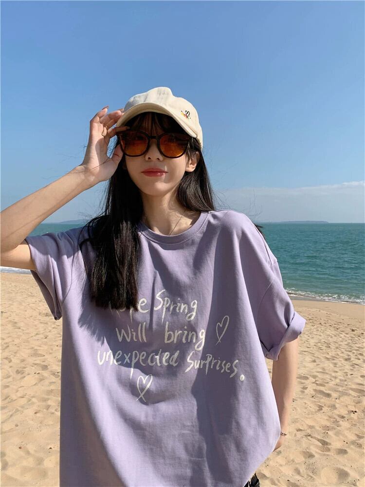 パープル半袖 Tシャツレディース 2023 夏の新デザインセンスニッチルーズ小男カバー腹スリムトップ サマー 夏物 8571639712670043