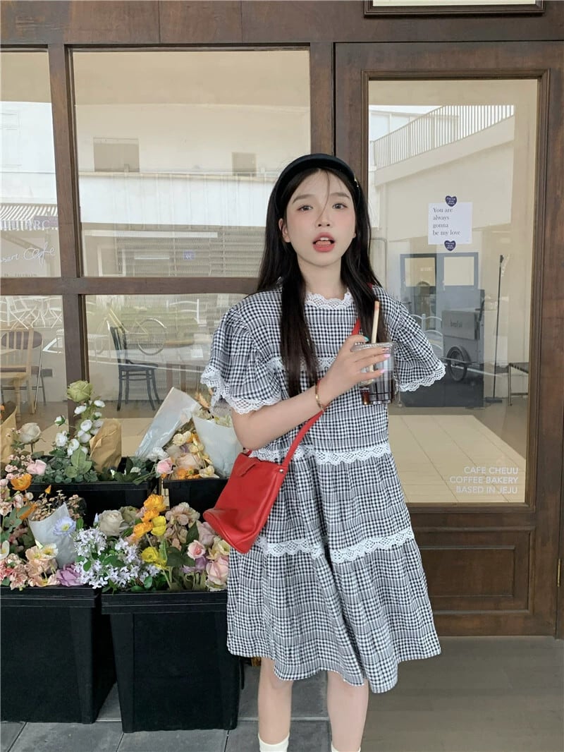 Feifei スリーブチェック柄ドレスレディース夏 2023 優しい風甘い初恋小さな人形スカート 大人ガーリー スウィート キュート カジュアル サマー 夏物 8571638613860413
