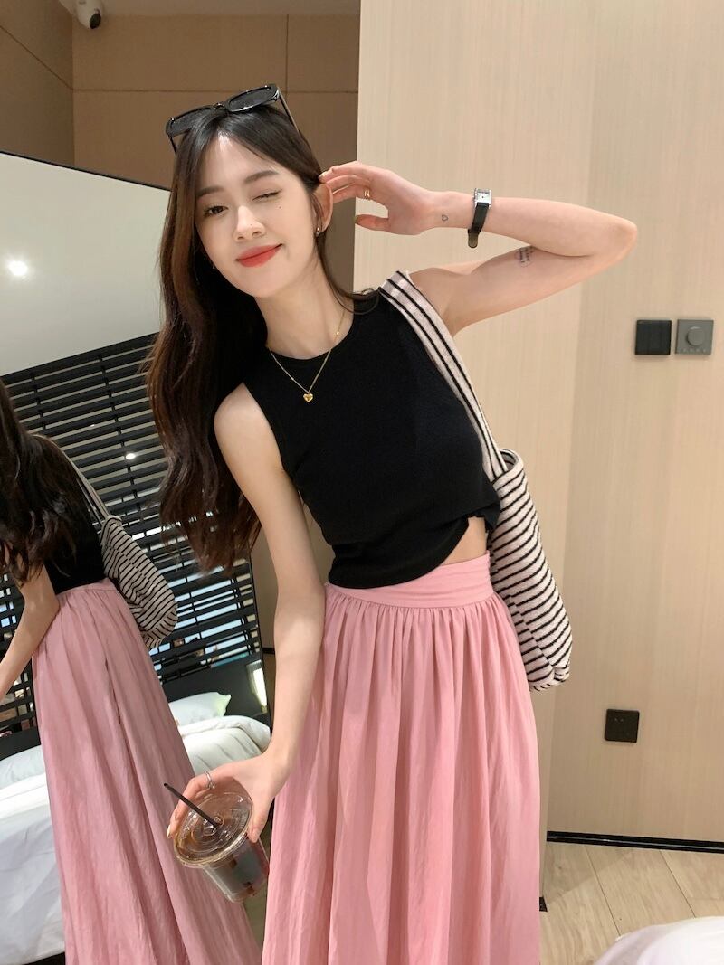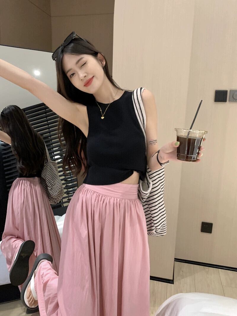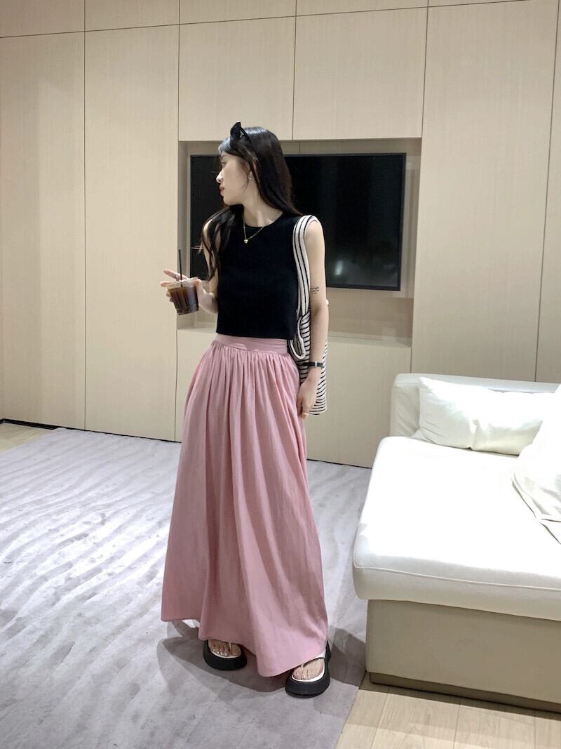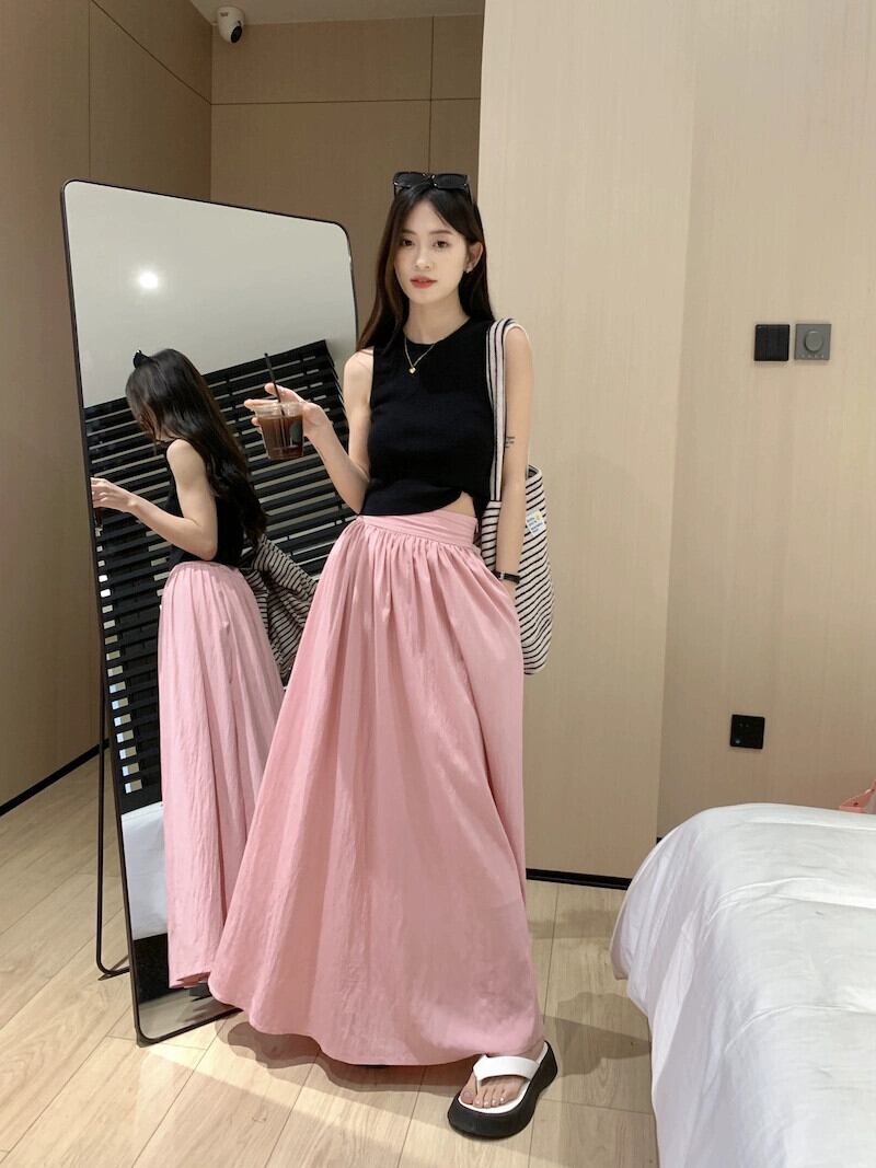 ピンクスカートレディースハイウエストと細いAラインアンブレラスカート2023年夏新作洋梨型足首までのロングスカート ハイウェスト サマー 夏物 8571681826864450