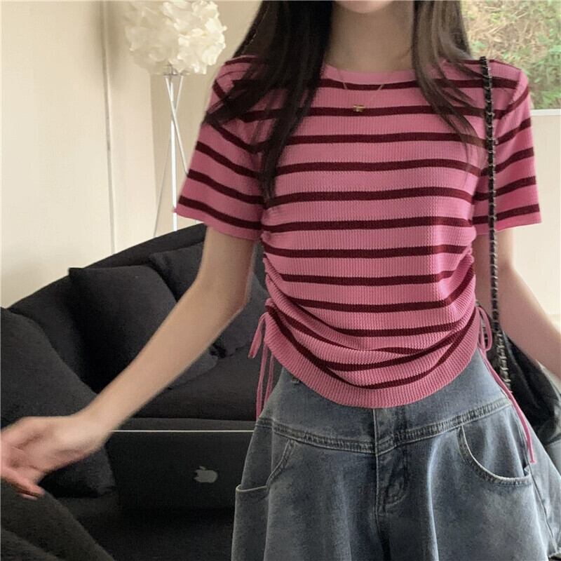 フロントショルダーストライプ半袖 Tシャツ女性小男性夏 2023 新しいスタイルシックでシックな巾着ショートトップ サマー 夏物 8571692647745530