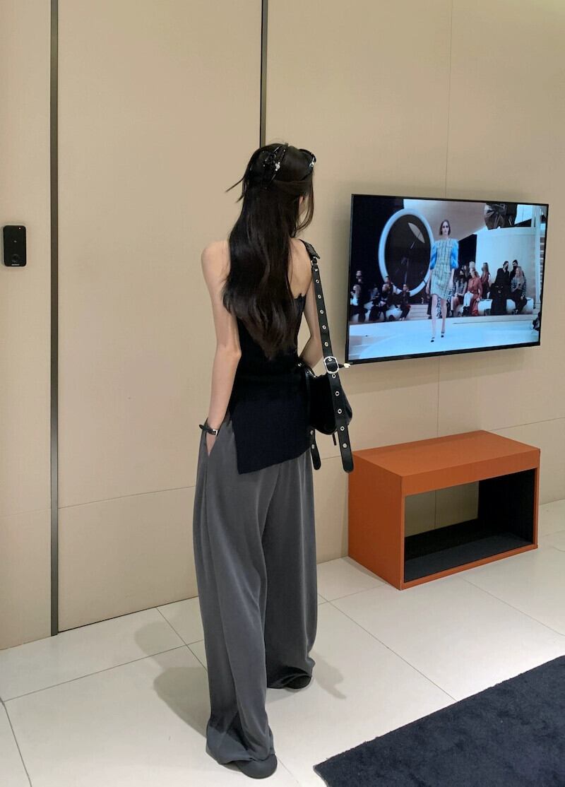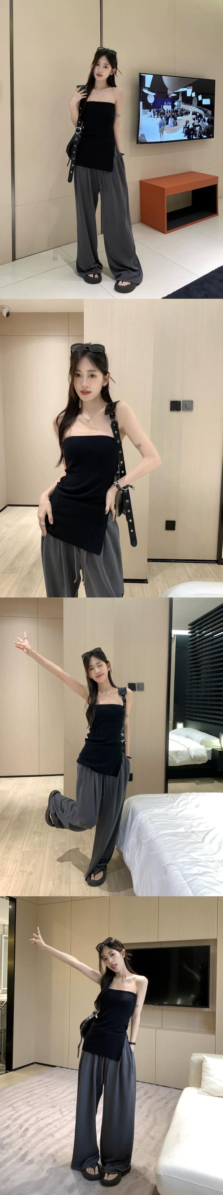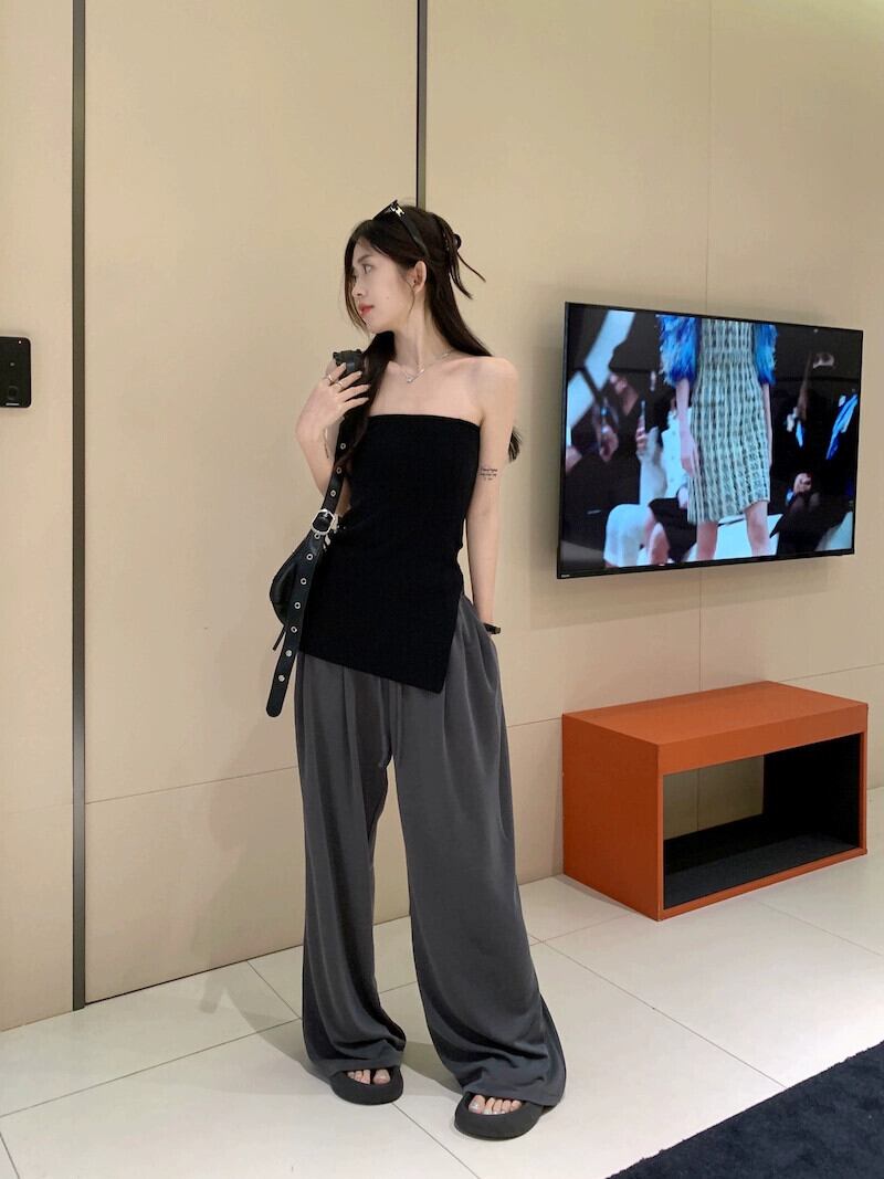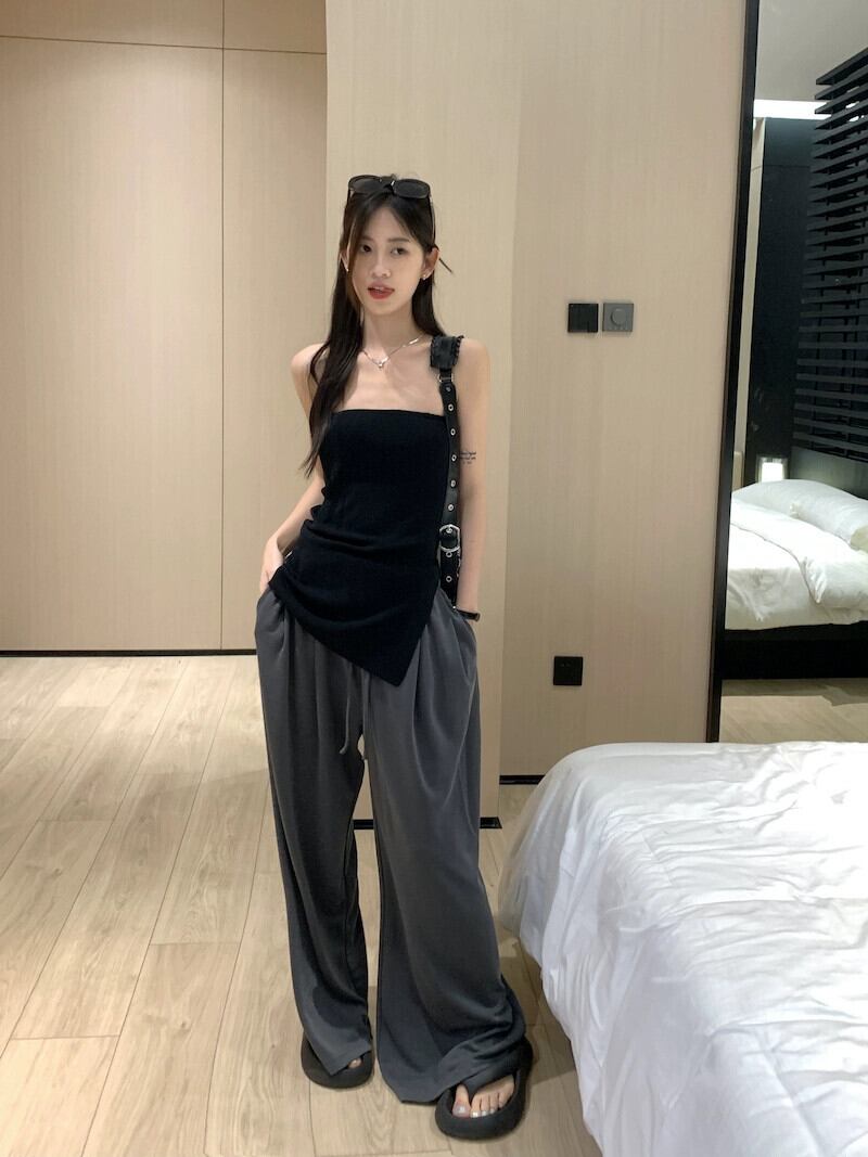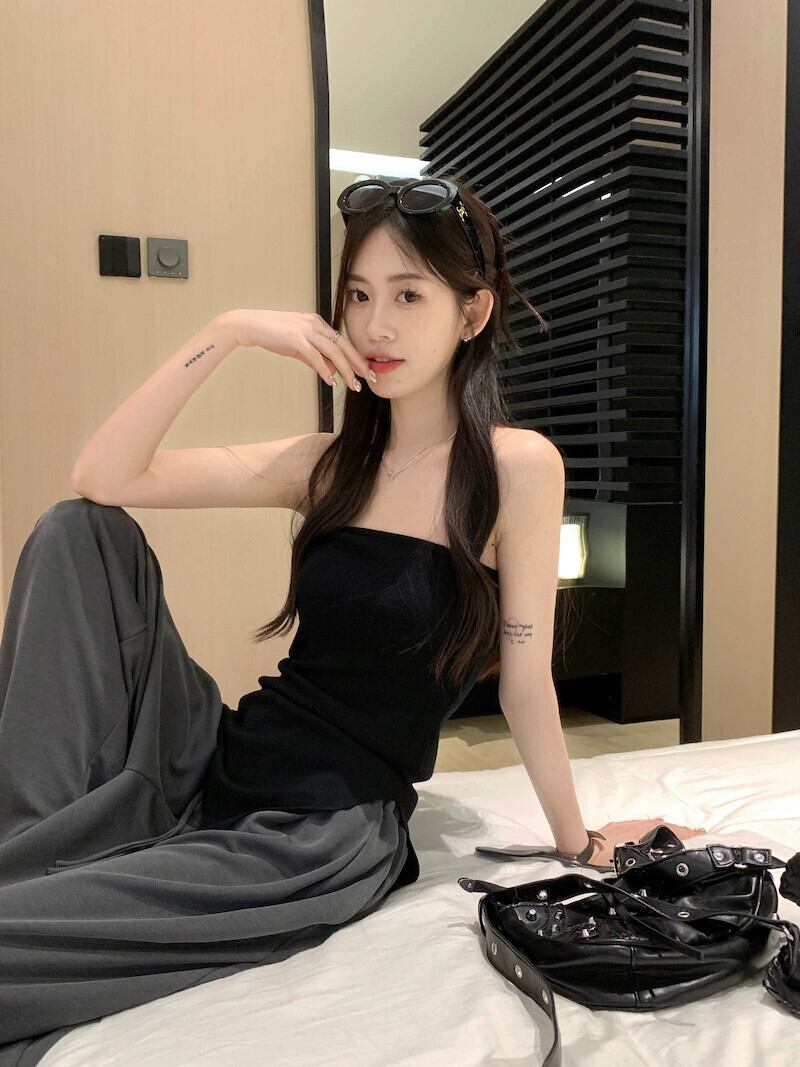 ブラック チューブトップ ベスト レディース アウター 夏 インナー デザイン センス ニッチ ピュア ディザイア スリム スリット ノースリーブ トップ サマー 夏物 8571643972829269