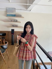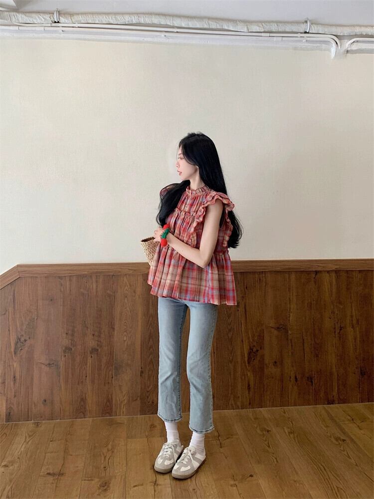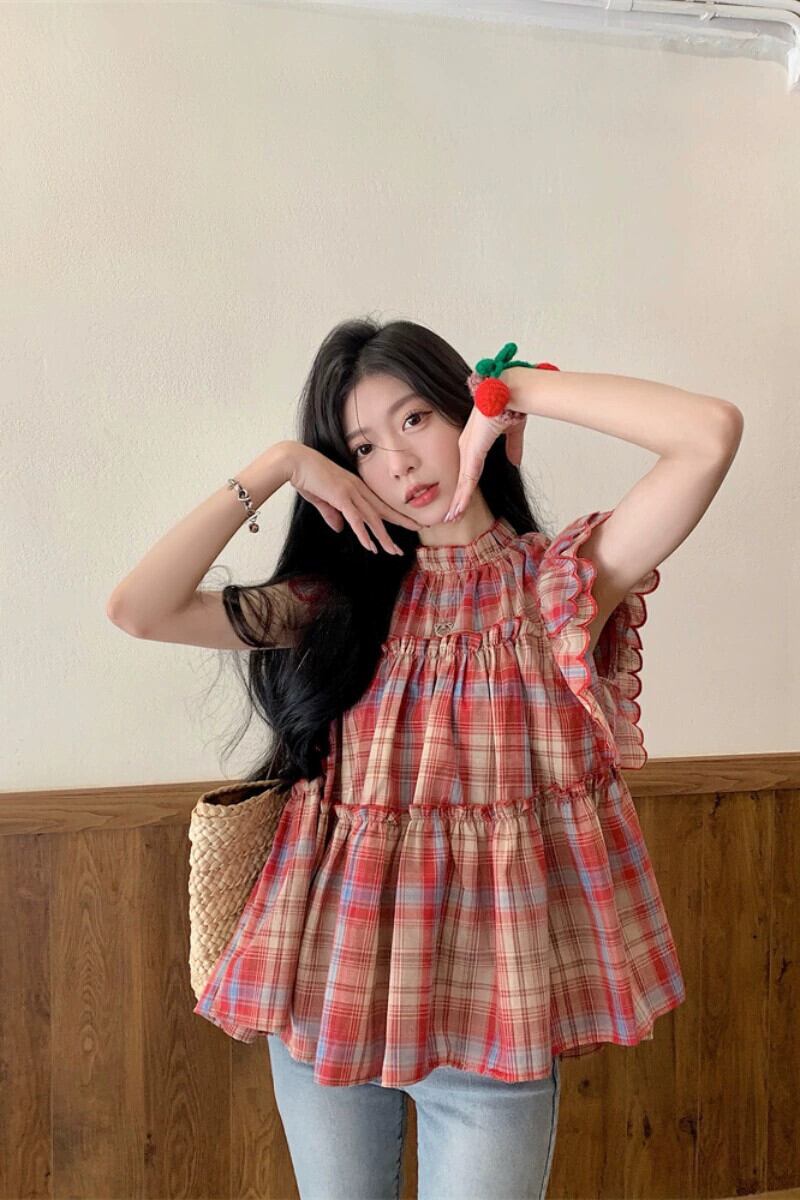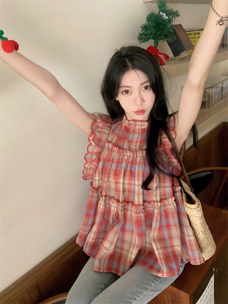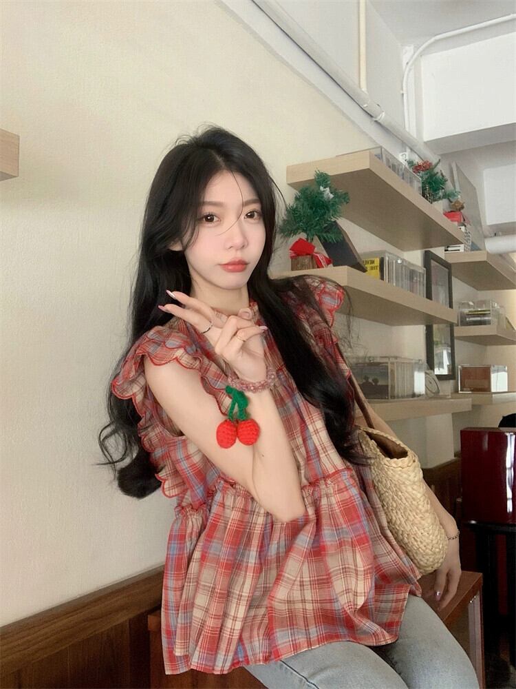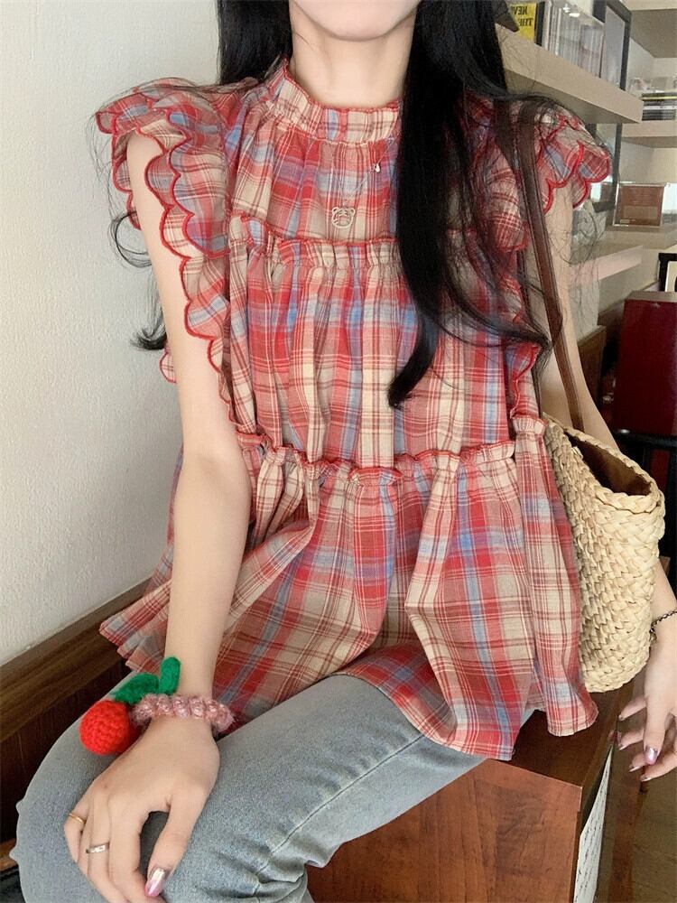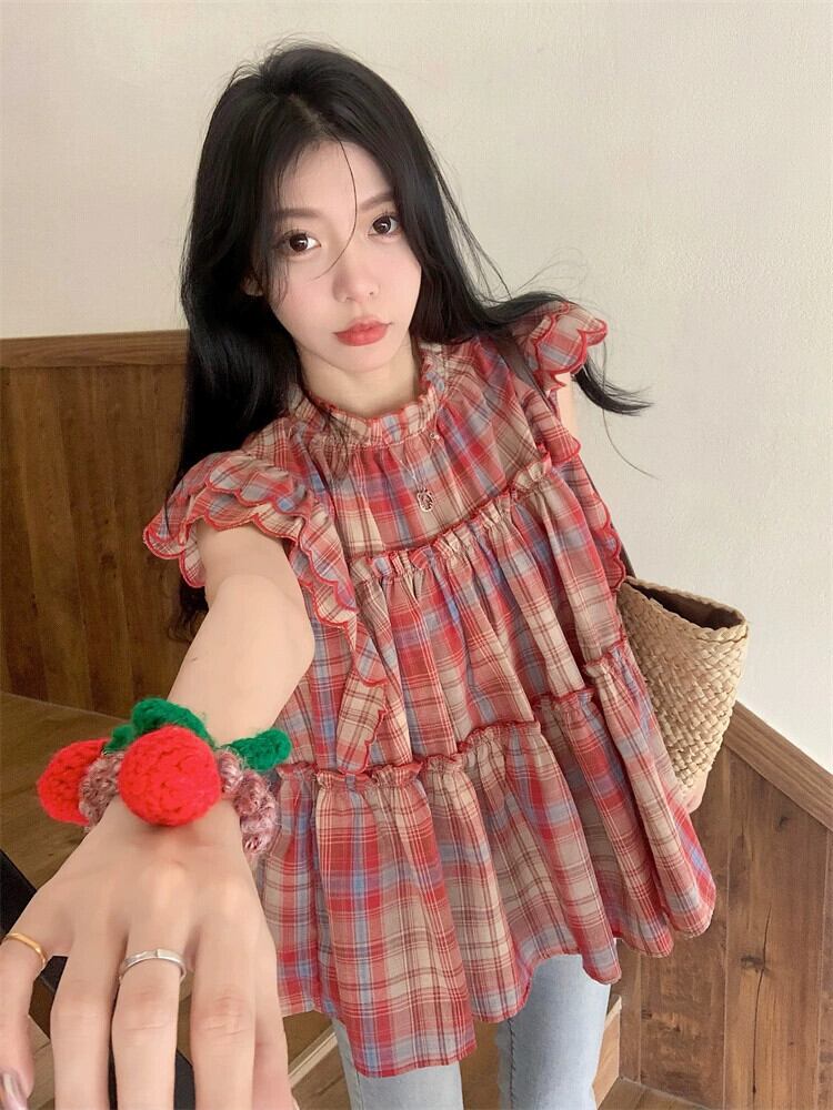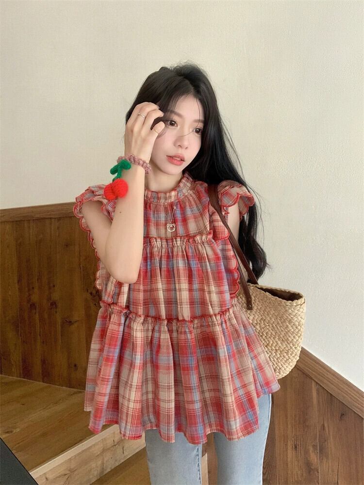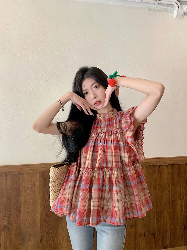 Feifei スリーブドールシャツトップ女性の夏のデザインセンスニッチスイートユニークでシックな小さなチェック柄シャツ 大人ガーリー スウィート キュート カジュアル サマー 夏物 8571666471866720