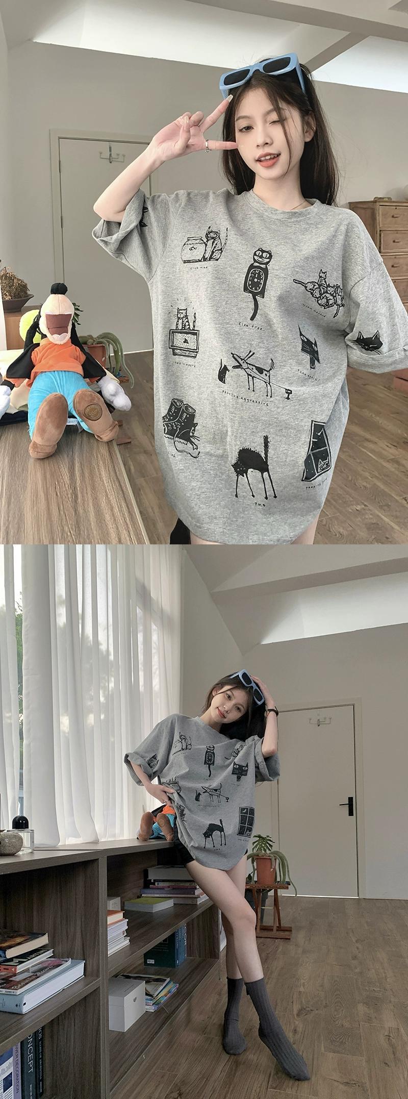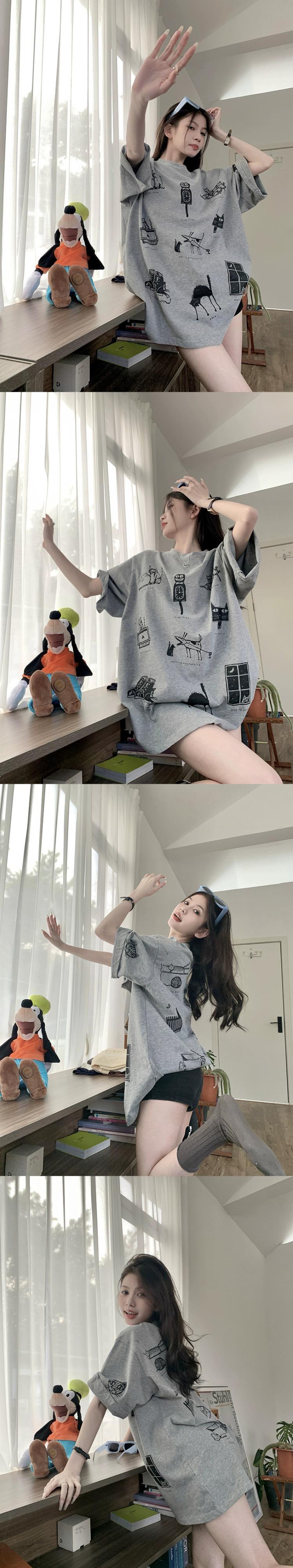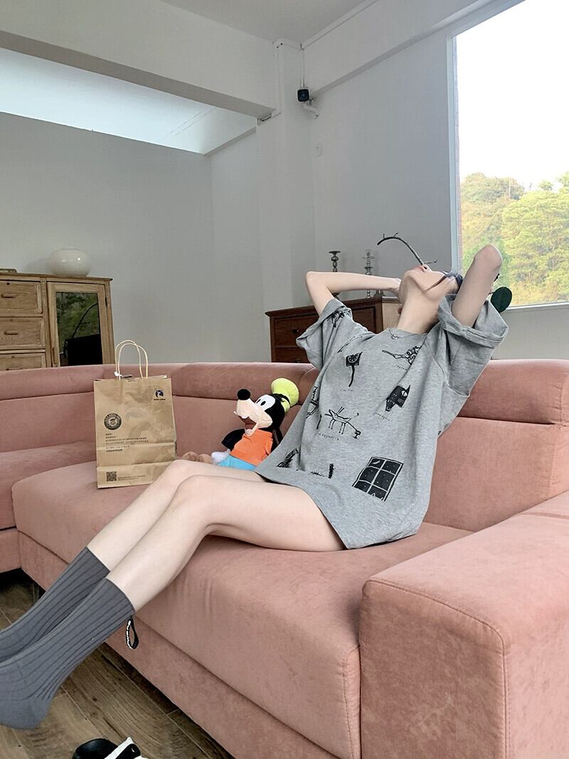 重工業プリントグレー半袖Tシャツレディース夏デザインセンスニッチミドル丈ボトム欠落ルーズトップ サマー 夏物 8571655355158191