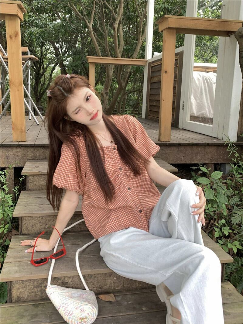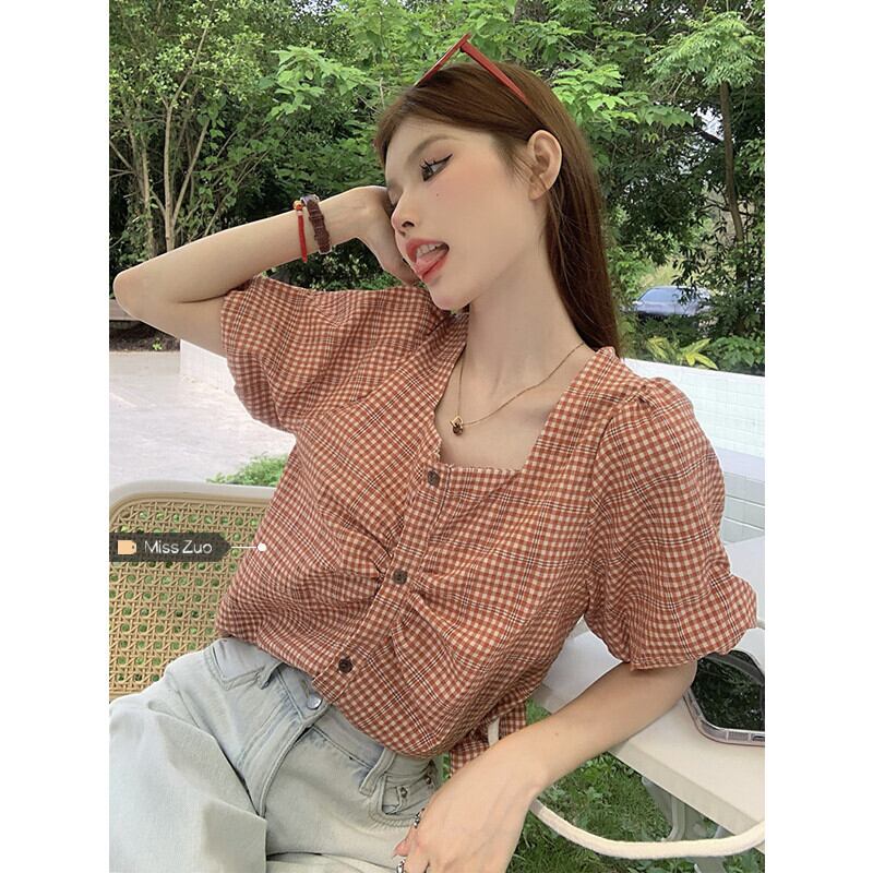 パフスリーブスクエアカラーショートトップレディース2023年夏新作フレンチスタイル優しいシックな半袖チェック柄シャツ サマー 夏物 スクウェア 8571649092155415