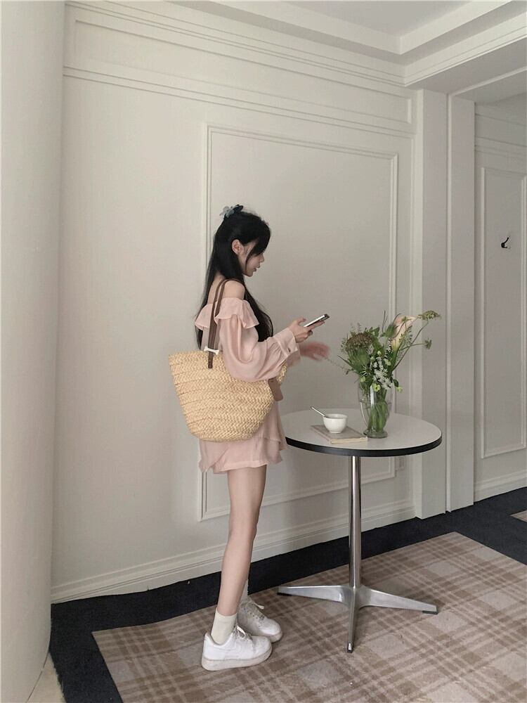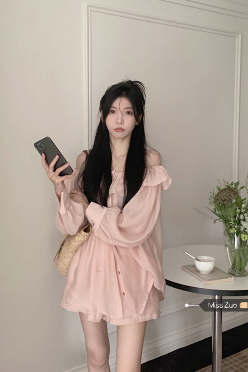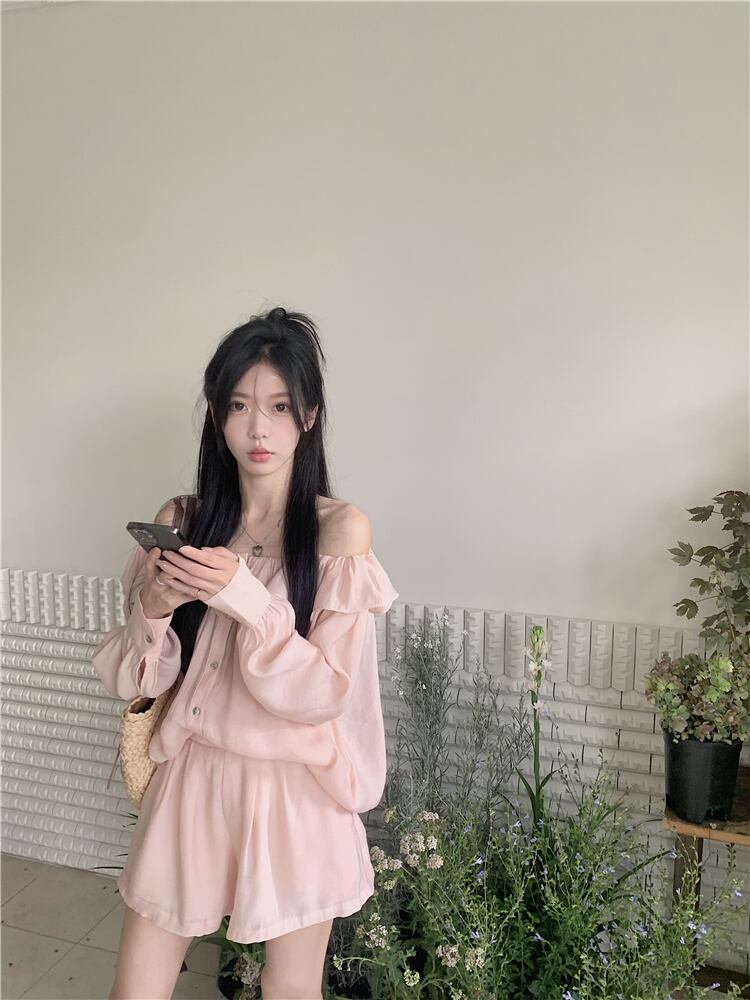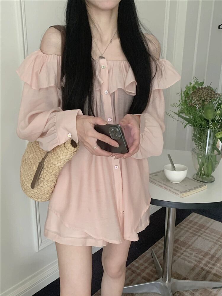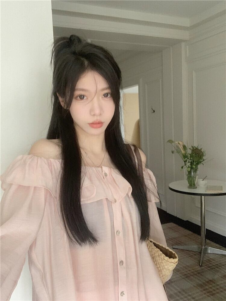 ピンクのワンショルダートップレディースハイエンド2023年春新しいデザインセンスニッチフランス気質長袖シャツ ロング スプリング 春物 8571621431395064