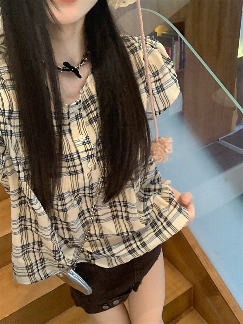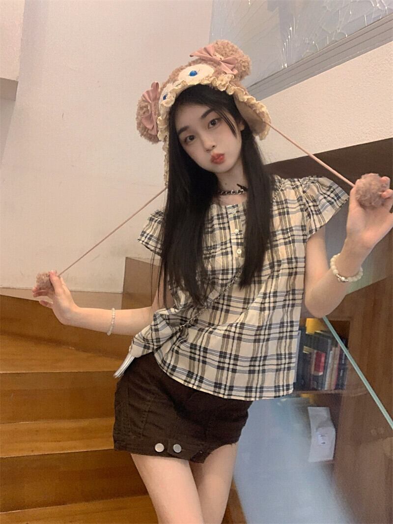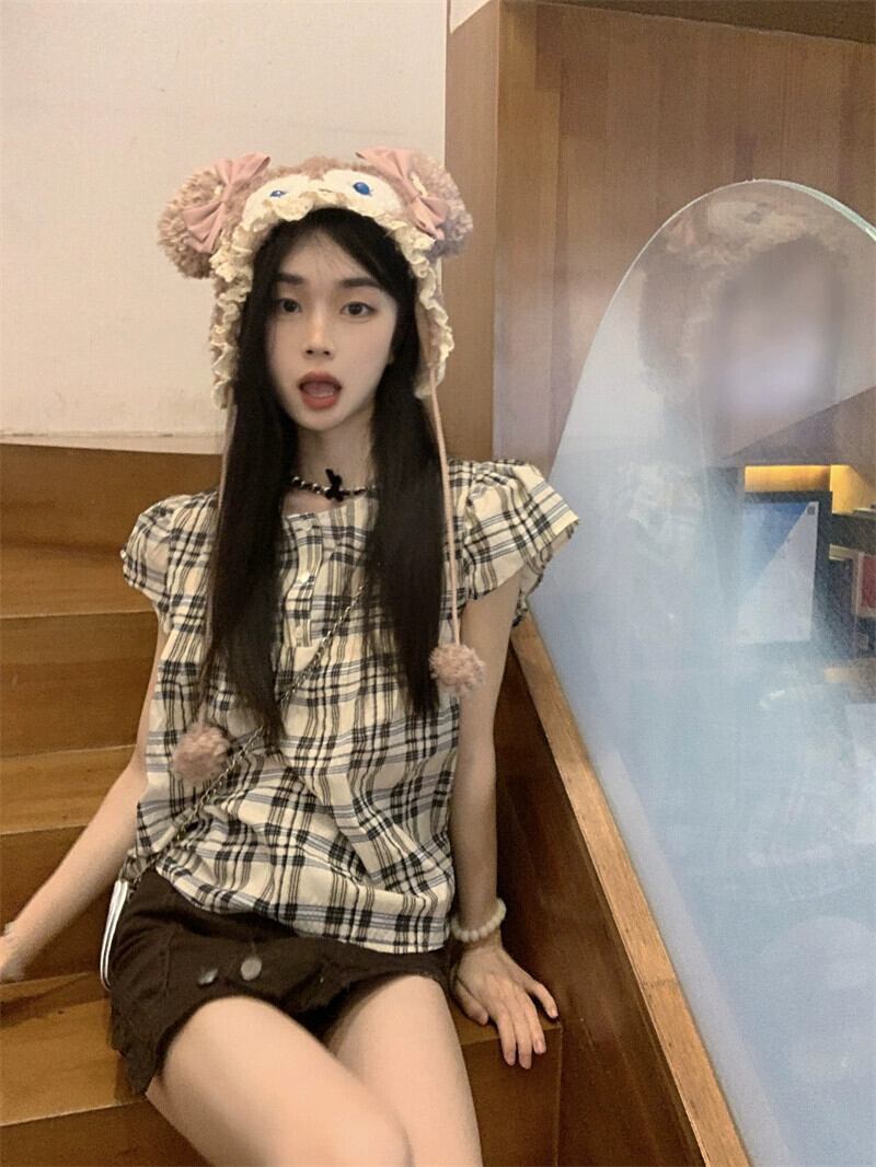 小さなフライングスリーブドールシャツトップ女性の夏のデザインセンスニッチ2023新しいフレンチレトロ甘いチェック柄シャツ 大人ガーリー スウィート キュート カジュアル サマー 夏物 8571617930819167