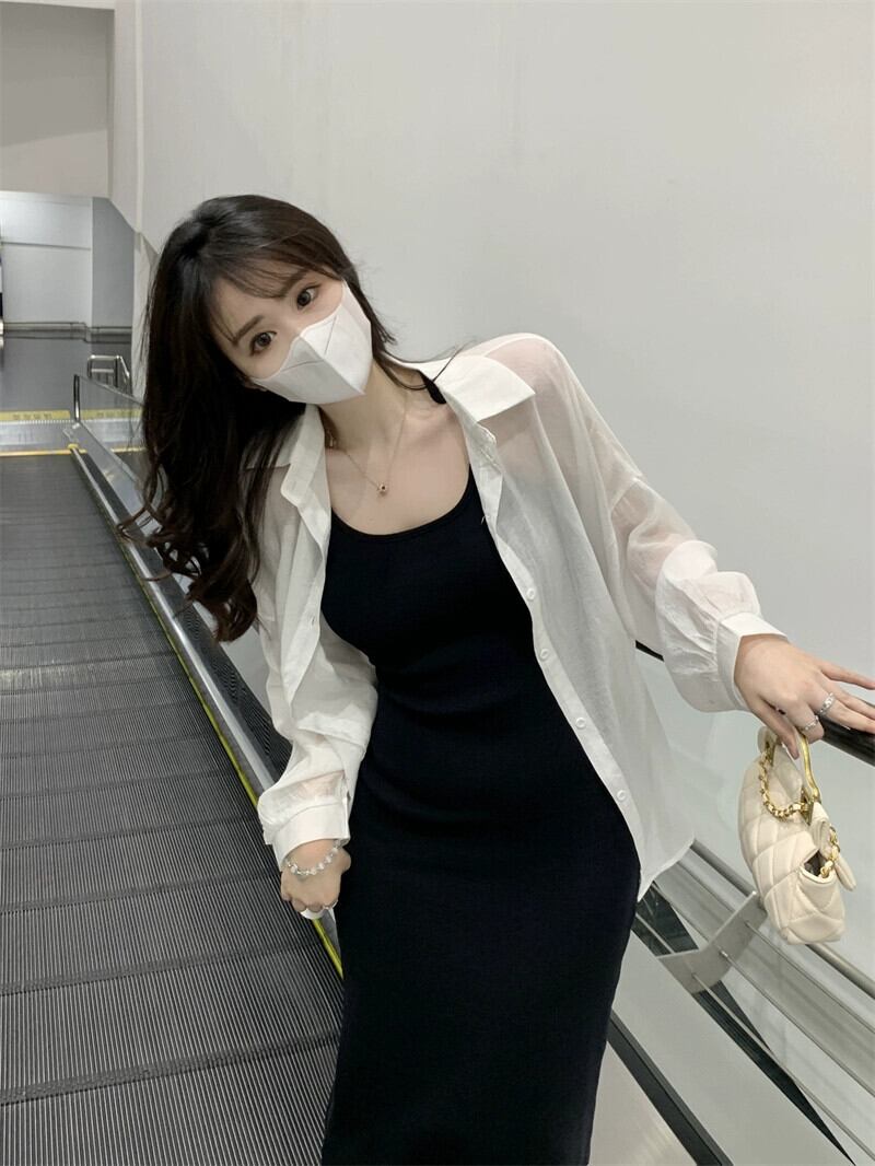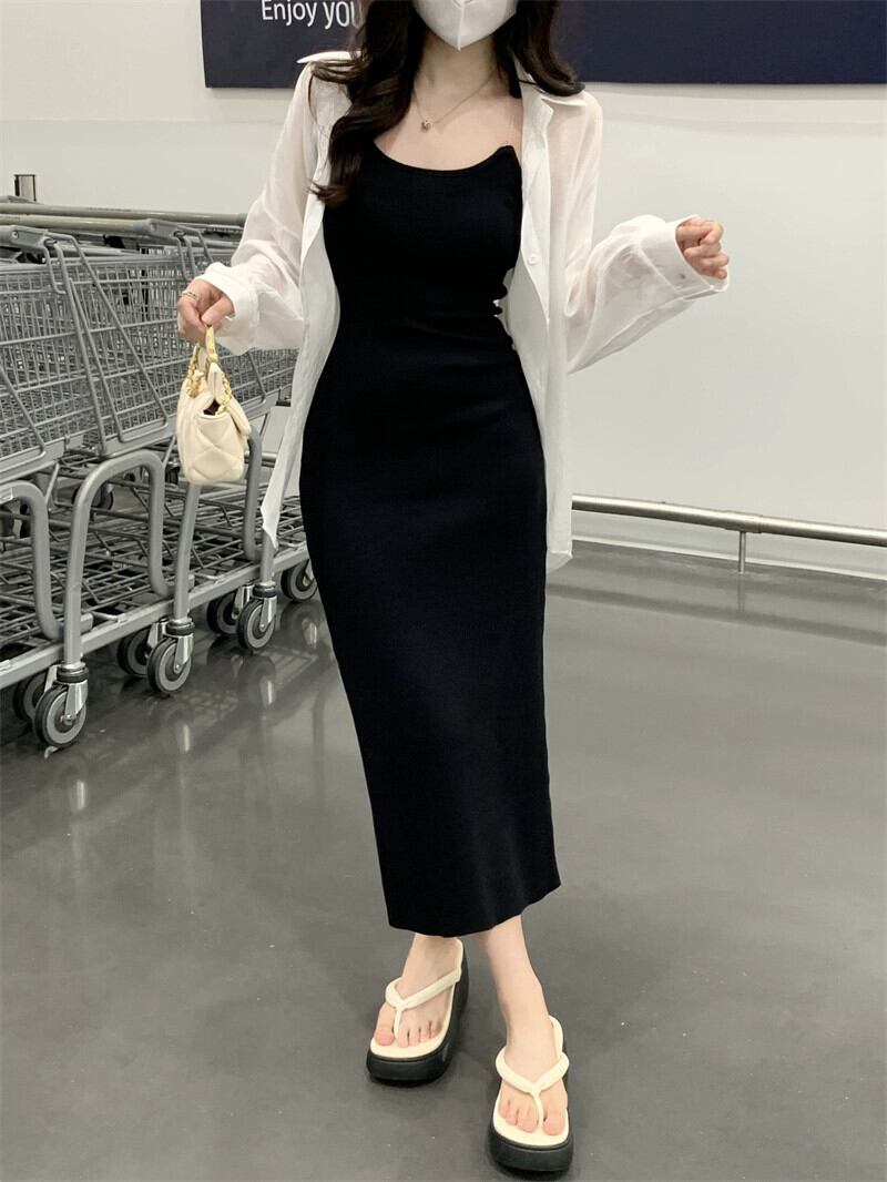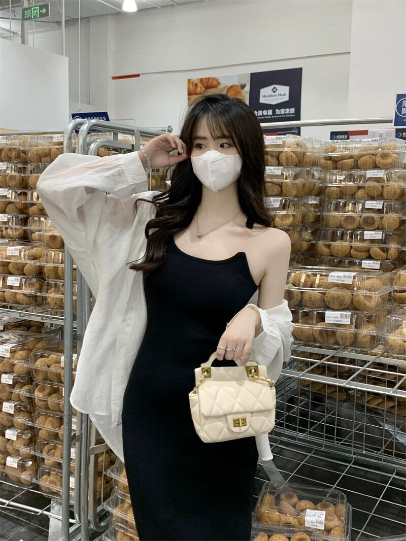 目に見えないショルダーストラップサスペンダードレスの女性の夏 2023 新しいニッチハイエンド黒底バッグヒップロングスカート ブラック サマー 夏物 8571698957121339