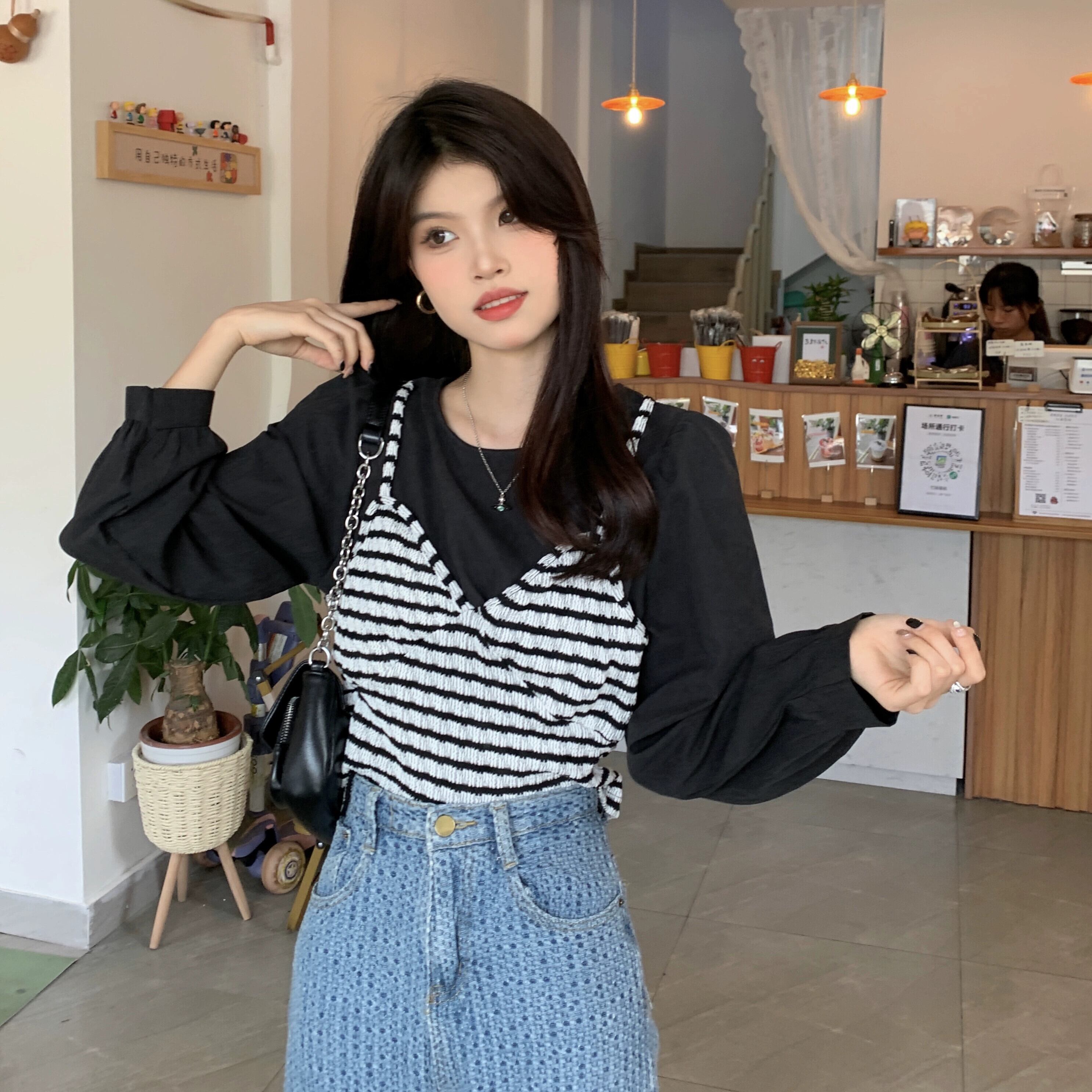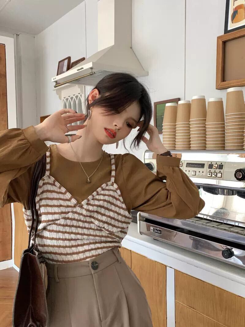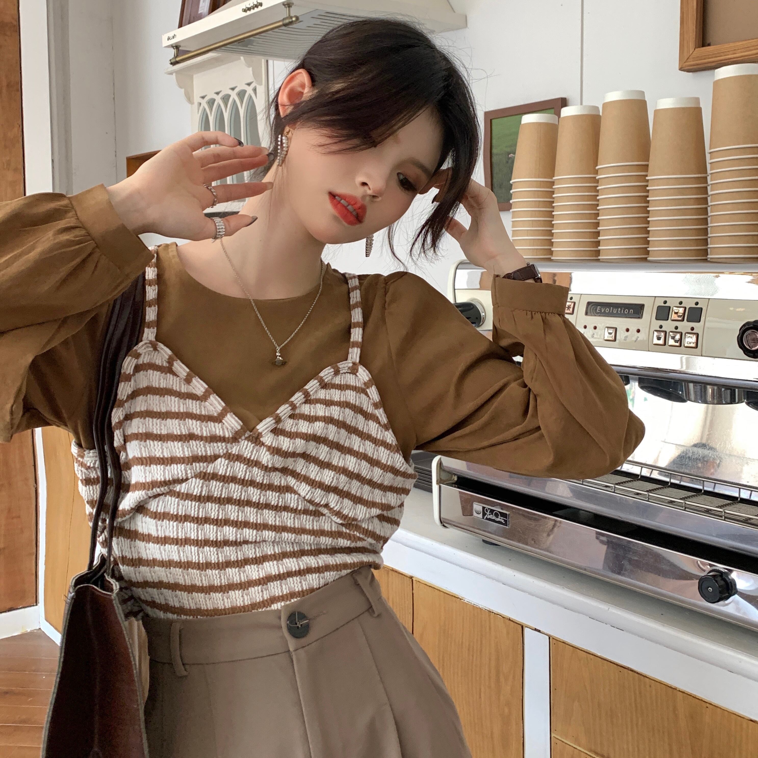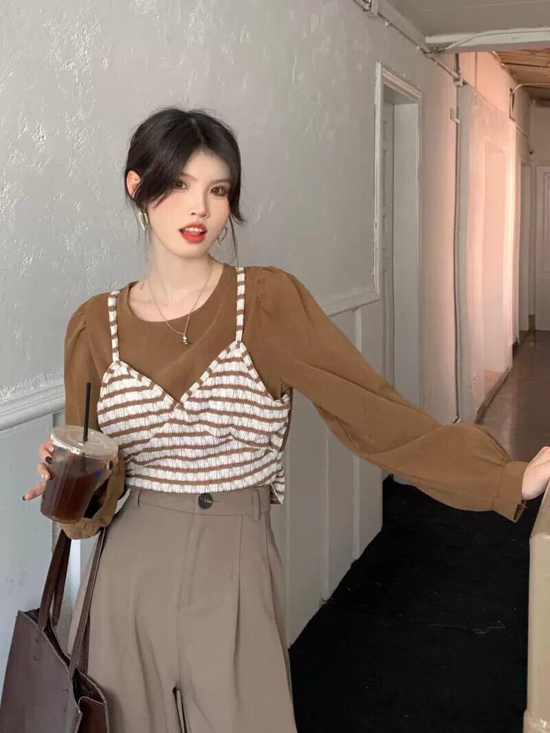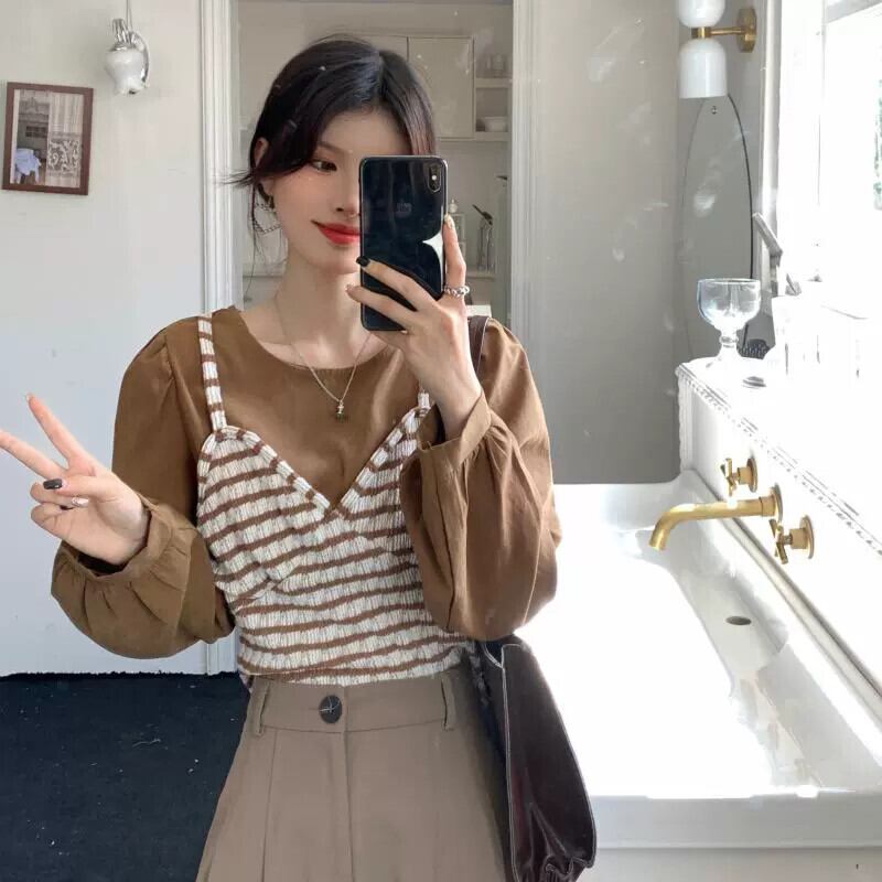パフスリーブフェイクツーピースショートトップ婦人服デザインセンスニッチ2023秋新作小さい長袖シャツ ロング オータム 秋物 8571668323388014